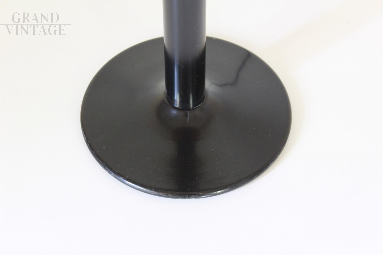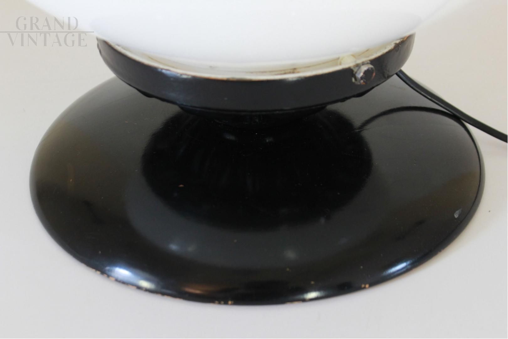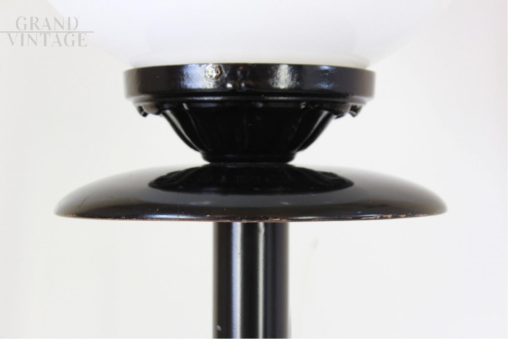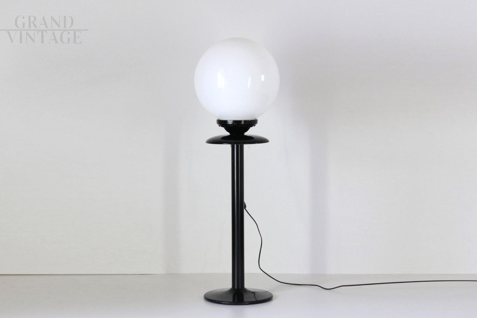 Vintage floor lamp from the 1970s, with white plastic lampshade and black iron and wood structure (the lampshade base is in wood). The article has been electrically serviced by a specialist and is in perfect working order. In good condition, with only small signs of aging.