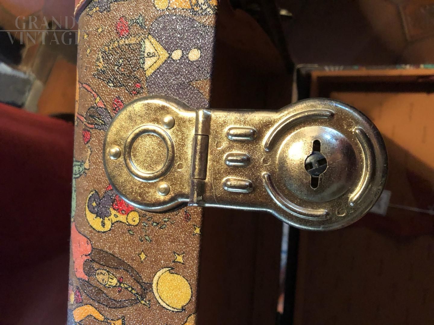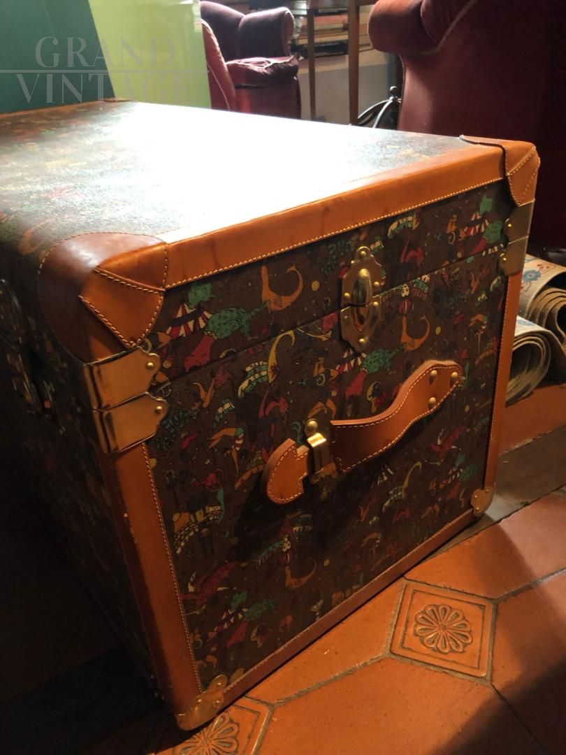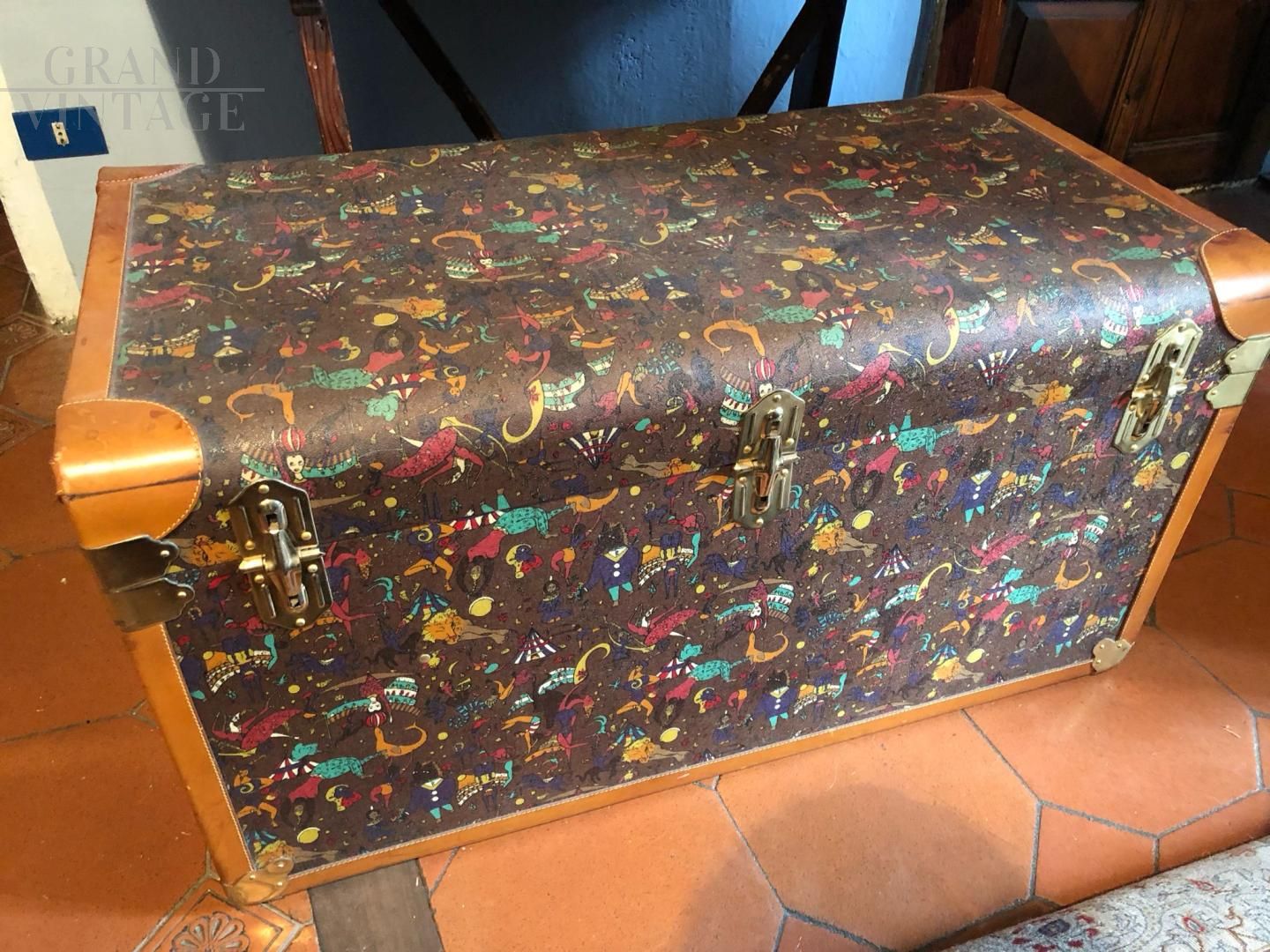 Vintage trunk designed by Piero Guidi in wood covered in leather printed with Magic Circus pattern, the corners are in leather and the side handles are in smooth leather. There is a removable shelf with ribbon straps, complete with lock but with key missing. The trunk is in excellent condition with bright colors, some signs of aging on the corners.