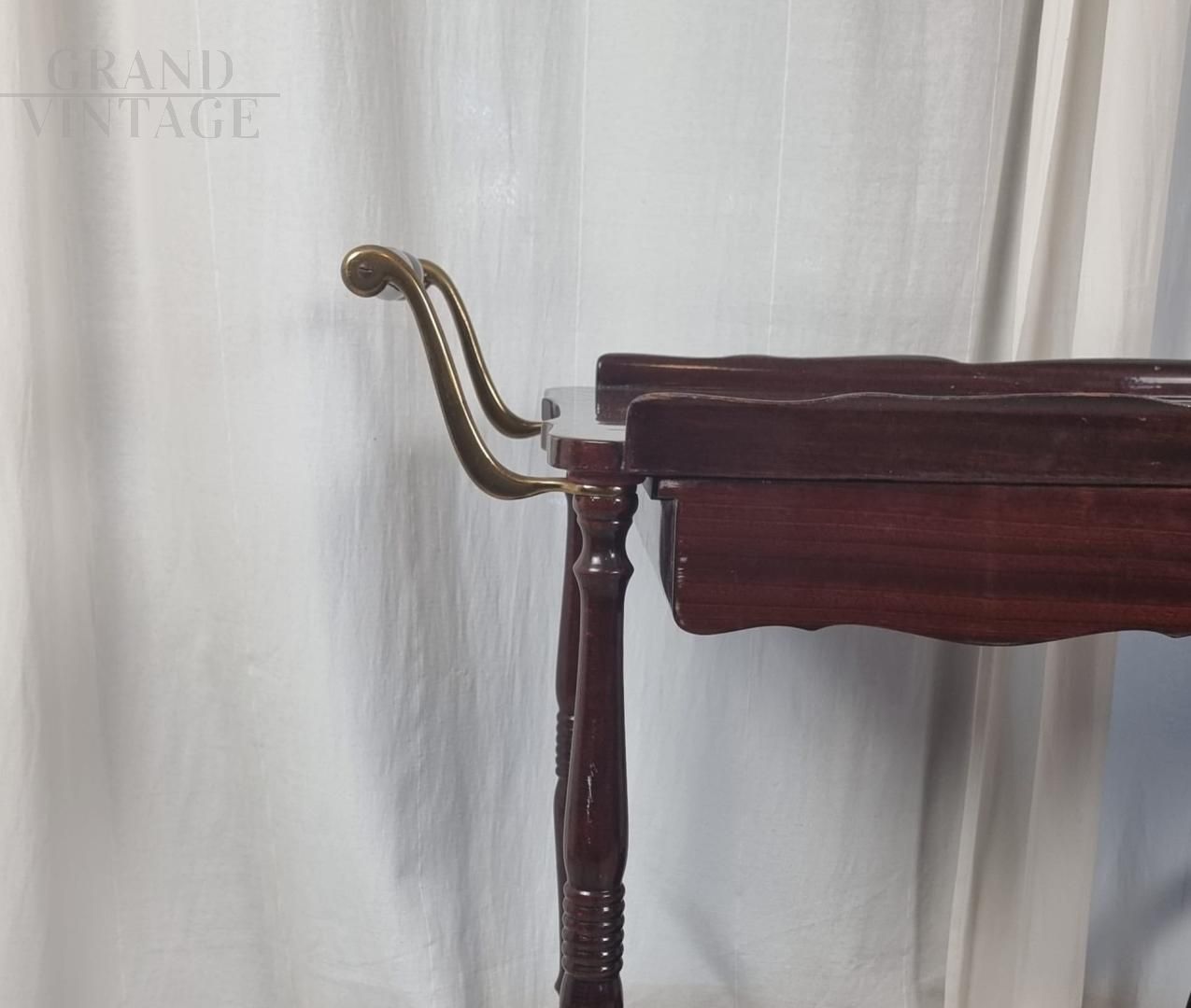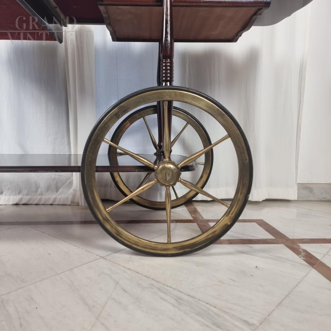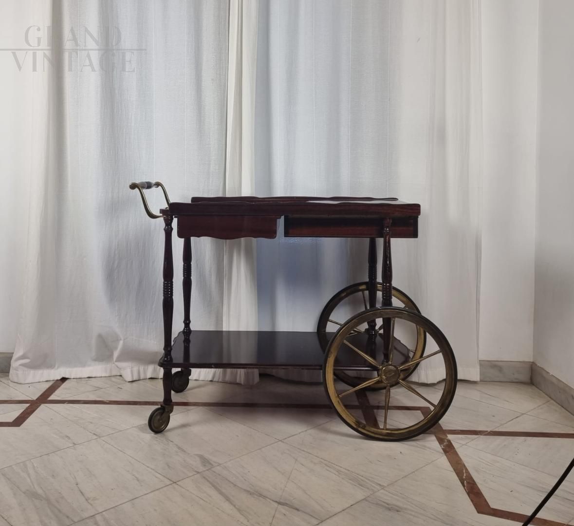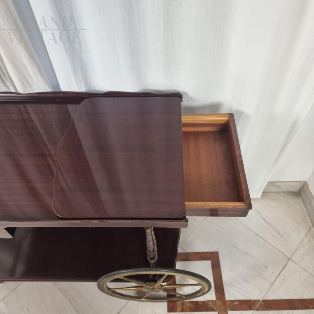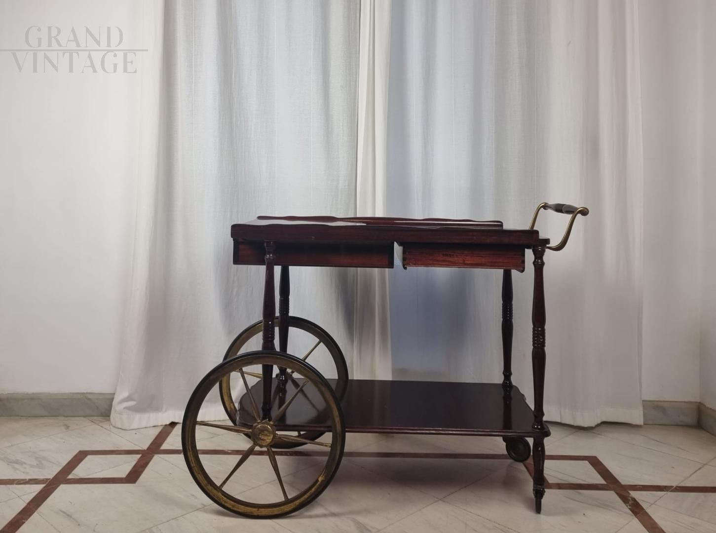 Beautiful 1950s bar trolley in mahogany and brass with extendable shelf and drawers.