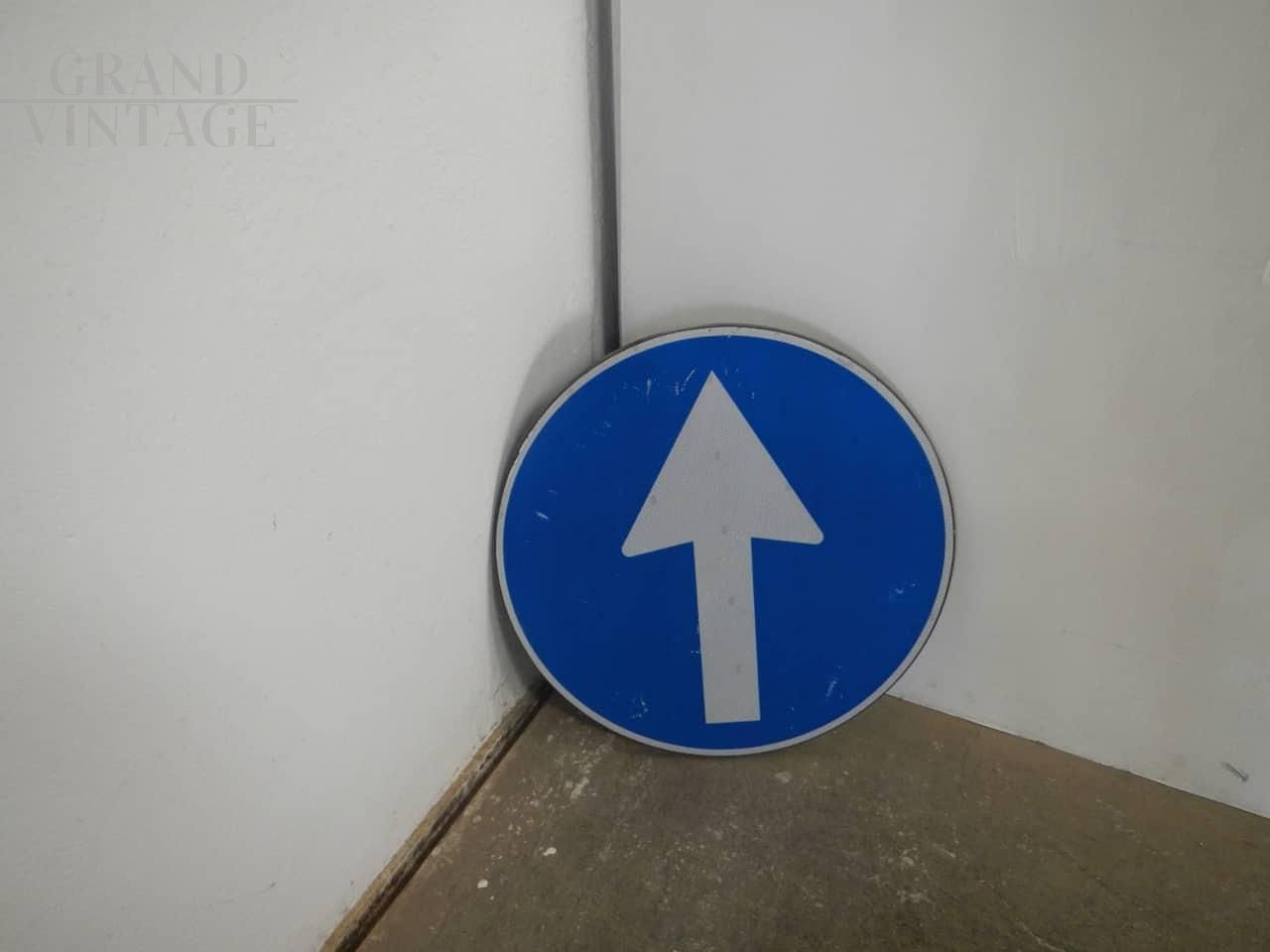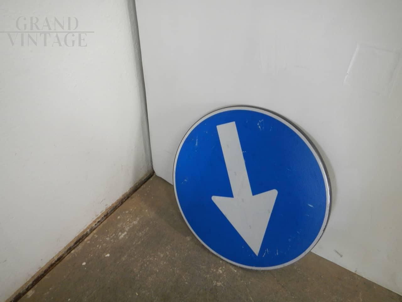 Vintage Italian road sign with mandatory direction directional arrow, 1990s. Good structure with evident signs of use, as shown in the photos. Can be used as a top for an original coffee table.