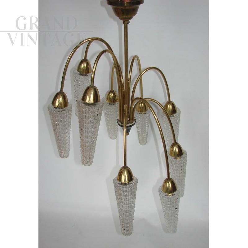 Vintage Mid century cascade chandelier, 1960s. Made of brass, glass lampshades. Preserved in a good condition, working. Requires 9 E14 bulbs.