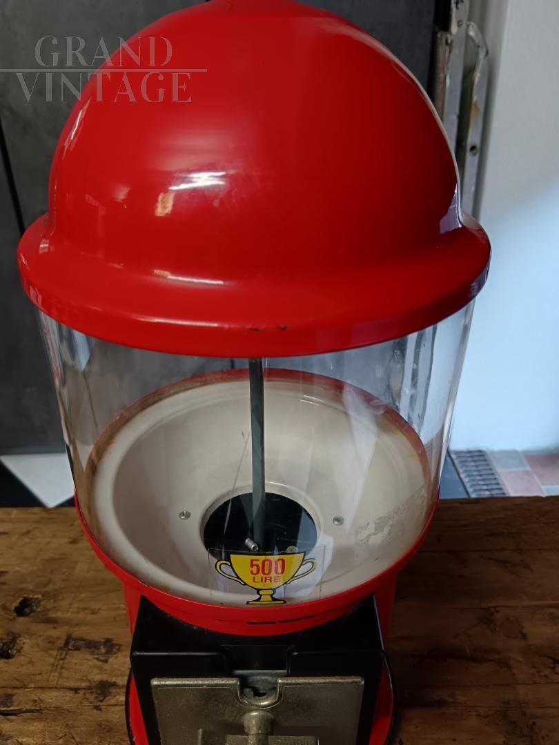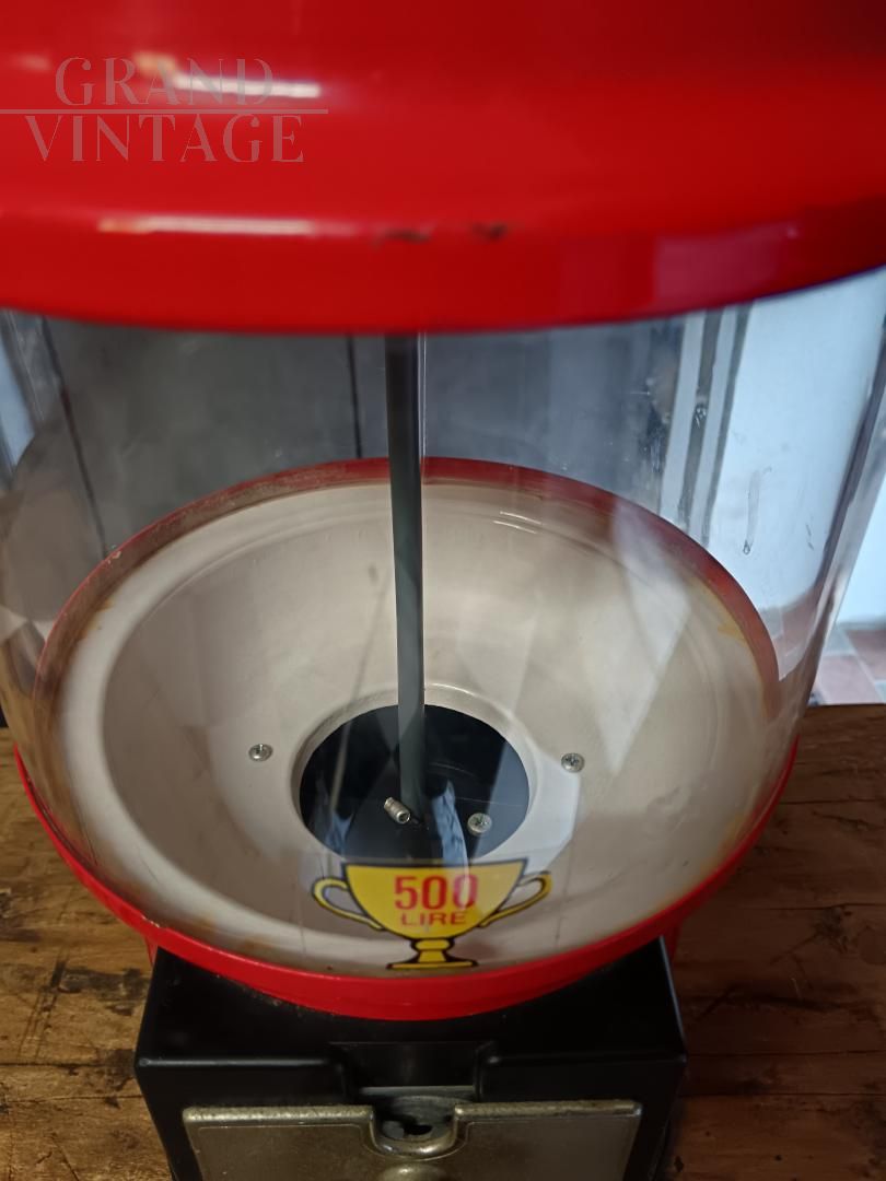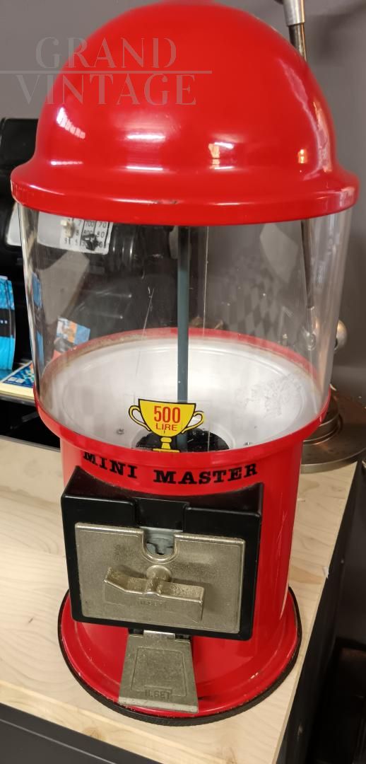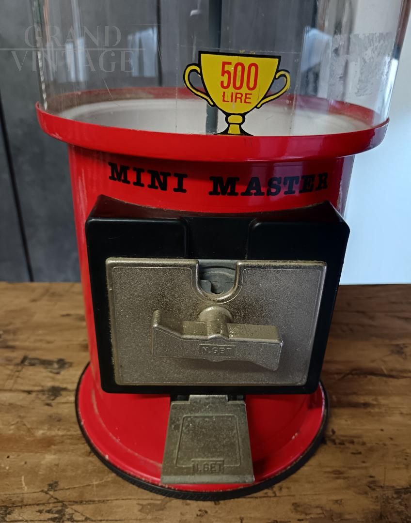 Magnificent vintage Mini Master countertop candy dispenser, Italy 1970s, in perfect condition and working order. The item also comes with 500 Italian lire coins to dispense the candy. The body is made of red metal, flawless, and the ball is made of polycarbonate plastic.
