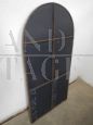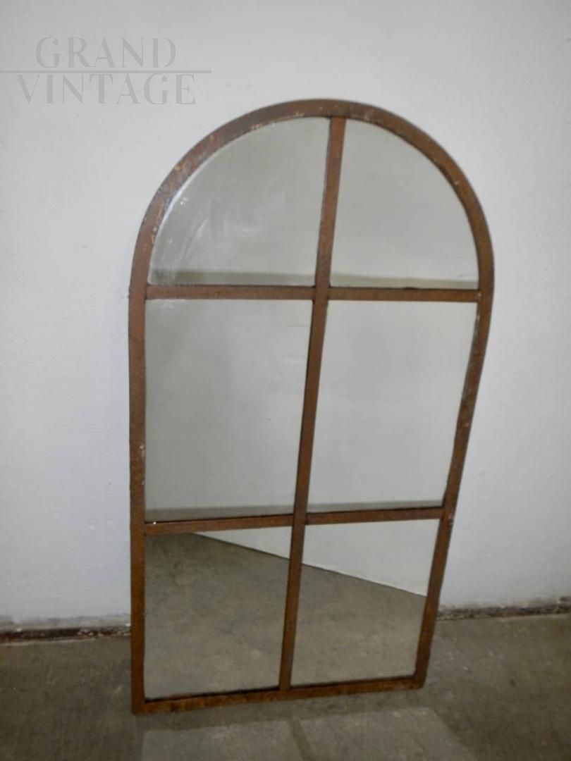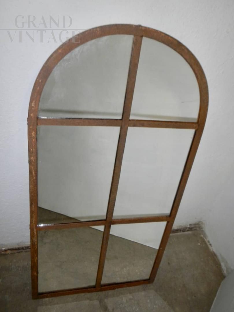 Vintage 1940s industrial style mirror with metal frame with rounded top, in patina.