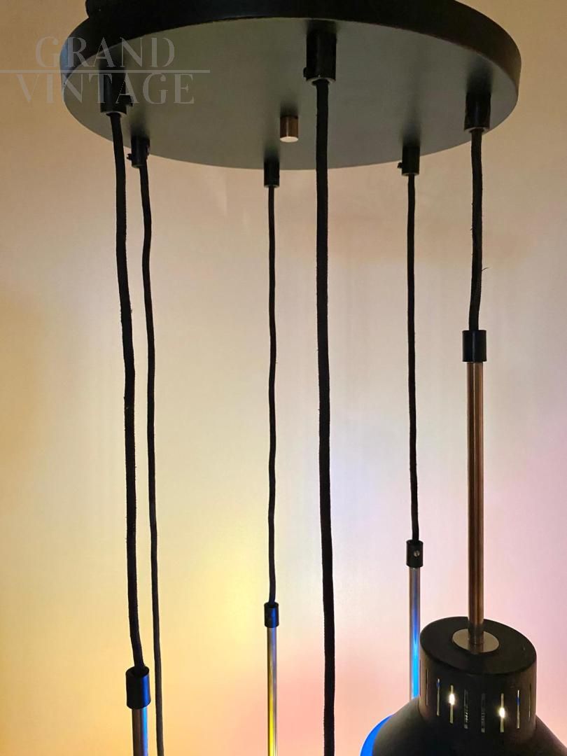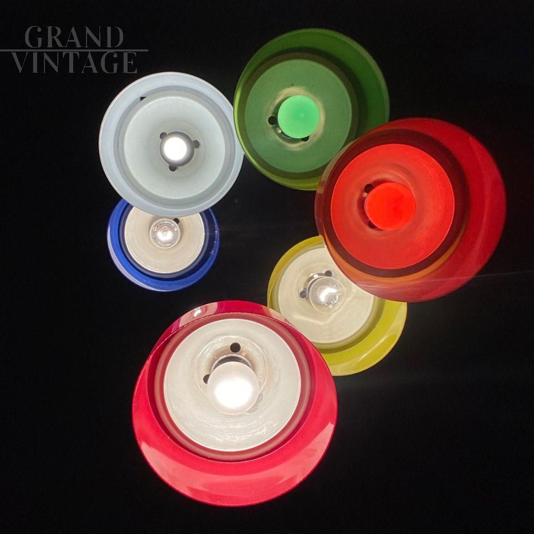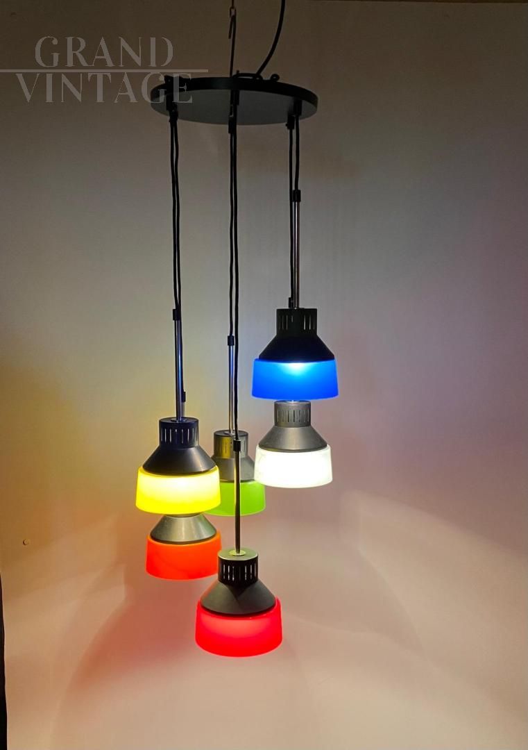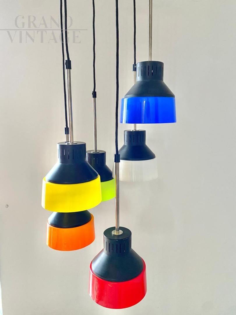 Vintage waterfall chandelier made in Italy in the 1960s with six light points made of iron with multicolored plastic lampshades. Height of the light points adjustable thanks to its cable system, according to needs. The iron parts have been polished and repainted. The electrical parts have been overhauled and are in perfect working order. Few signs of aging and a micro crack on one of the lampshades (please look at the photo), not visible once the chandelier is hung from the ceiling.