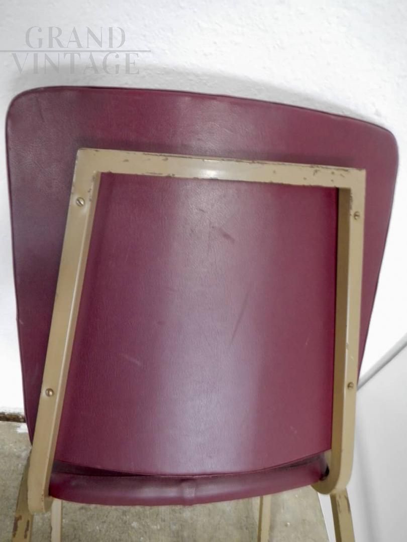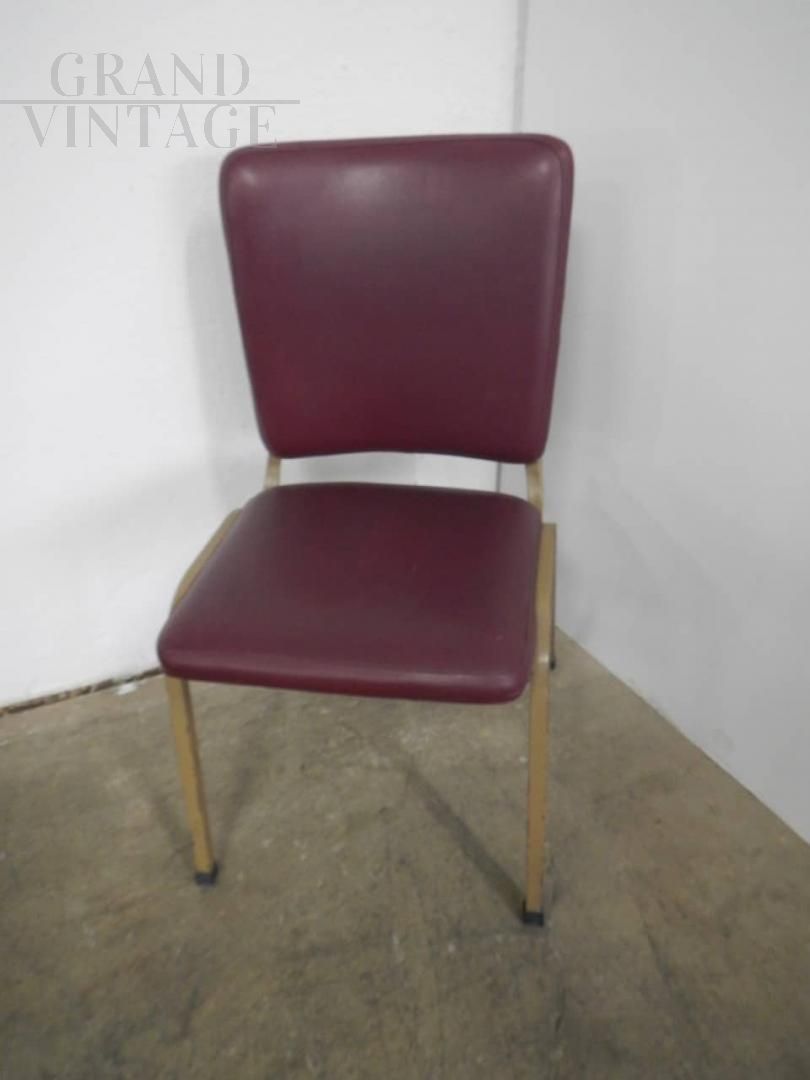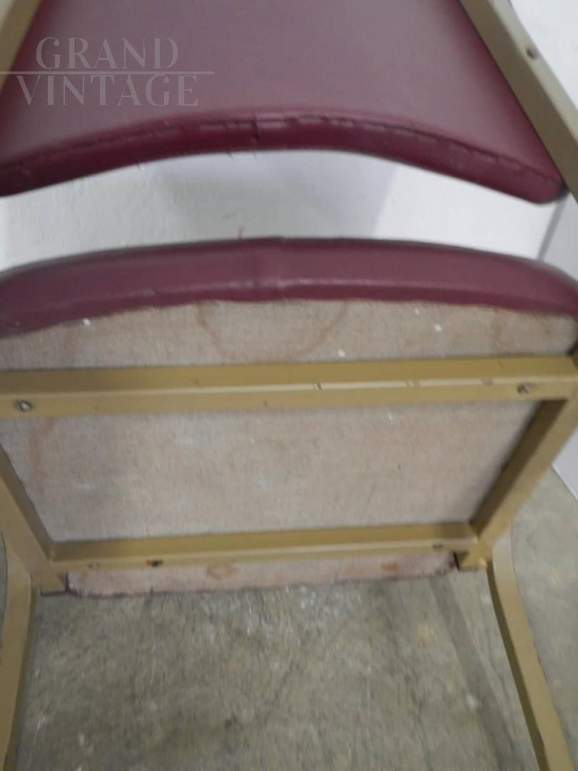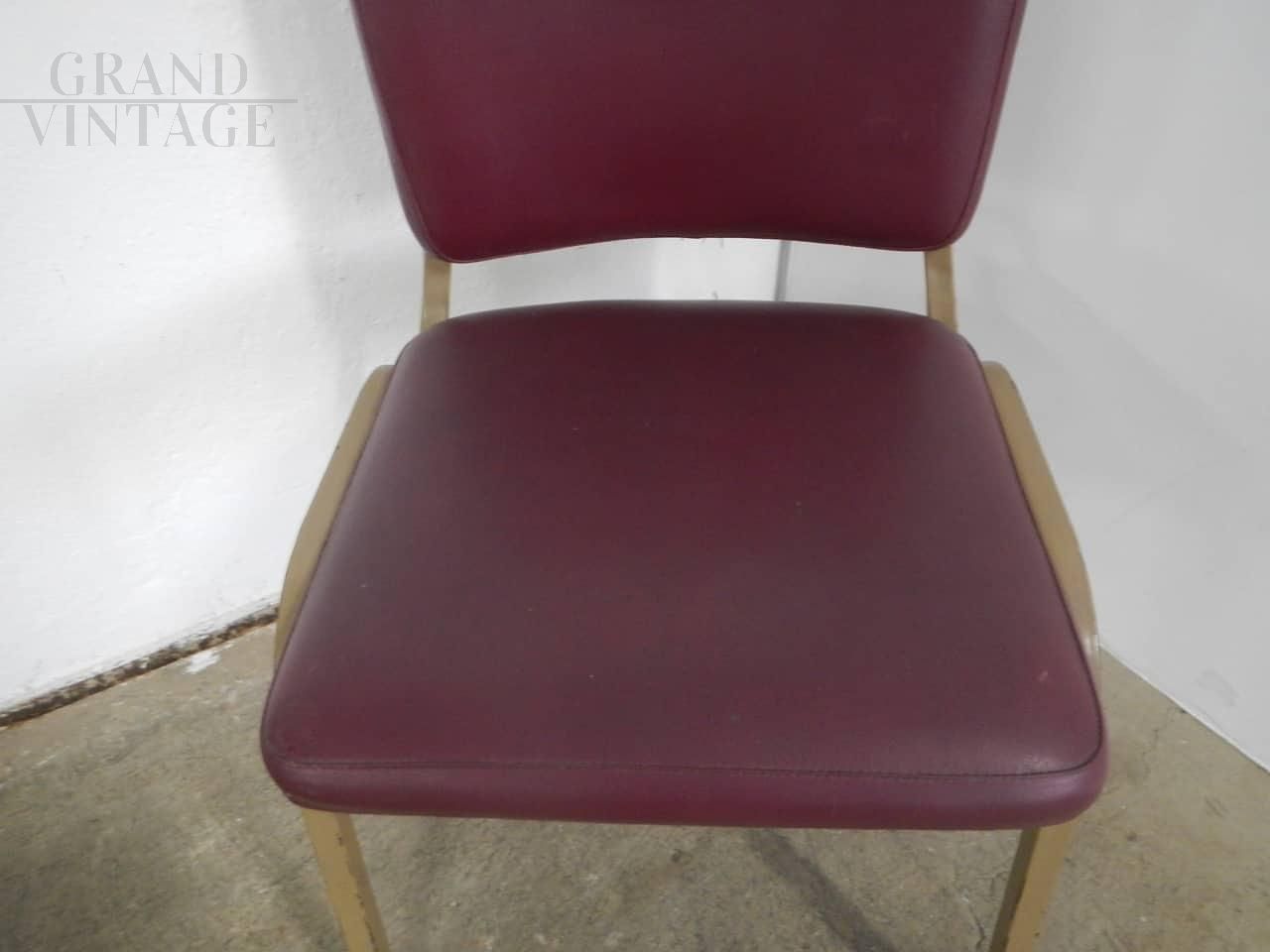 Vintage 70s office chair with upholstered seat and backrest covered in burgundy imitation leather, the structure is in sand-colored lacquered metal.