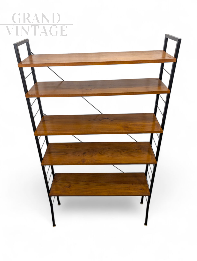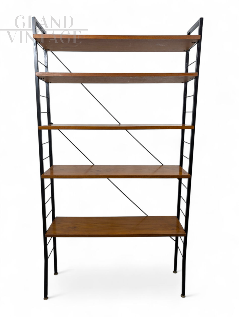 Vintage Swedish open bookcase with 5 shelves in teak wood and with black lacquered iron upright structure, 1960s. Excellent condition, light signs of aging.