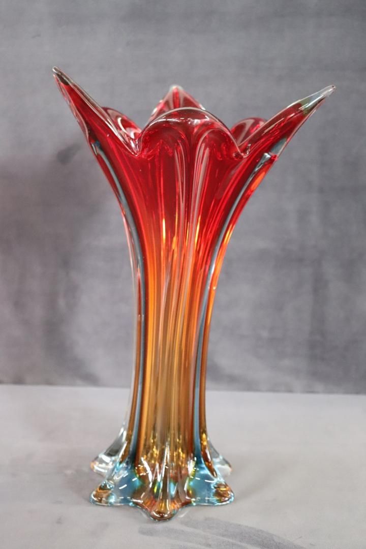 Refined Italian vase in Murano artistic glass, circa 1960s. This vase develops in height and is characterized by an elegant and refined line. High artistic quality Italian production of Murano. The vase is made with a technique that allows you to obtain this unique shaded color effect that starts from orange in the lower part and fades into bright red in the upper part. The beautiful color combination used creates a flame effect. The outside is ribbed. Its particular shape is unique, slender upwards where it opens like petals. Vase of great refinement, in person it makes its beauty even more.