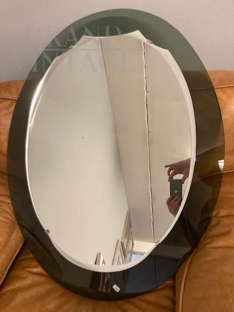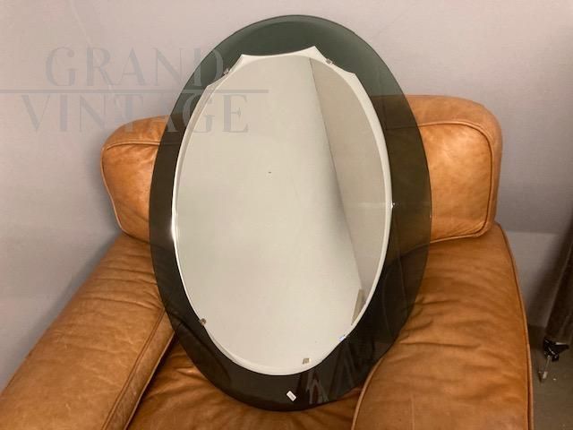 Mid-century oval mirror with green smoked glass bottom and raised mirrored part with a wavy shape, original Italian production from the 1960s, in perfect condition.