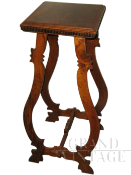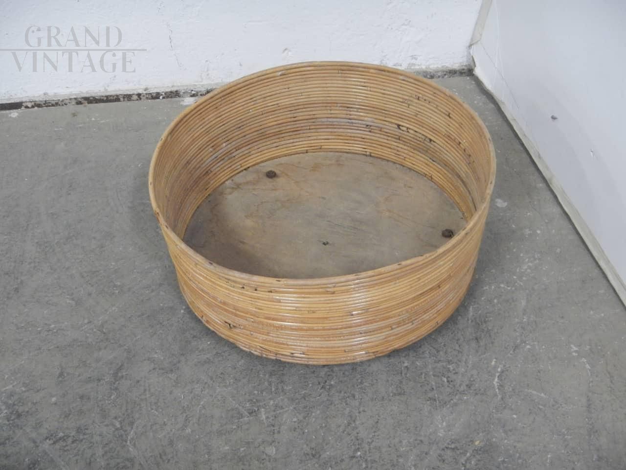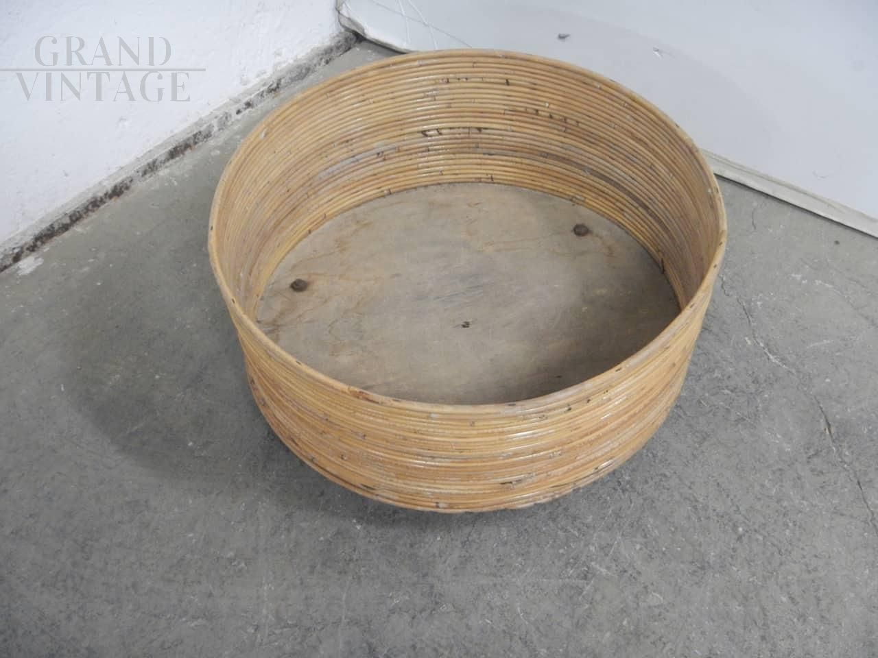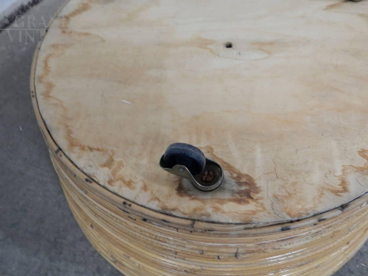 Vintage round plant stand in rattan and plywood, with 3 original wheels for easy movement. In good condition, it shows the natural signs of use.