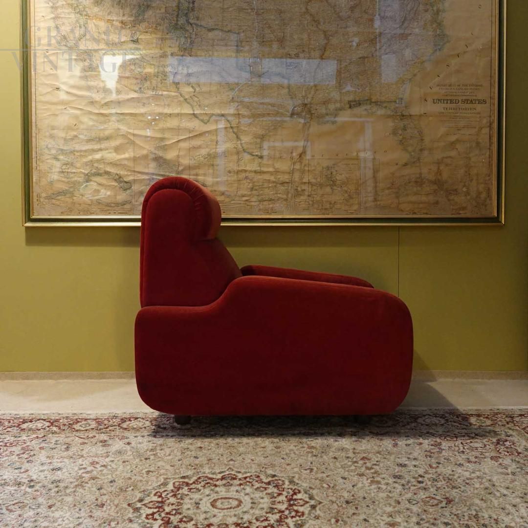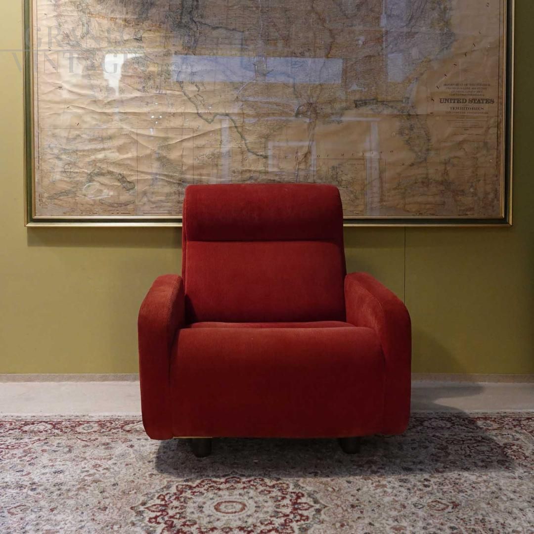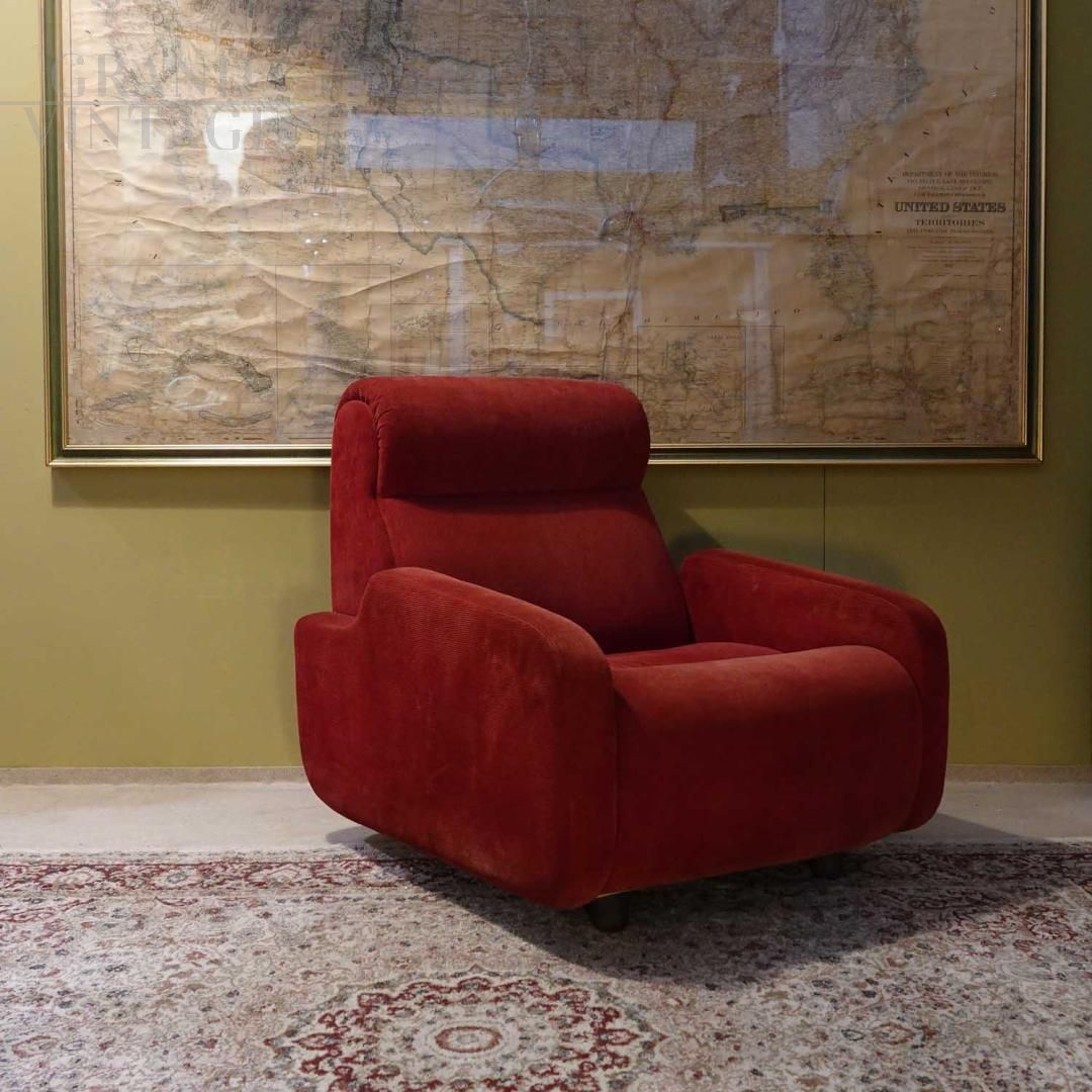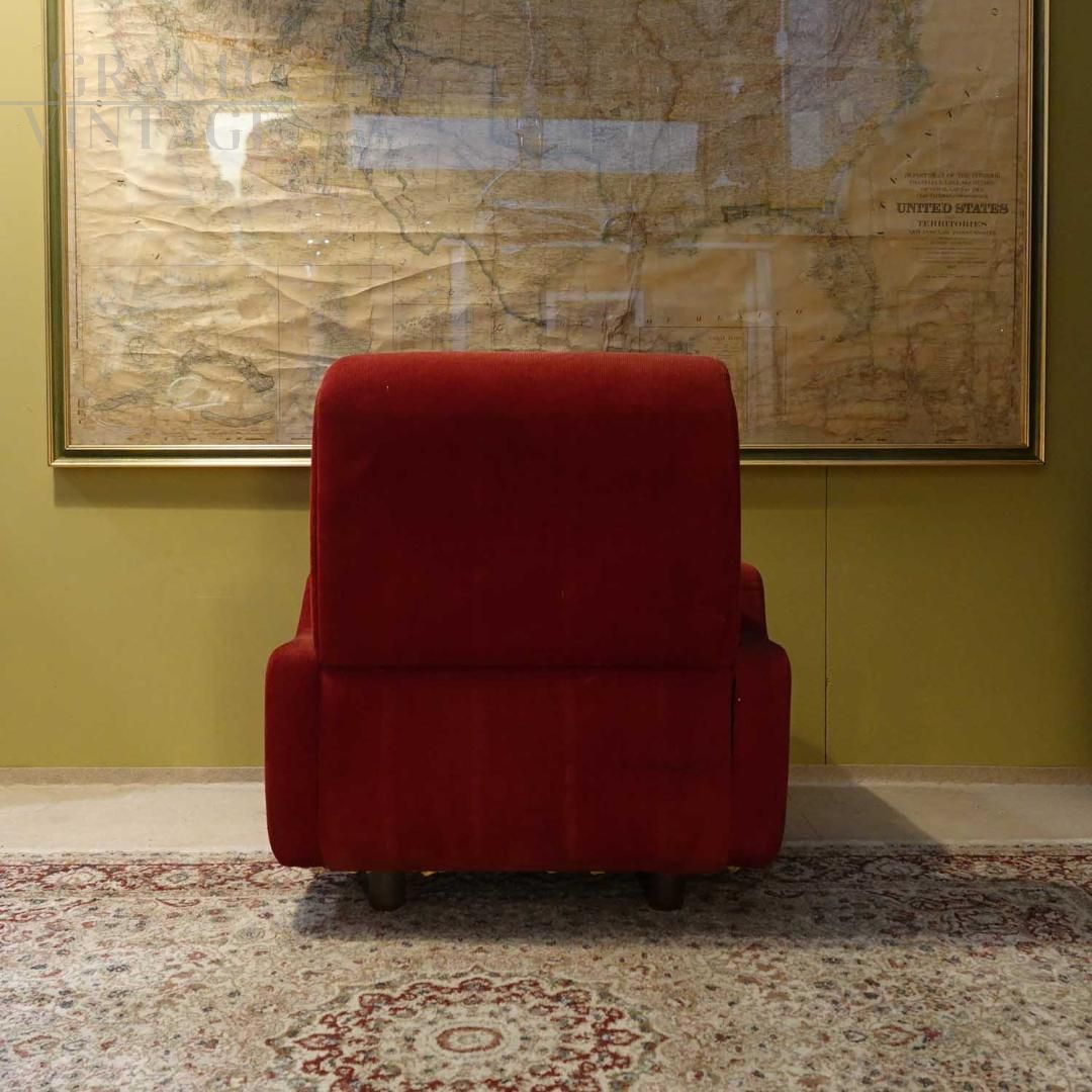 Vintage armchair in original red fabric from the 70s, featuring typical upholstery of the time: corduroy, geometric patterns or bright colors that immediately catch the eye. An authentic piece that gives energy, style and an unmistakable vintage touch to any environment.