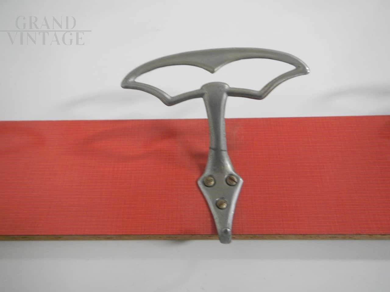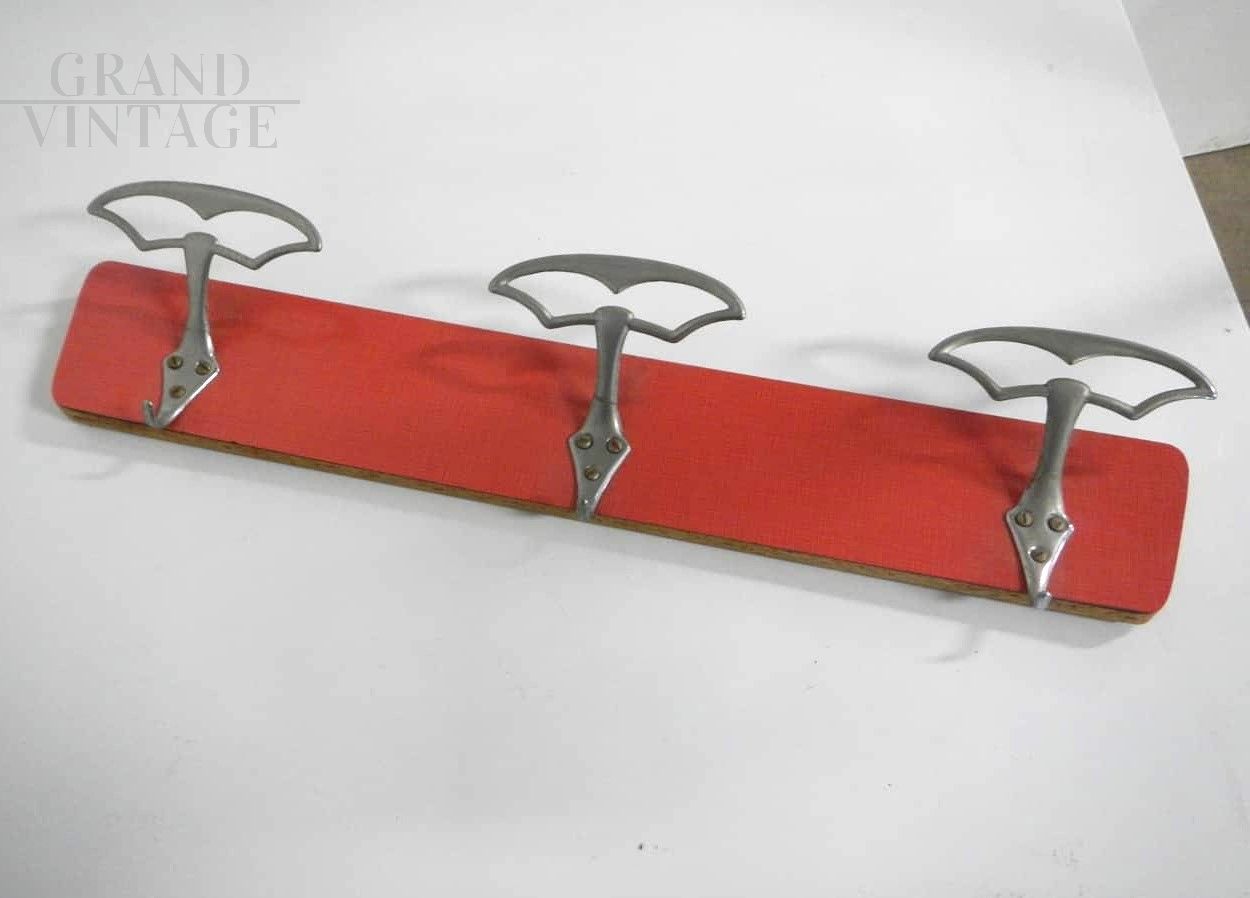 Vintage 1970s wall coat rack with compressed wood and red formica structure and 3 metal hooks, in good condition.