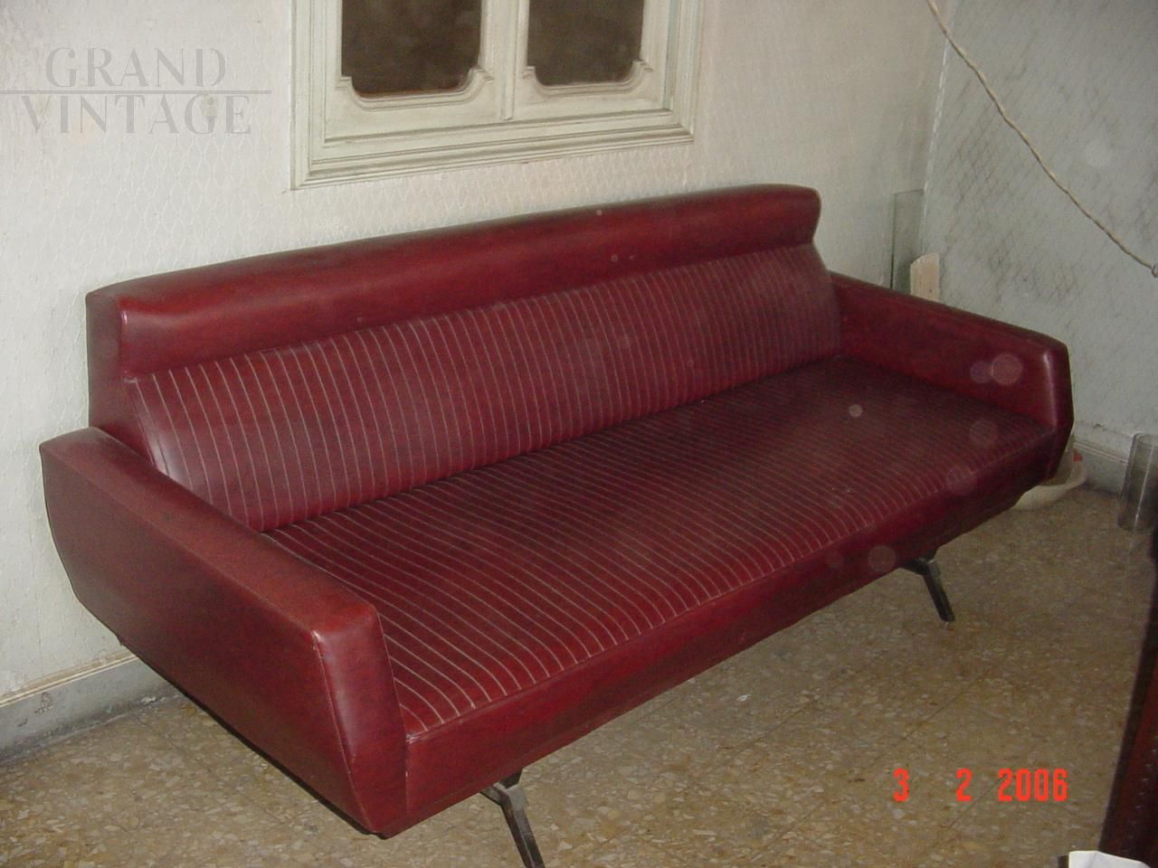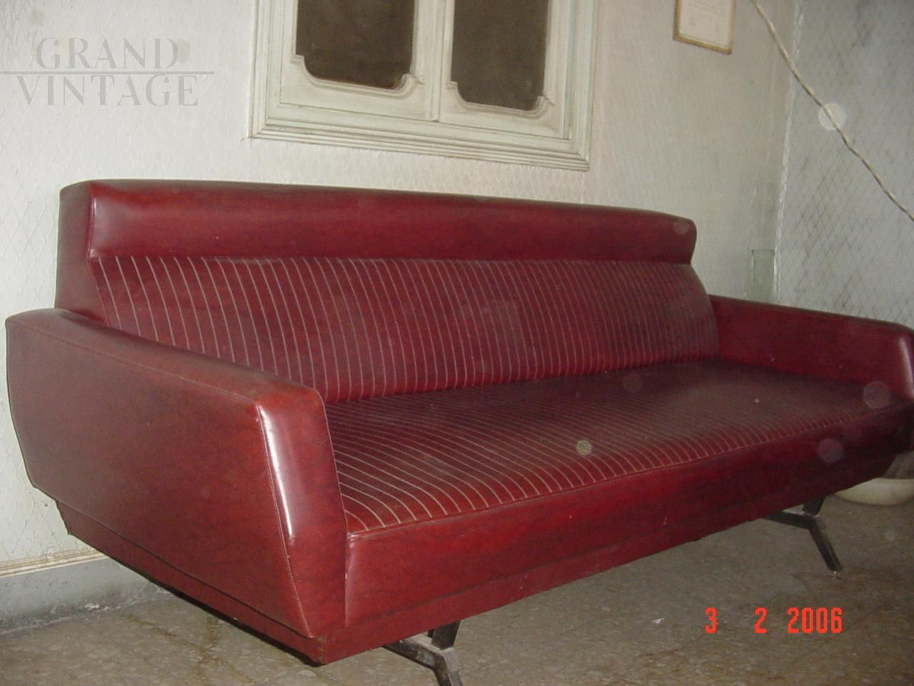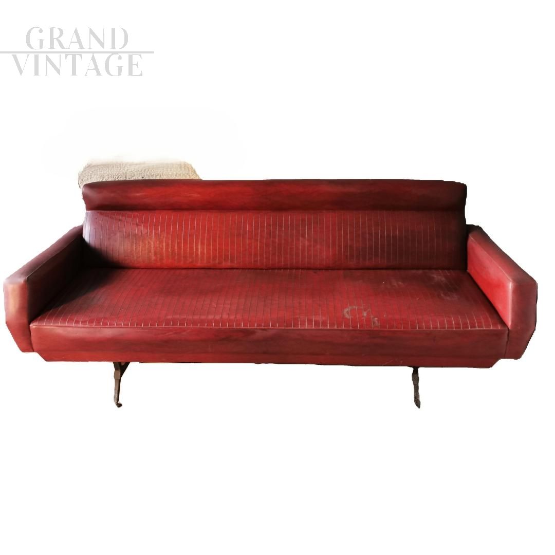 Vintage 50s three-seater sofa in real red leather, well-kept, suitable for an industrial style, to furnish shops, cocktail bars, original and trendy places, lofts...