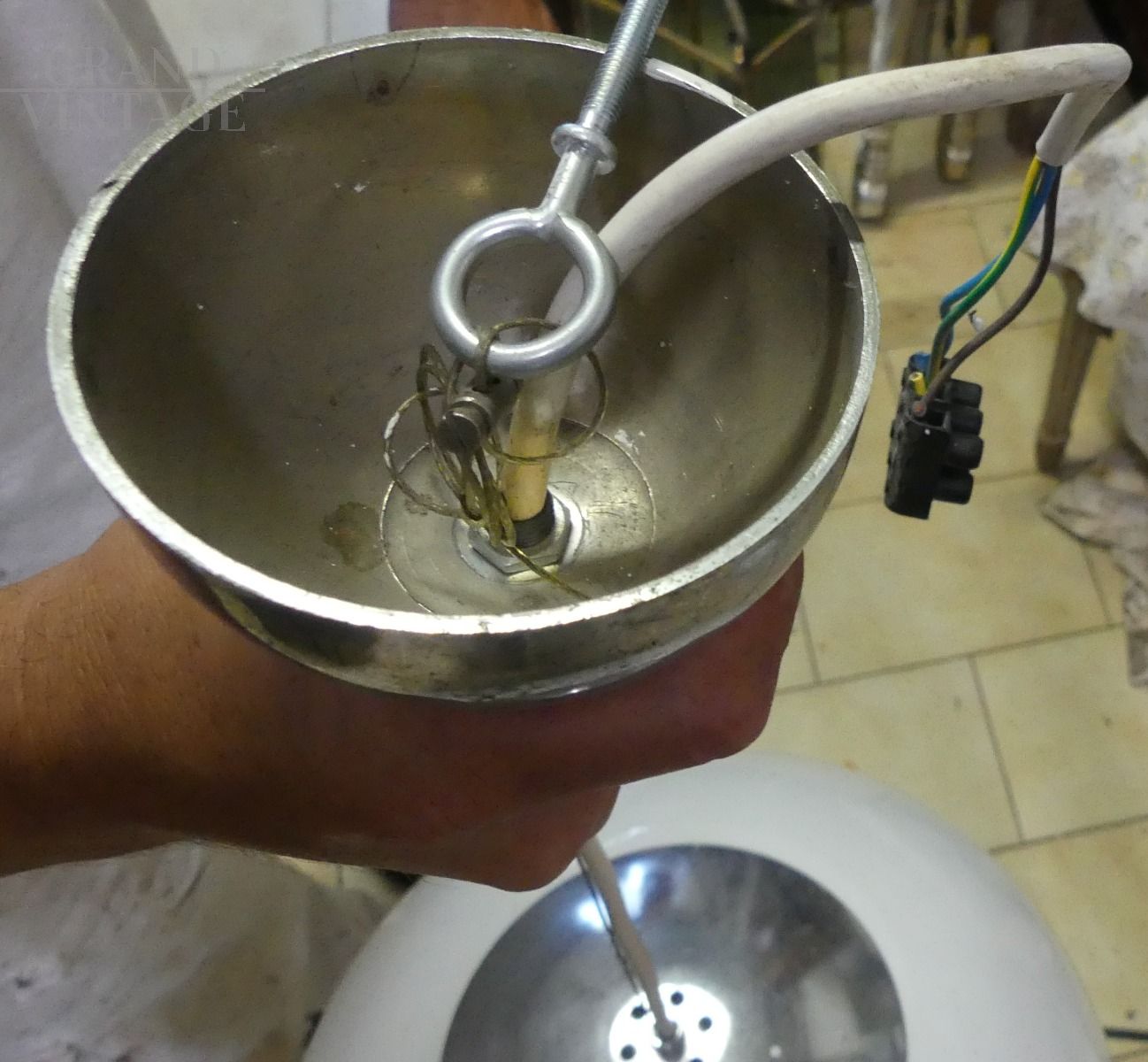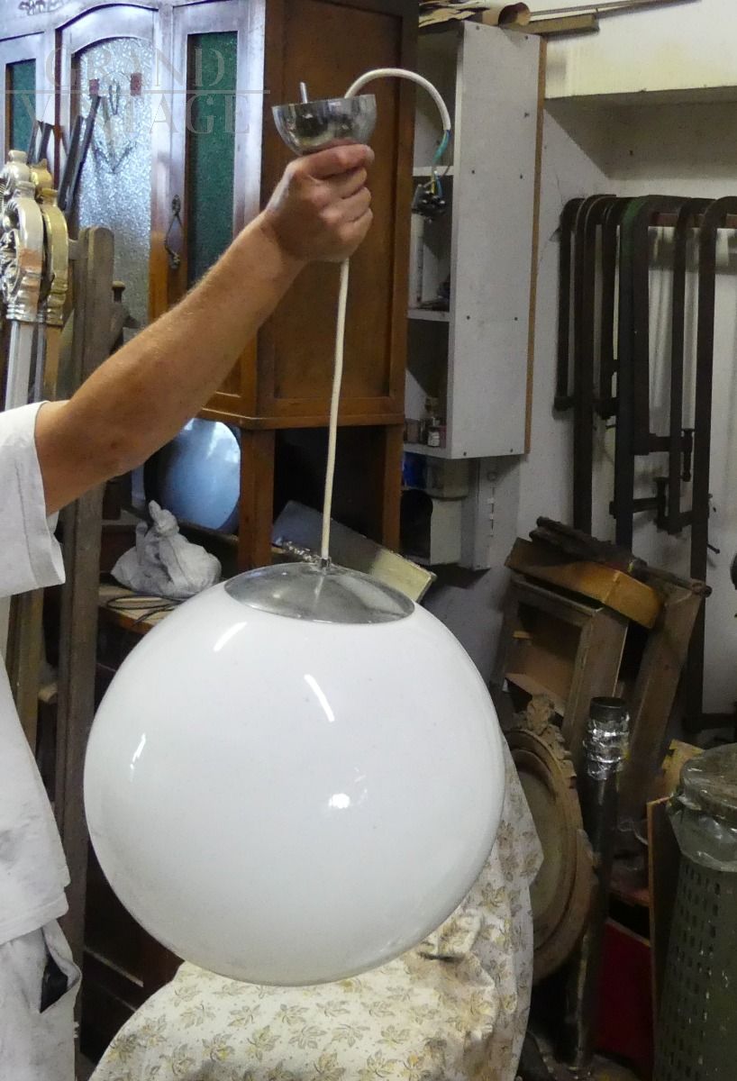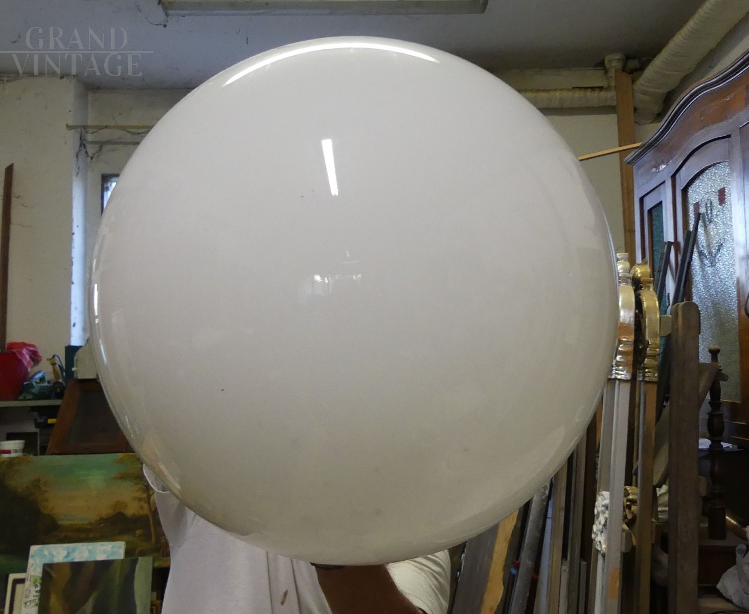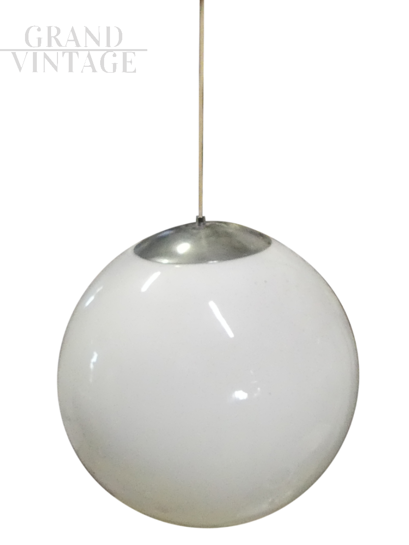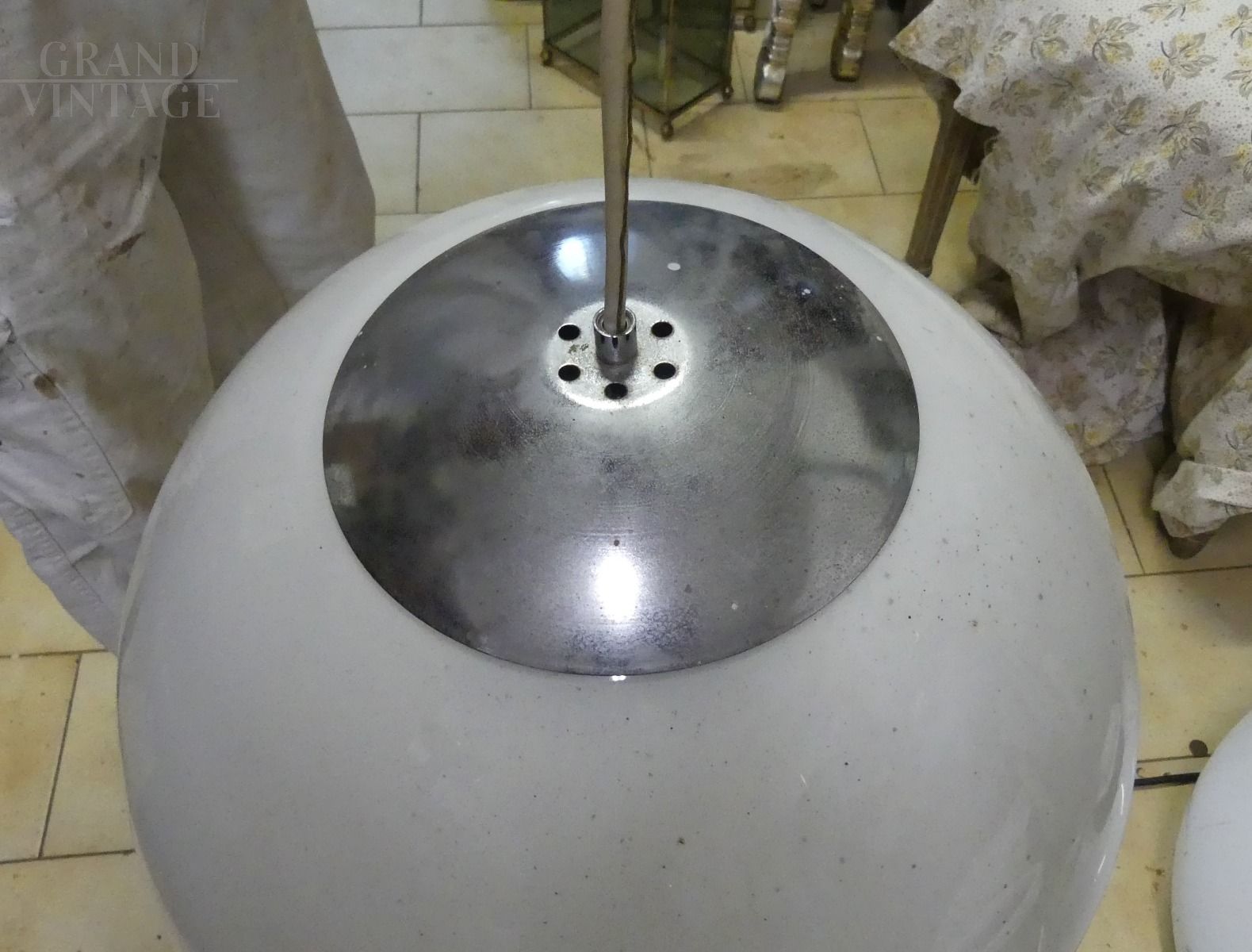 Vintage pendant lamps in white glass, with a sphere shape that recalls the Reggiani style, 1970s.