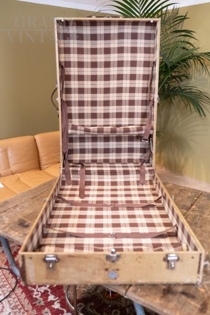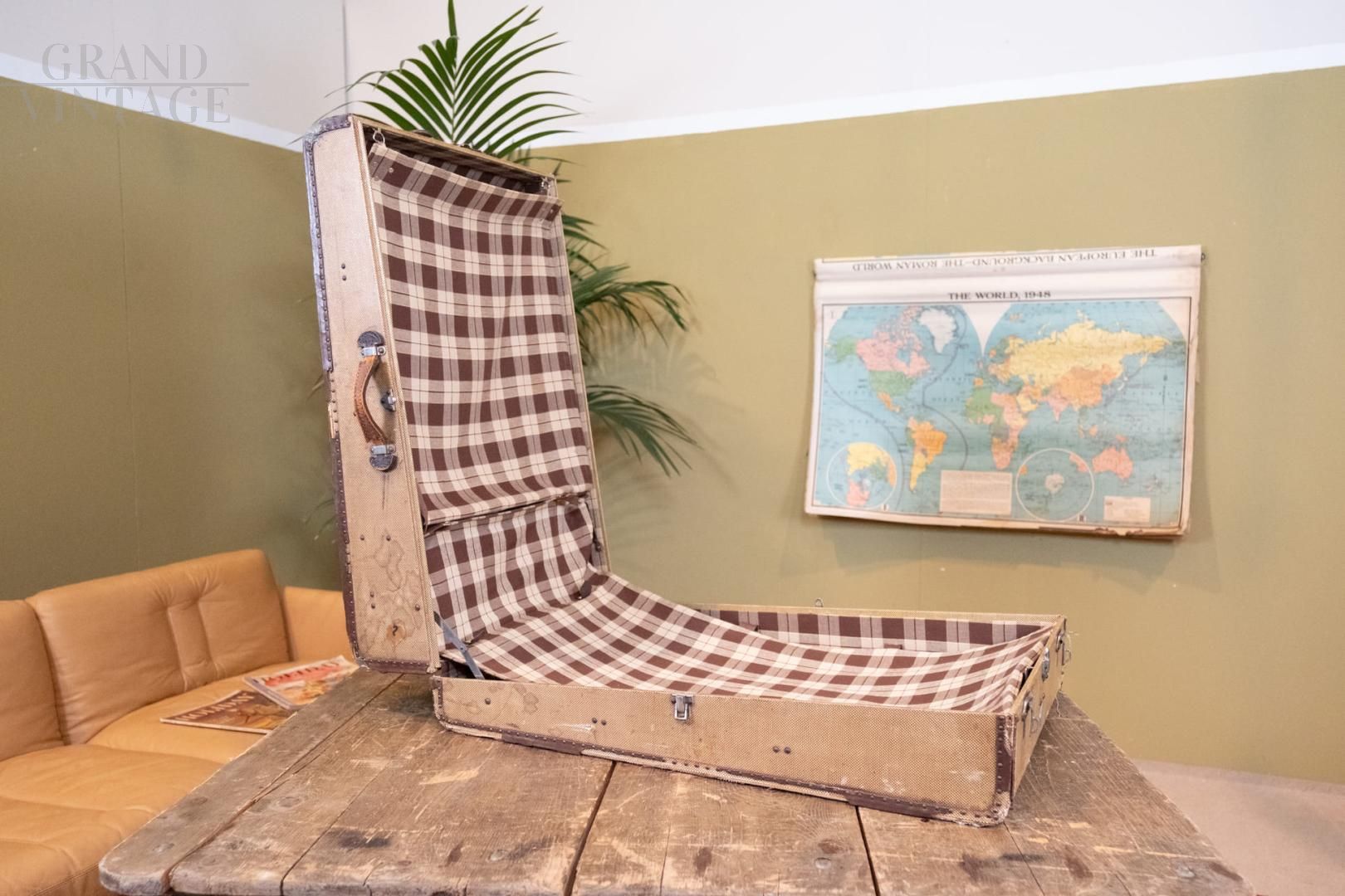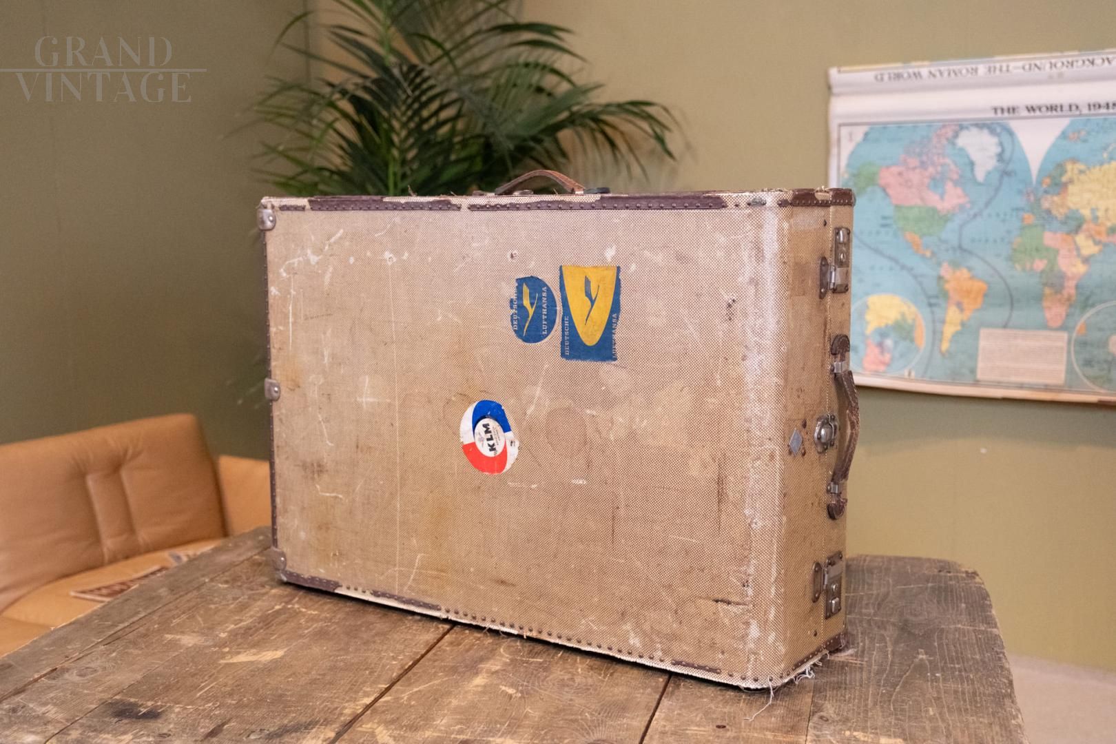 Vintage hard suitcase covered in beige fabric with leather details, travel stickers and riveted finishes, ideal for travel enthusiasts and collectors of unique and characteristic pieces.