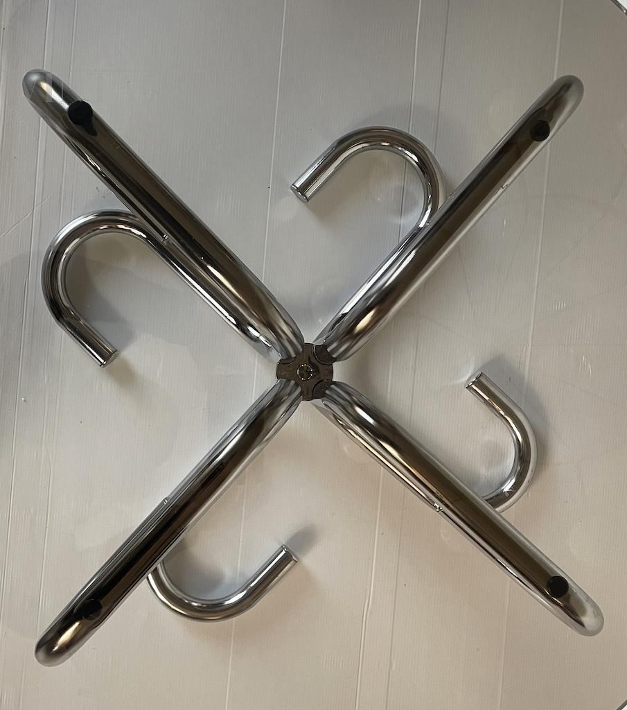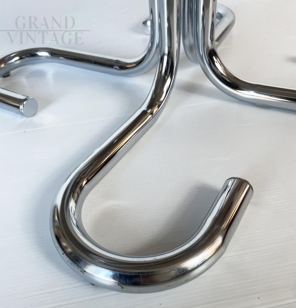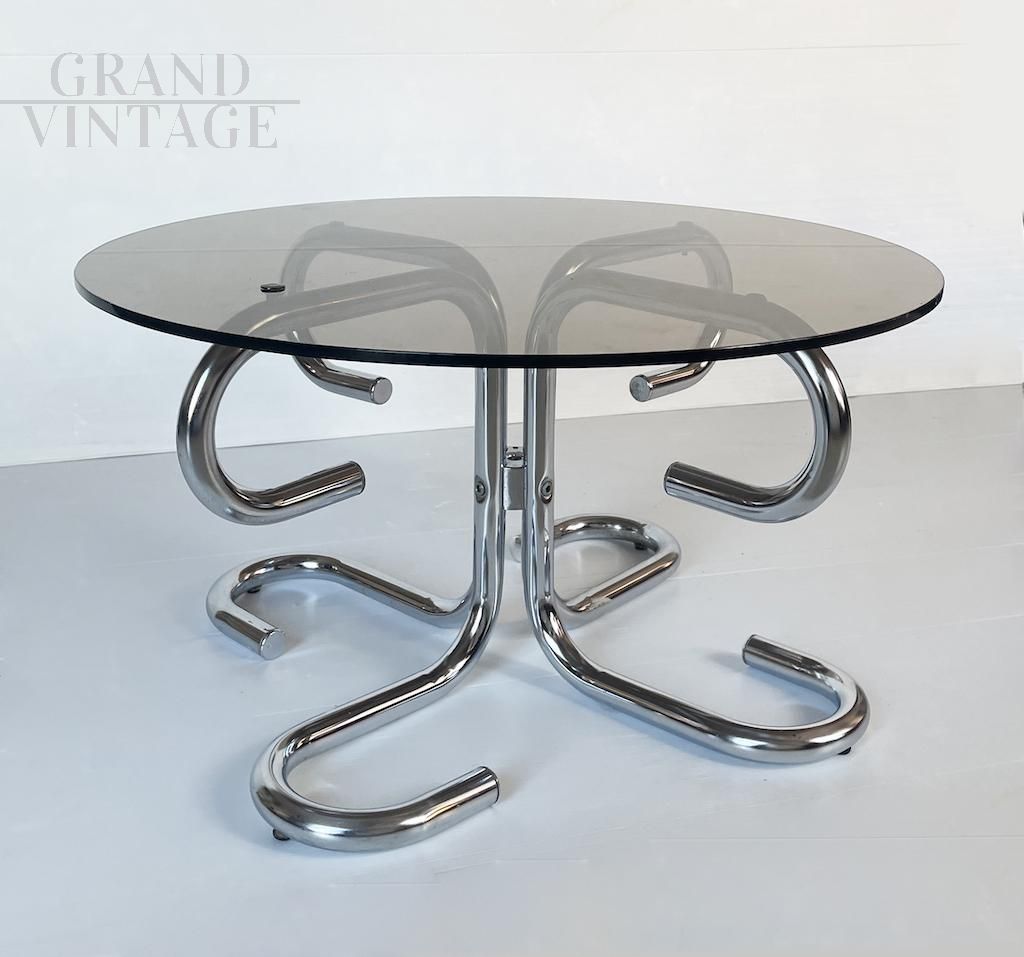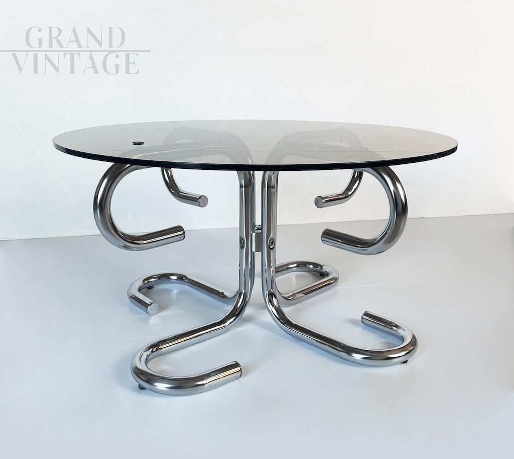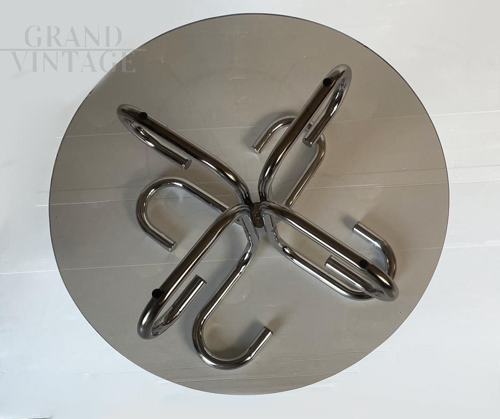 Elegant 1970s round coffee table with a particular space age design structure in tubular steel and smoked glass top. There is a small rubber button on the shelf for fixing.