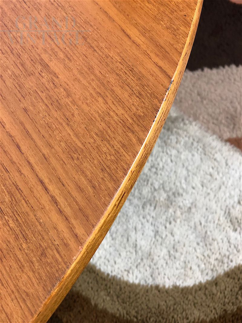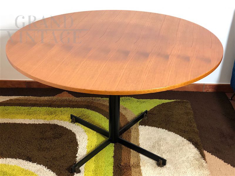 Vintage 60s table Made in Italy, an iconic piece of quality design, characterized by essential lines and selected materials. The top is circular and made of wood with a splendid teak veneer, which gives elegance and warmth to the environment. The black metal structure gives the table a modern and minimalist look, while the four-spoke base guarantees stability and lightness. A distinctive element of this table are the brass feet, embellished with a unique decorative motif that adds a touch of sophisticated elegance. In perfect condition! Measurements: Height 74 cm - Top diameter 120 cm.