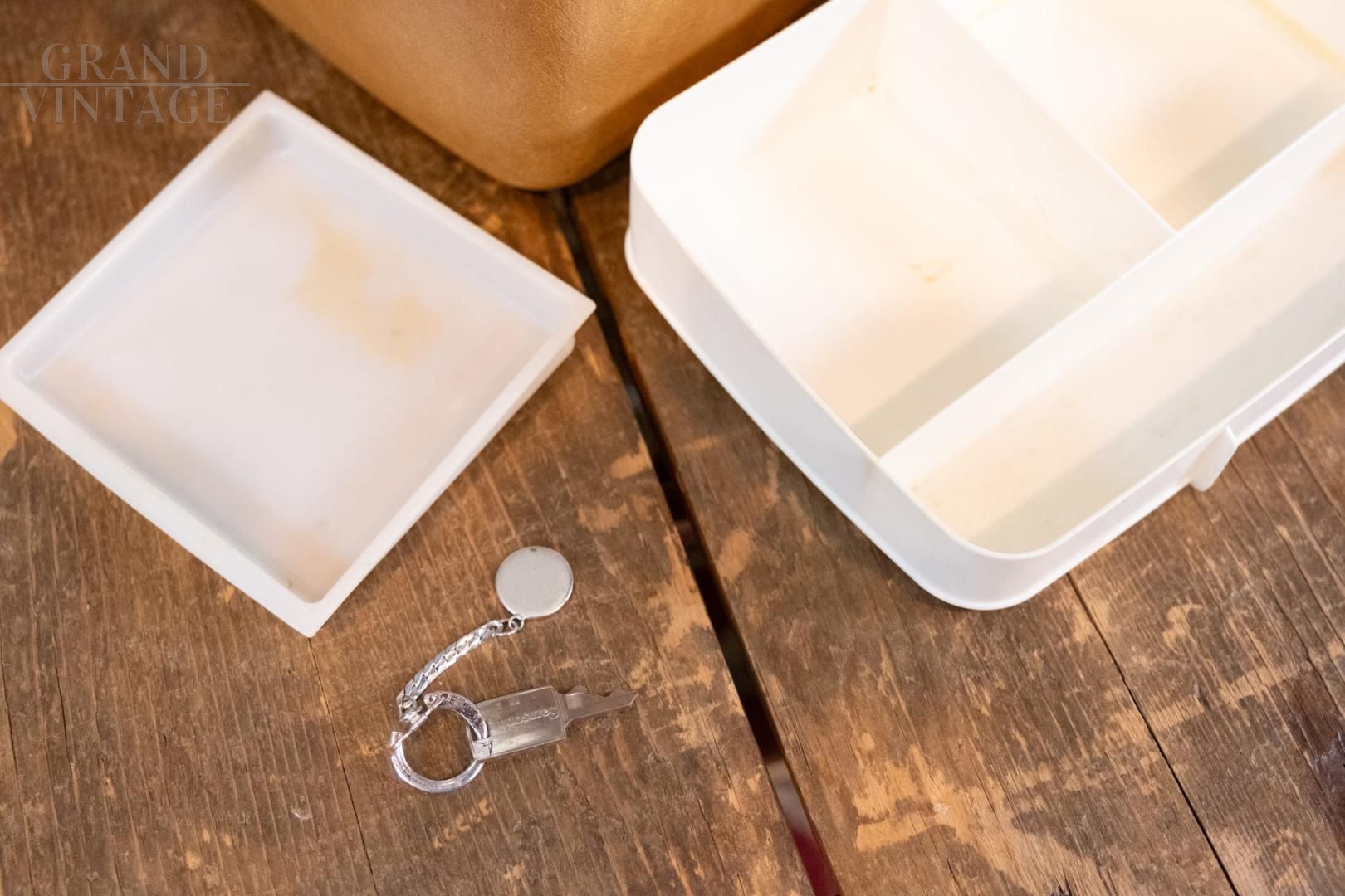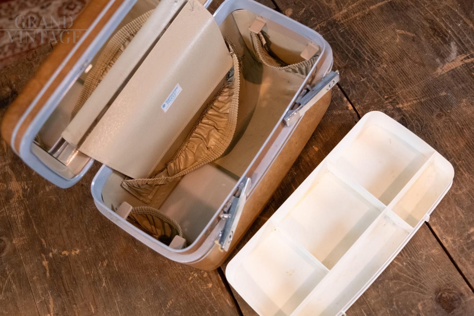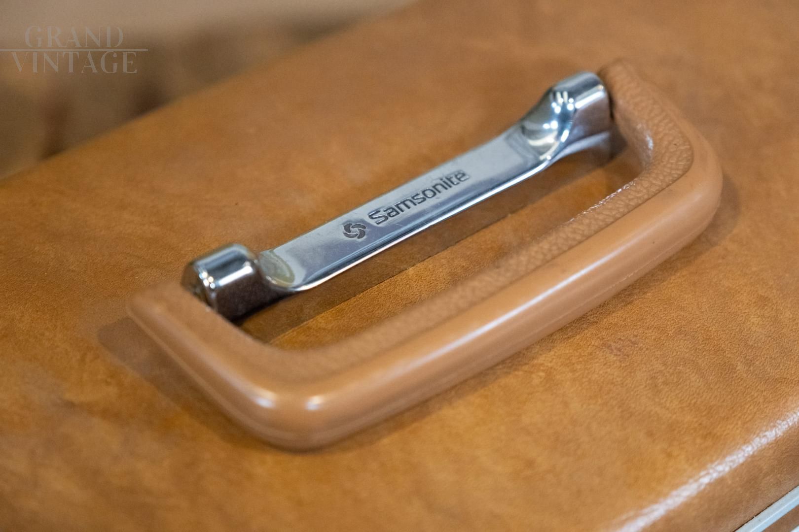 Vintage Samsonite brown leather beauty case with mirror under the lid and compartments, USA 1960s, an elegant and practical accessory for storing your personal items in retro style.