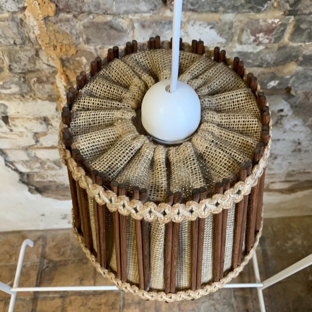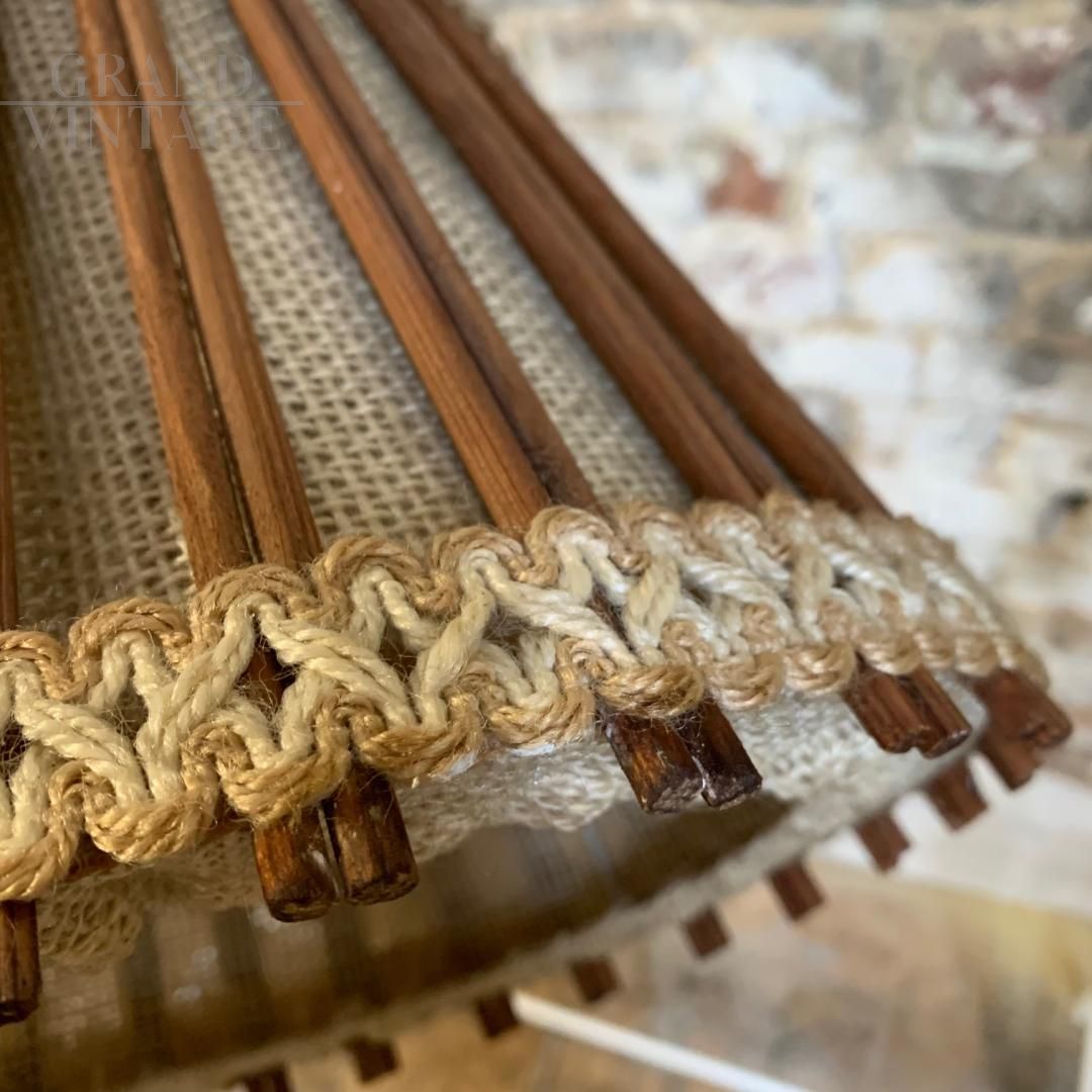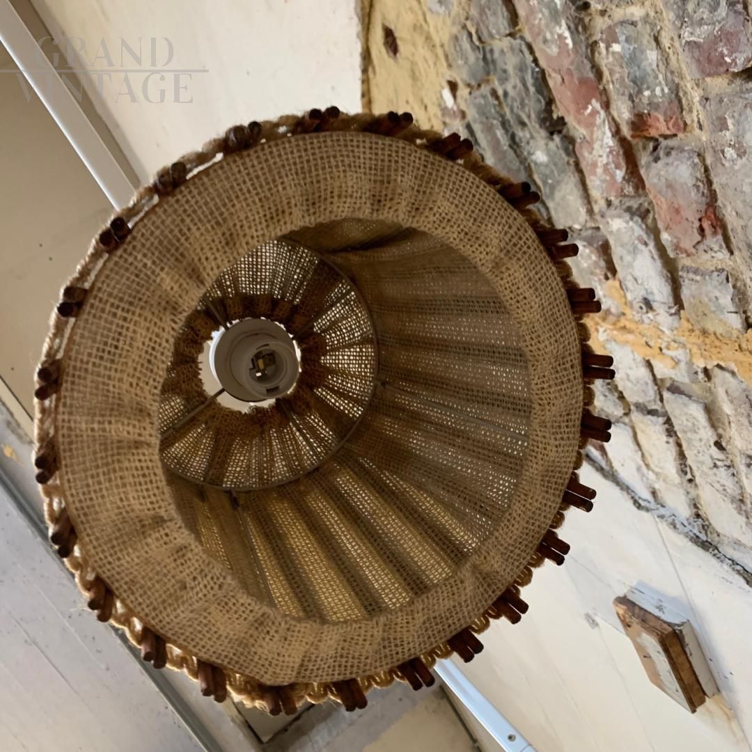 Vintage Scandinavian 60s pendant light in wood and linen, with metal structure. In excellent overall condition, with new wiring, working with an E27 bulb, not included.