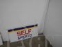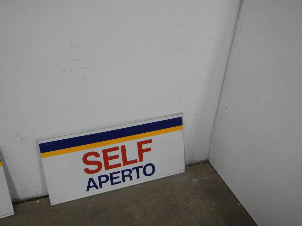 Vintage 1970s double-sided metal sign Self-Service Open - Closed, used in Italian gas stations.