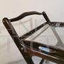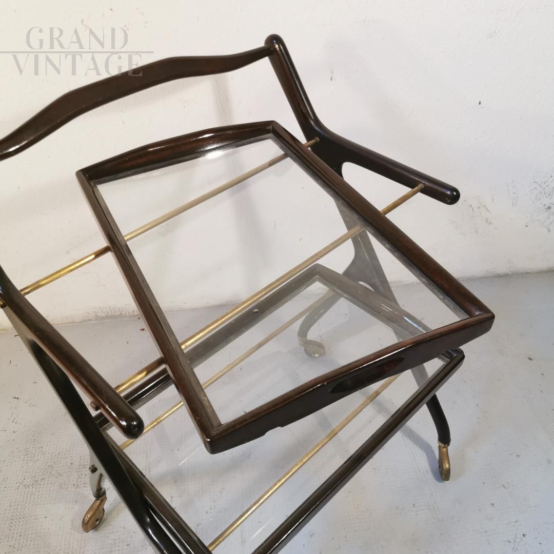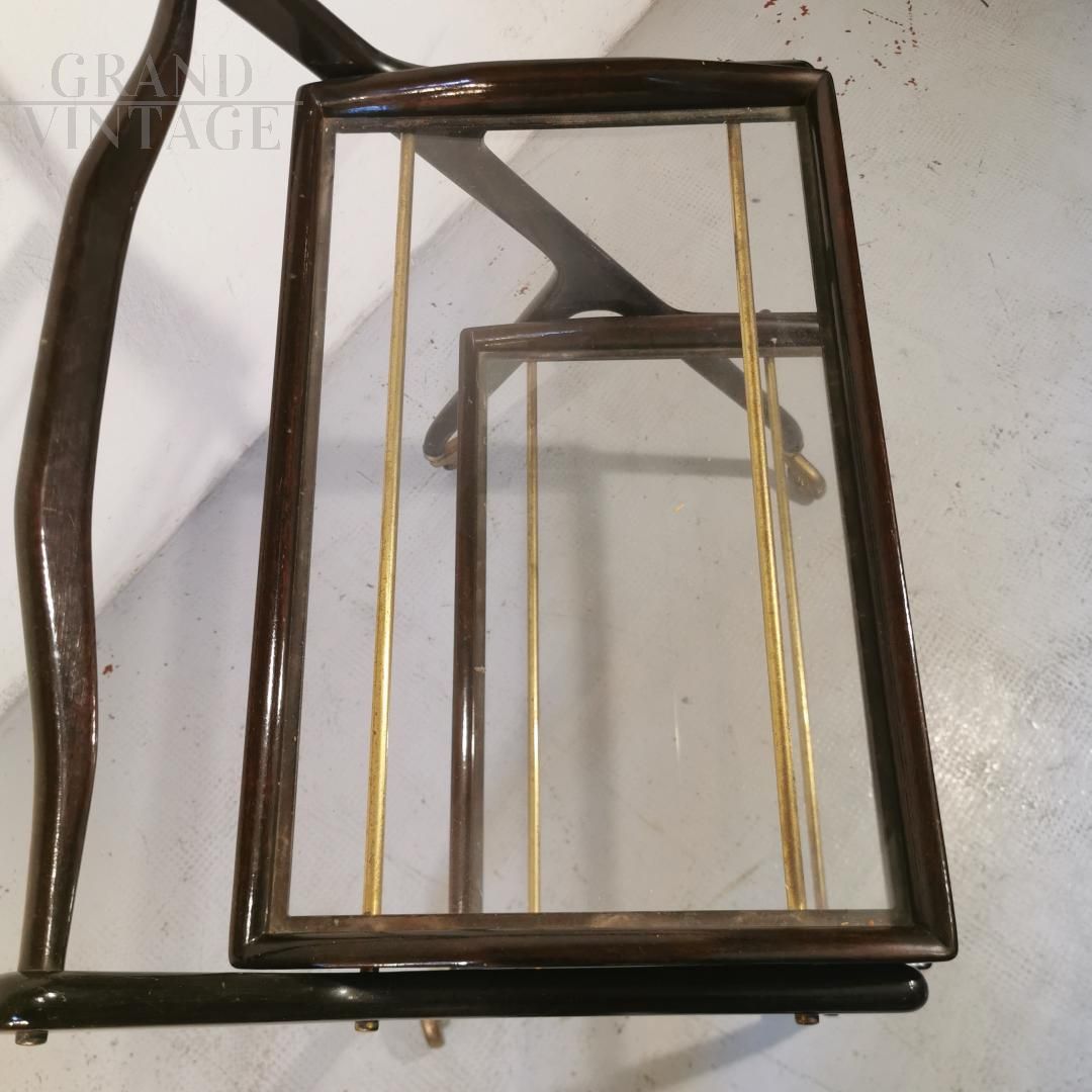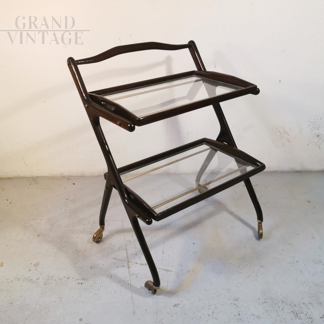 Vintage serving trolley by Cesare Lacca for Cassina with wooden structure, with 2 removable trays composed by a wooden frame and a glass top.