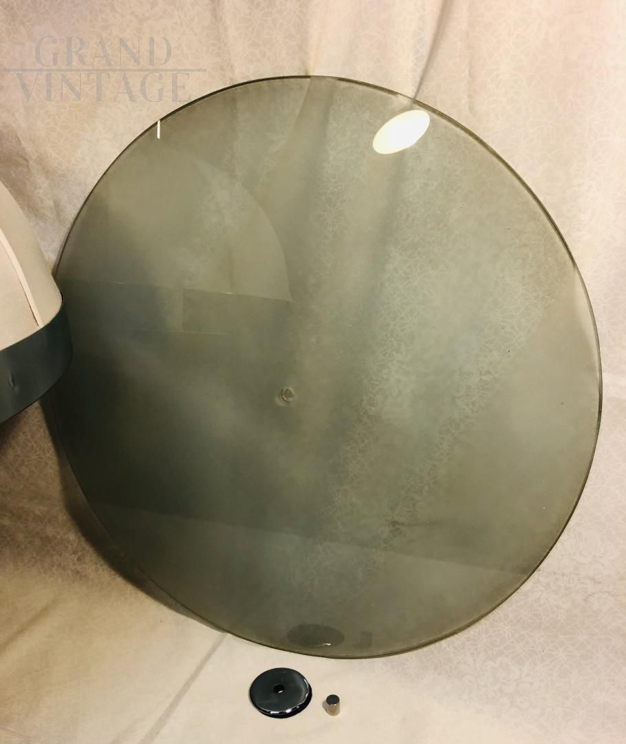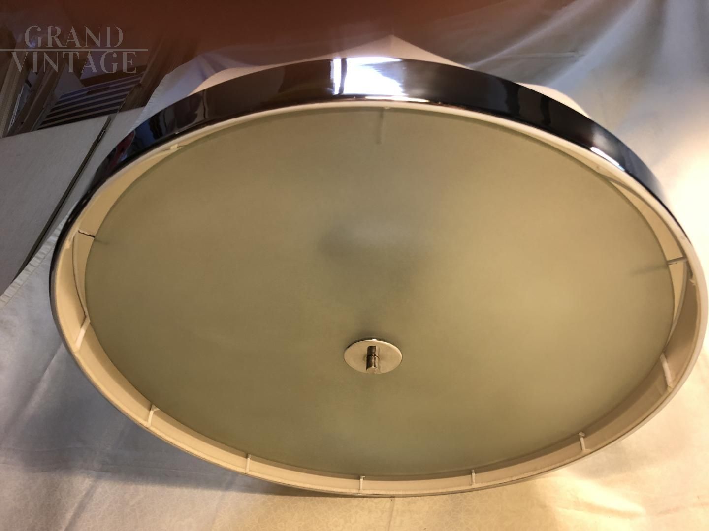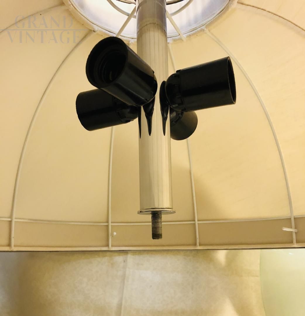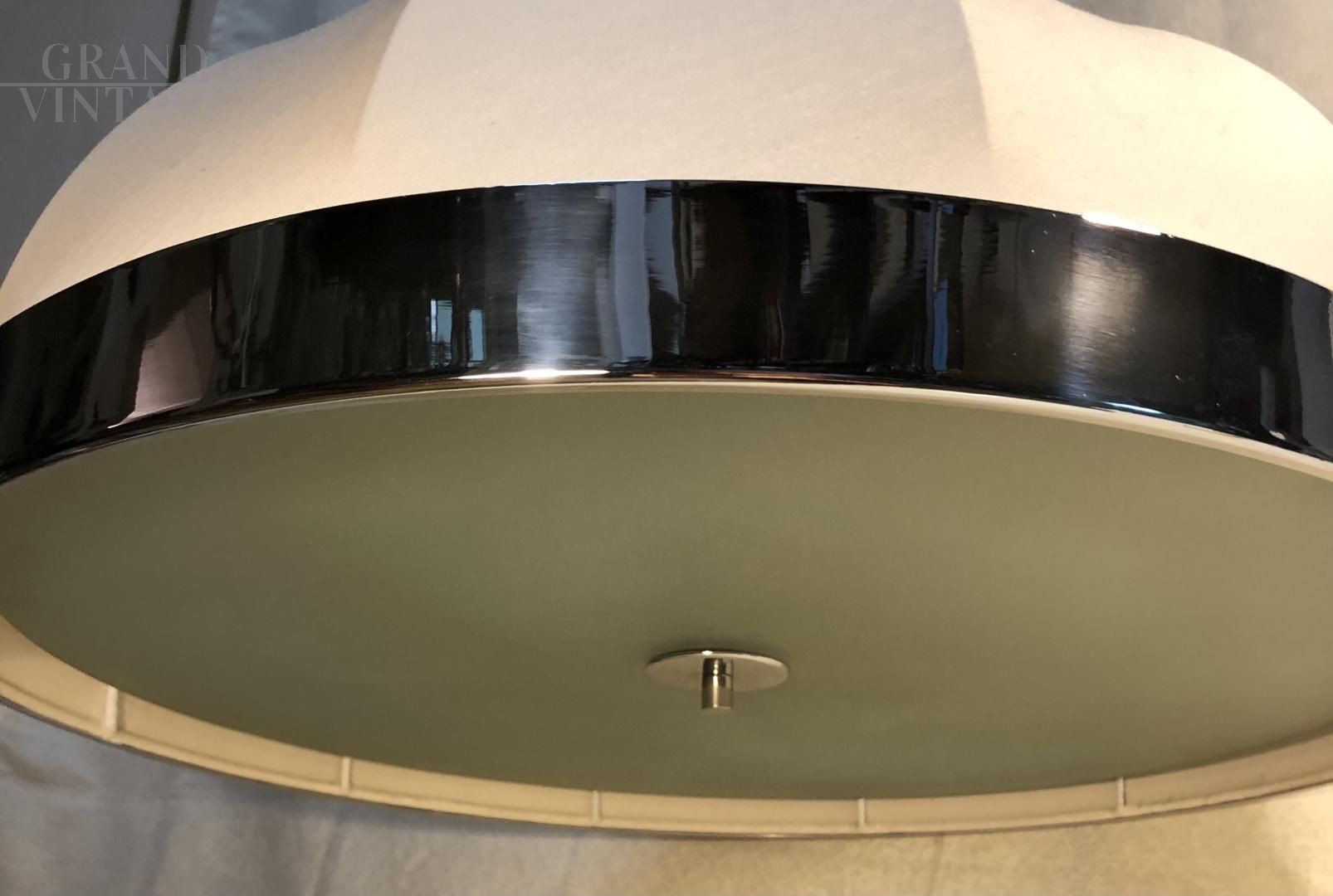 Particular made in Italy pendant lamp from the 1970s with Shantung silk fabric lampshade, structure with decorative chromed metal circles and lower part in satin glass that shields the four lights. In excellent condition as it has recently been restored.