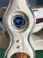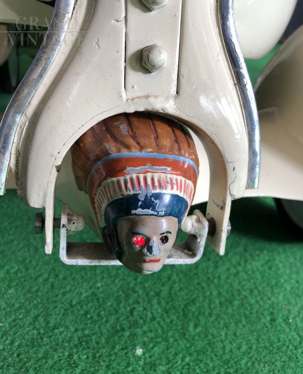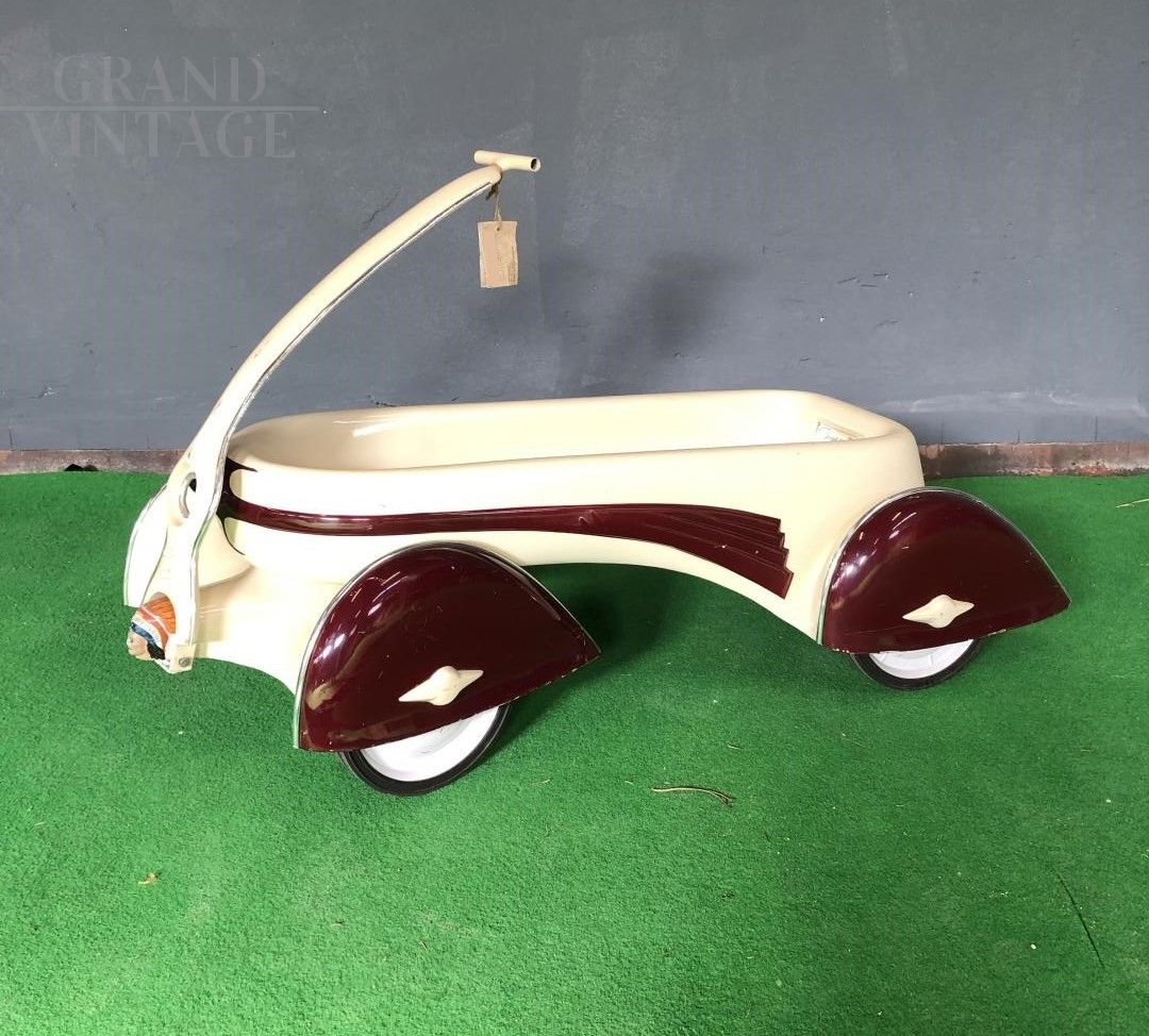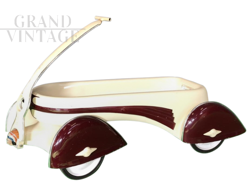 American vintage cart for transporting children, in fiberglass with a pull handle, Indian head on the front and working light. The plaque reads "Sherrell Classic Limited Edition Maximum Production 2500 Serial Number 000008". It has battery-powered lights in front - branded Sherrell Classic - company that has reproduced this model inspired by the fenders of chevrolets.