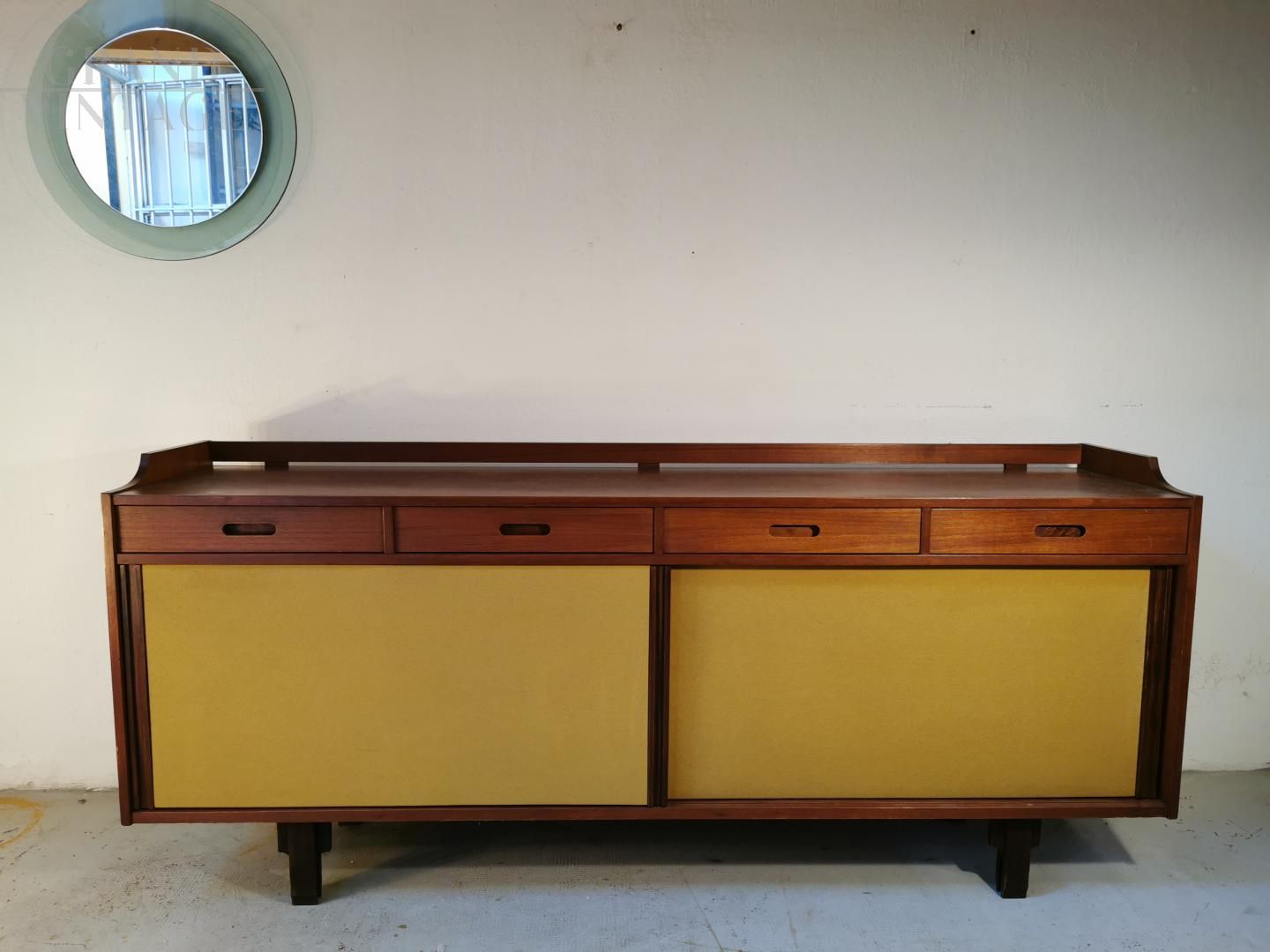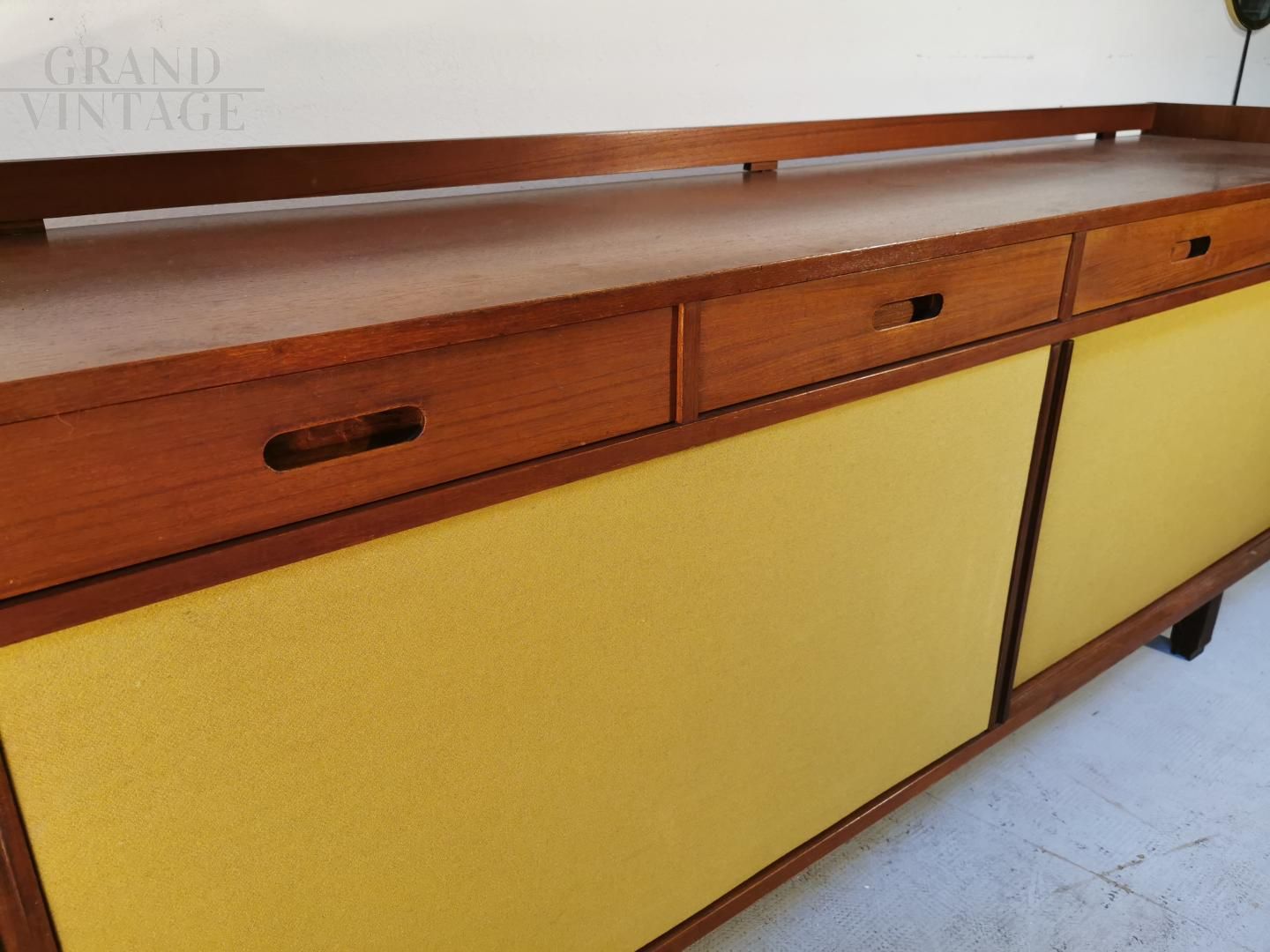 Vintage sideboard with sliding doors in yellow fabric and teak wood, 1960s.