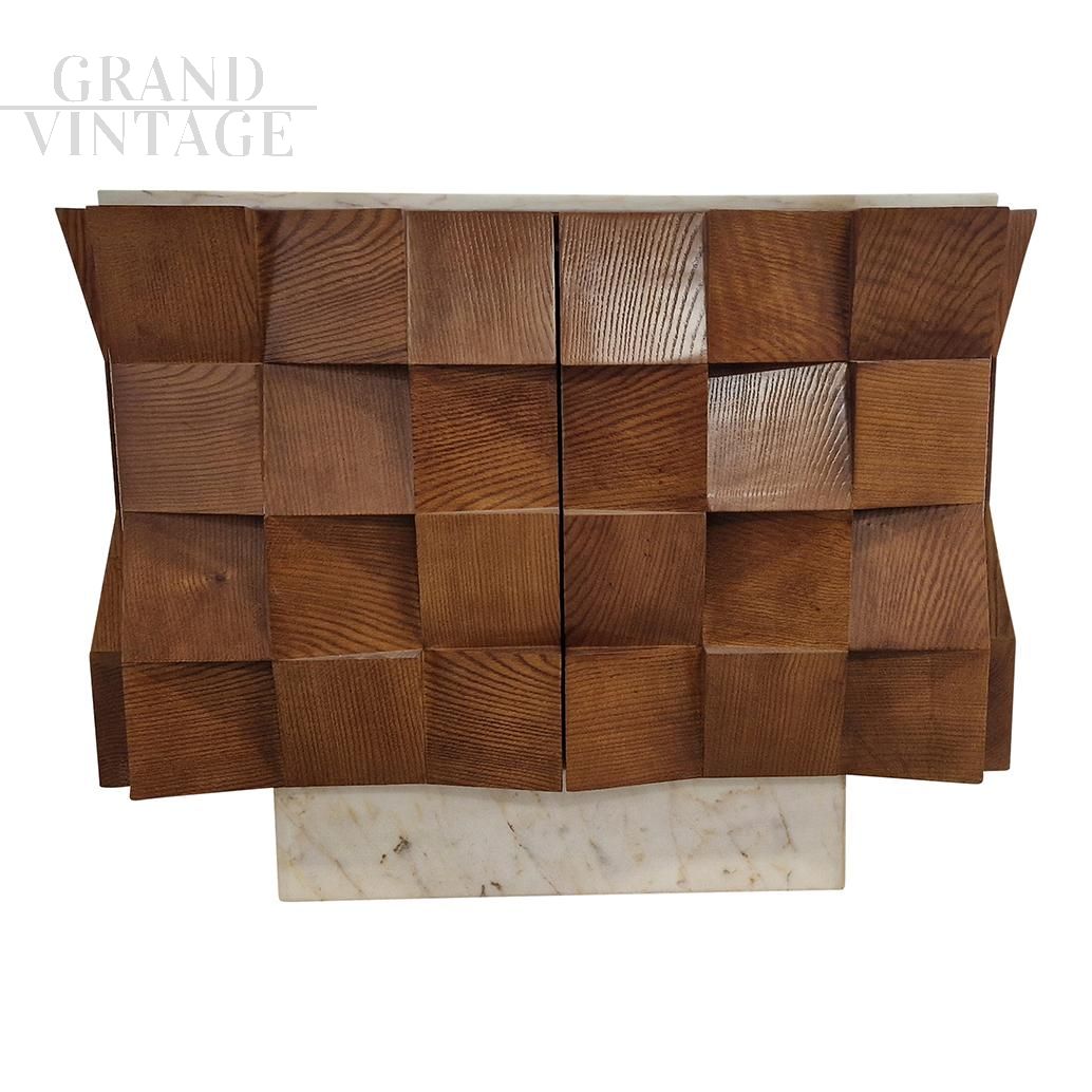 Particular vintage Italian sideboard, composed of two folding doors, made with a solid walnut wood structure. The very unique design of the top of the central doors and the sides features numerous wooden squares combined together at different angles to show texture and spatial depth. The upper part of the sideboard and the rectangular base that supports it are covered in Bianco Carrara marble. Made in Italy between the 70s and 80s.