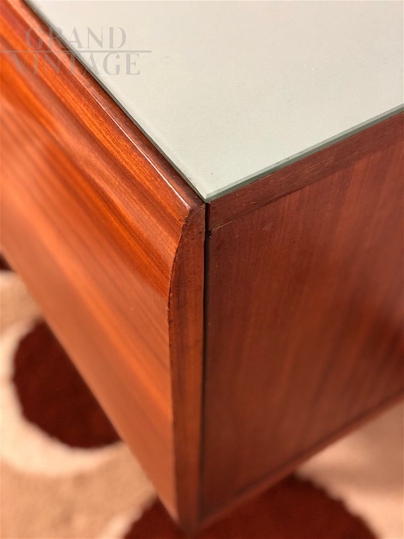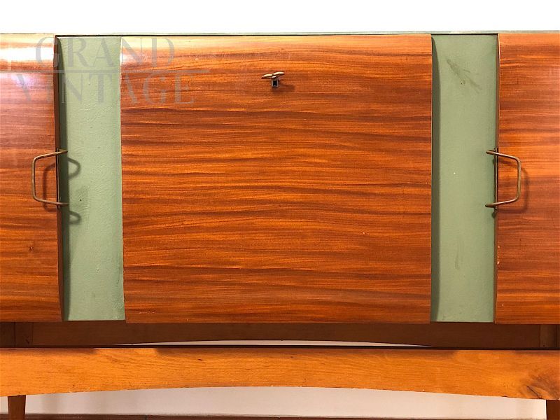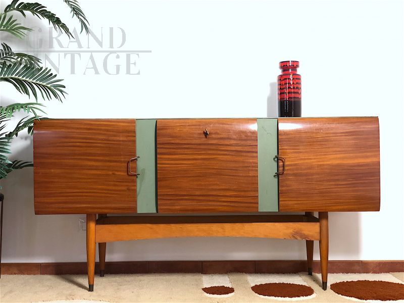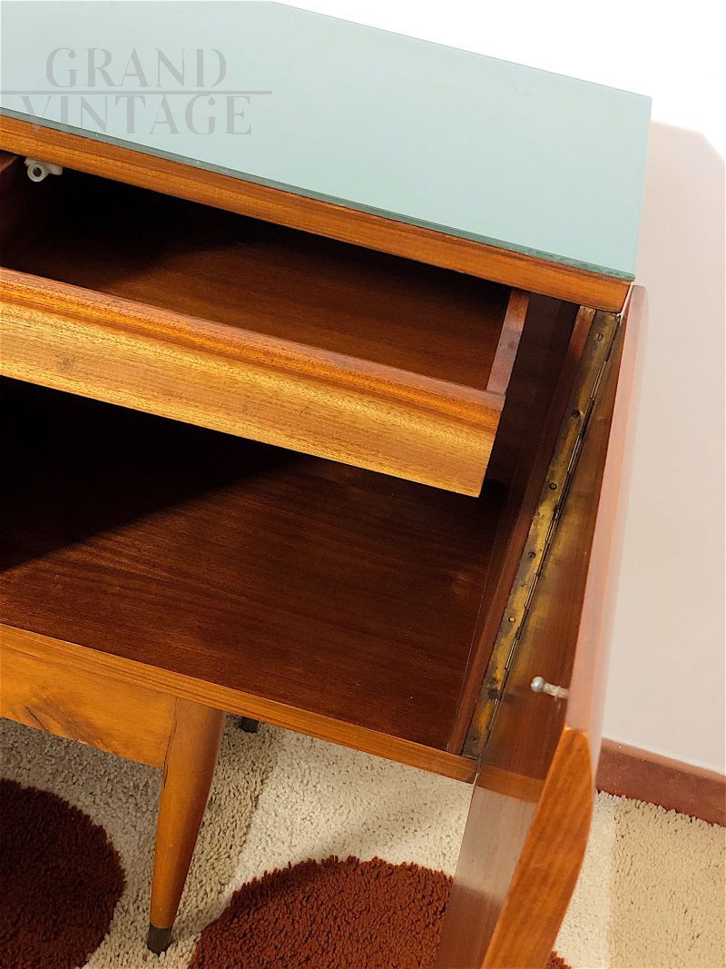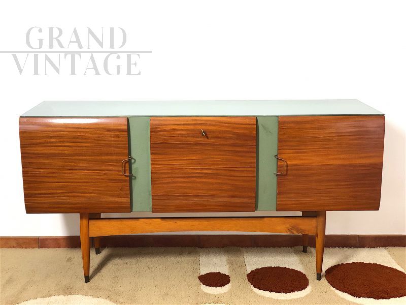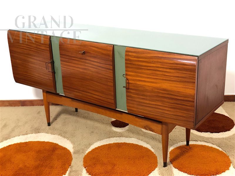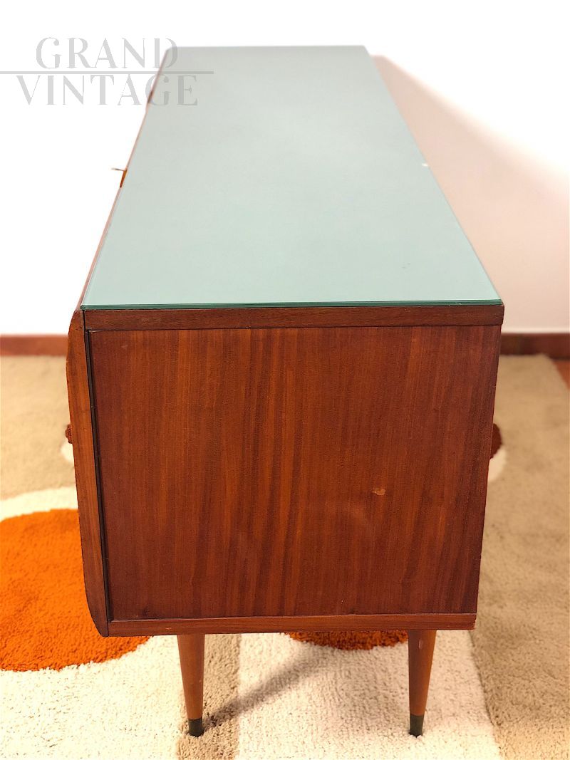 Vintage 1960s sideboard of Italian manufacture but with a Scandinavian style, with solid beech wood structure and sage green satin glass top, brass handles, legs with brass tips. The sideboard has 2 compartments with doors and relative internal drawer, a compartment with a folding door and internal glass lining. The asymmetrical structural line is decidedly futuristic by the standards of the 1960s. Completely restored and in perfect condition. Measurements: Height 85 cm, Width 165 cm, Depth 50 cm.