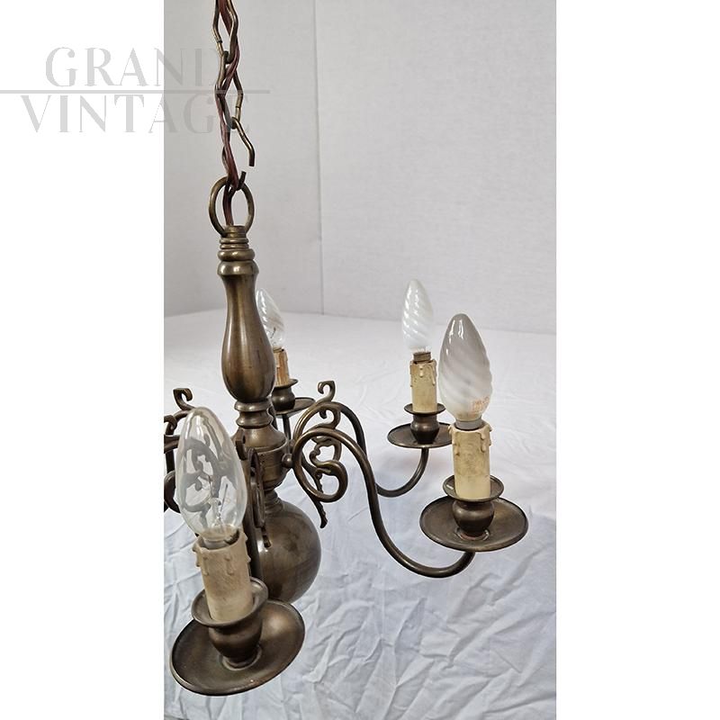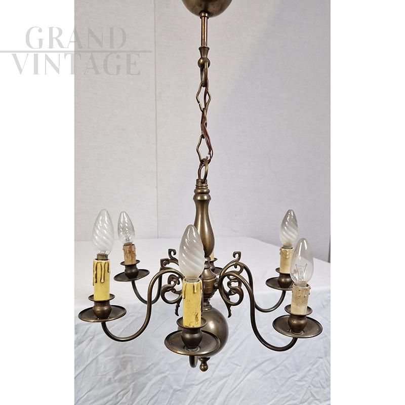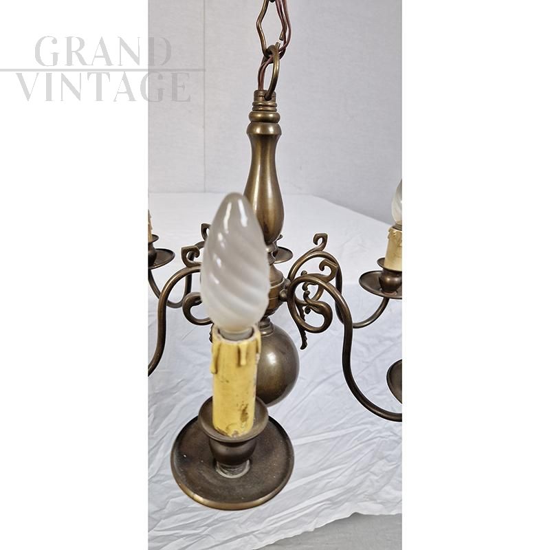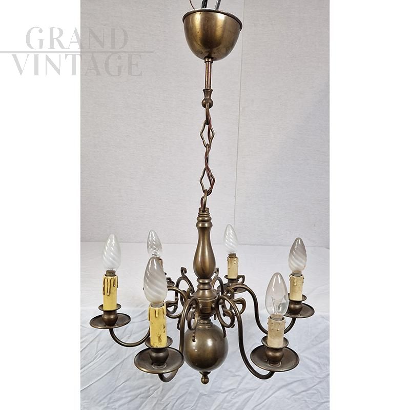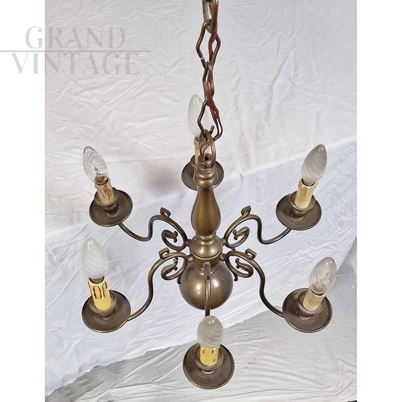 Classic vintage chandelier with six arms and six candle-shaped light points, made of turned brass plate with cast bronze elements. The chandelier works with 6 candle light points that support E14 type bulbs. In good condition.