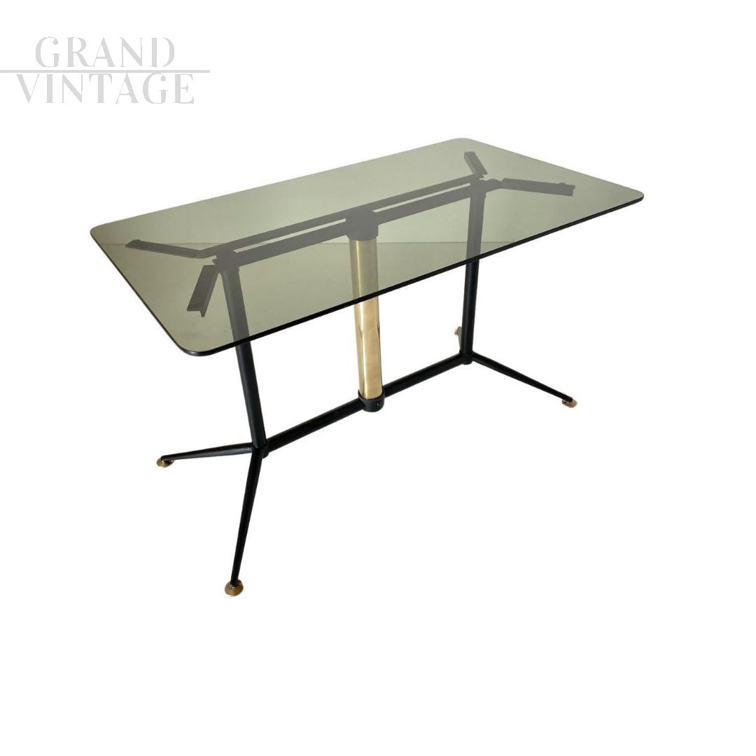 Vintage steel coffee table from the 1960s. Produced in Italy and composed of a dark smoked glass top, black steel and brass structure. Restored as follows: Steel structure refinished and repainted respecting the original color and finish, polished brass. In very good condition, with small signs of aging on the brass rod and glass top.