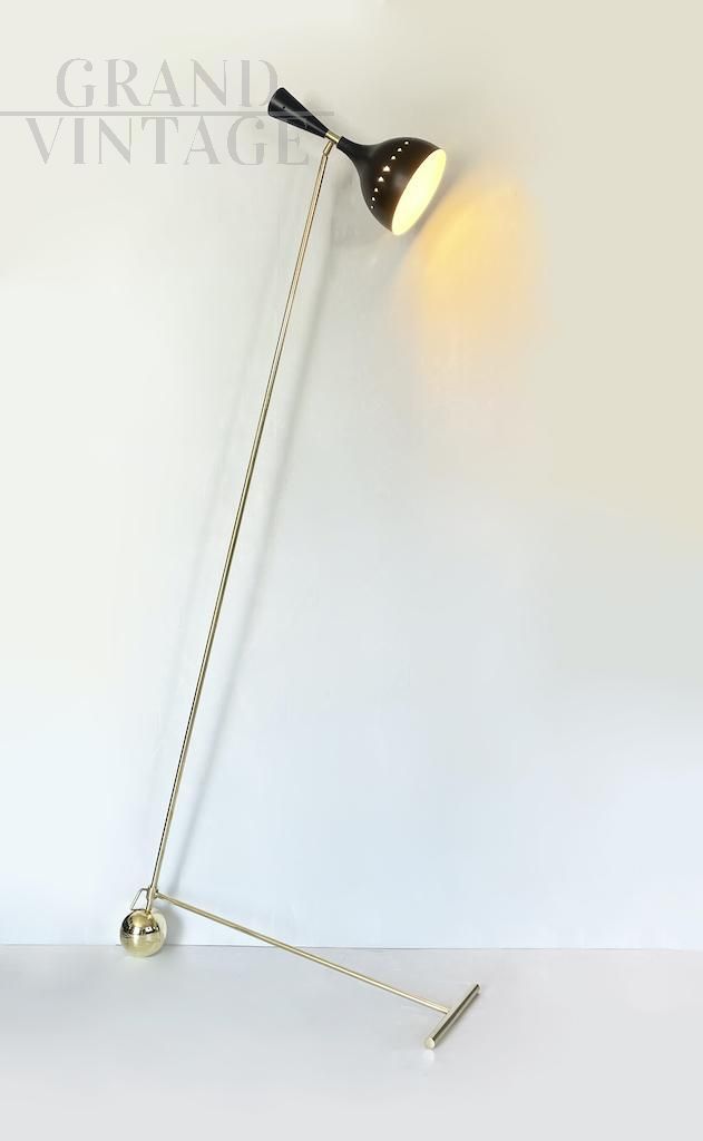 Elegant L-shaped floor lamp with a counterweight, brass frame, and a double-cone lampshade in black-painted iron in the Stilnovo style, Italy 1970s. At the base of the frame, the lamp features a sphere resting on the floor, which, supported by a brass T-shaped rod, holds the structure upright and lends a refined and distinctive look to the decor.