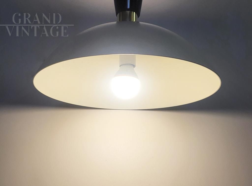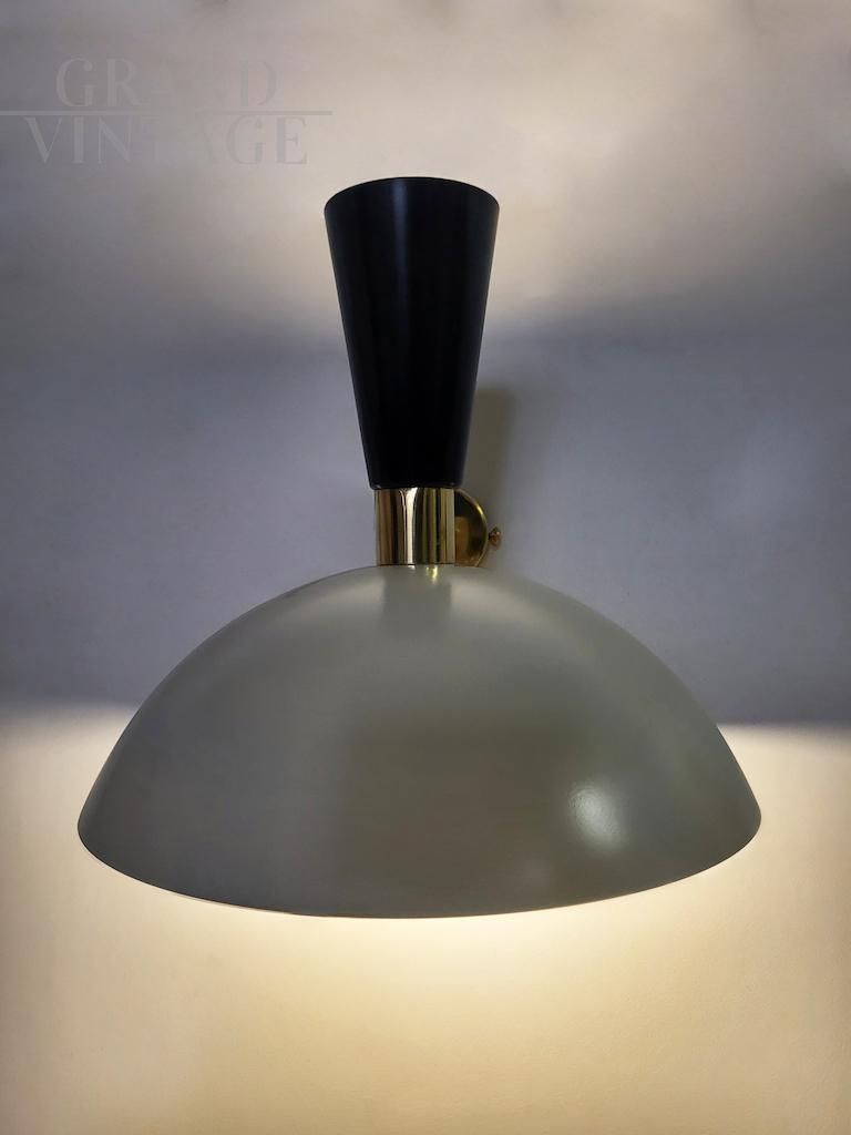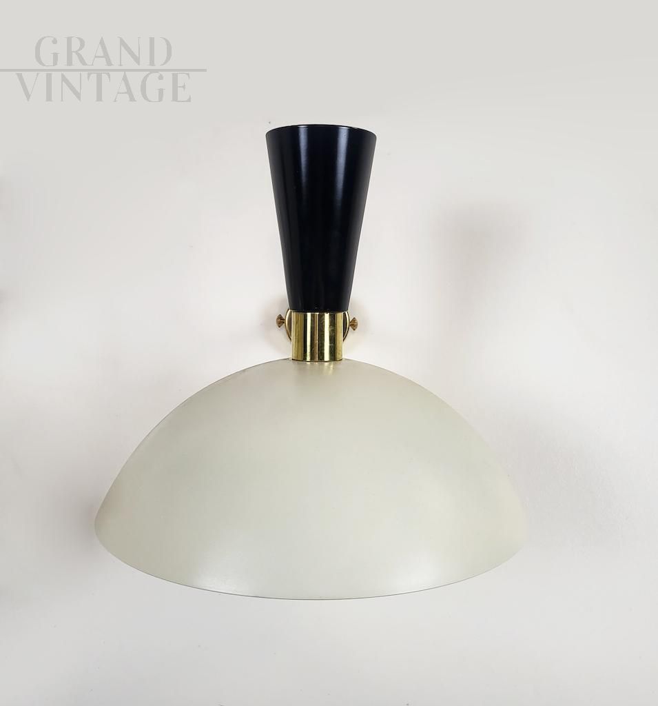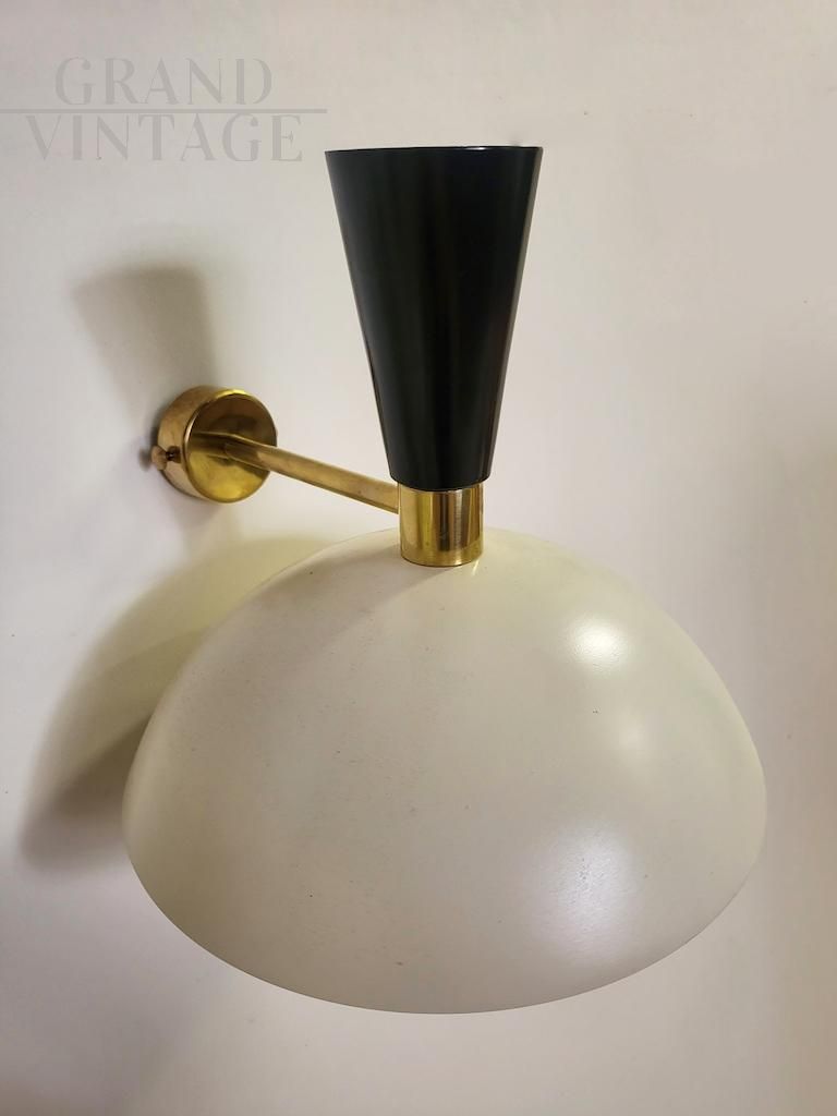 Particular vintage wall lamps with structure entirely in black and white painted metal and with central brass detail.