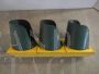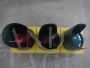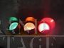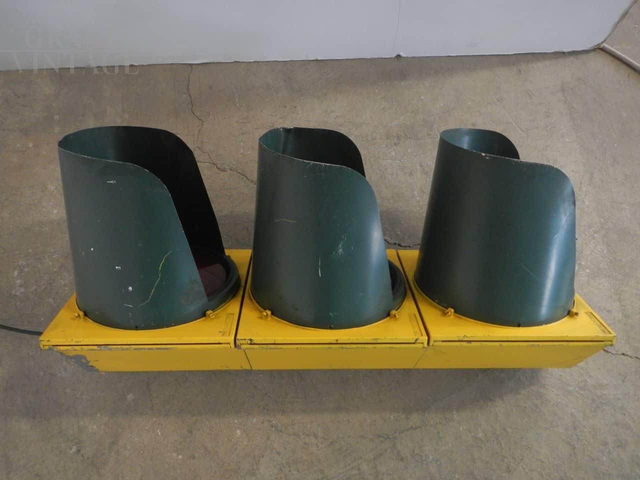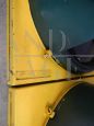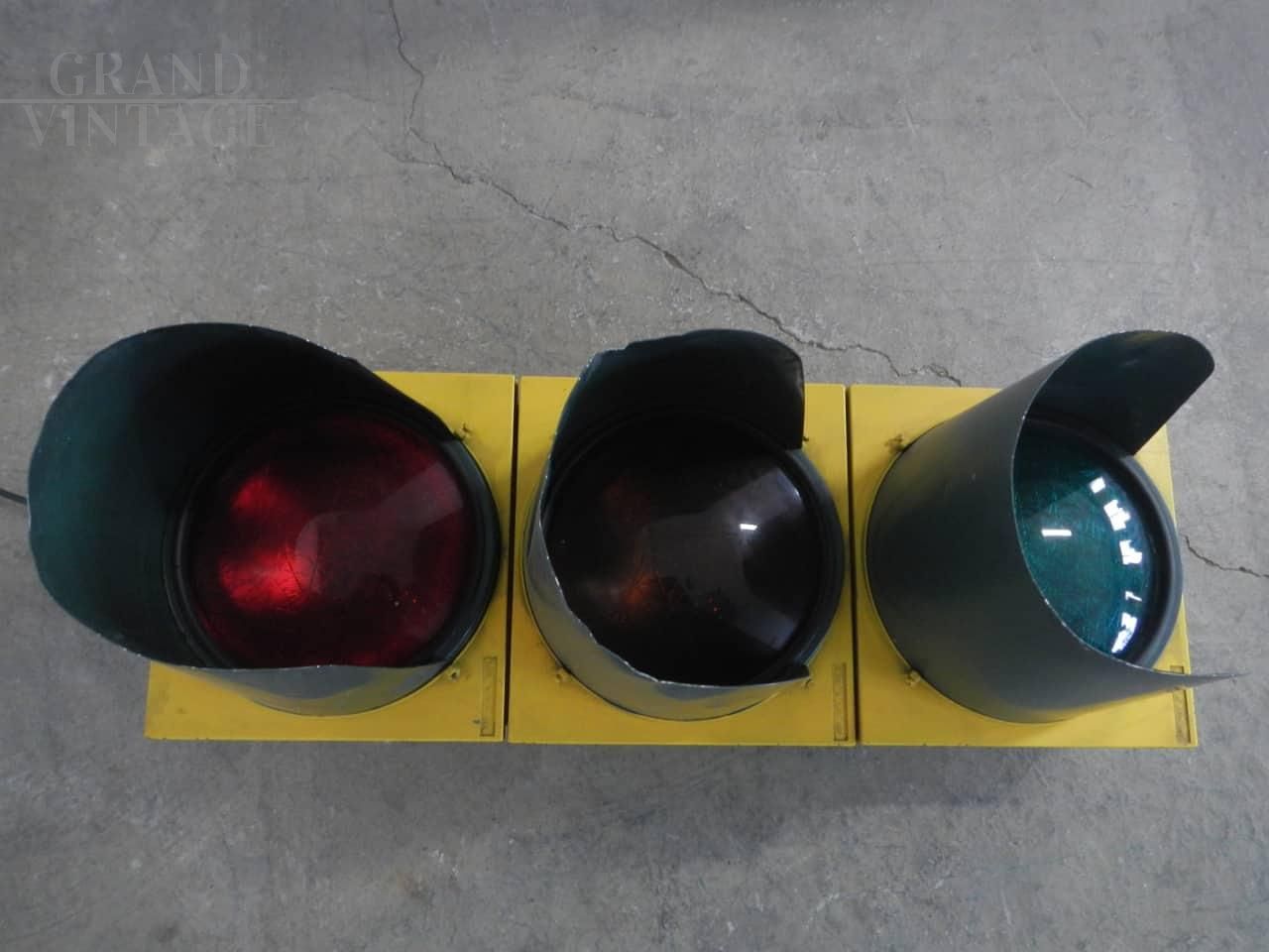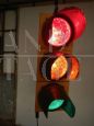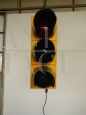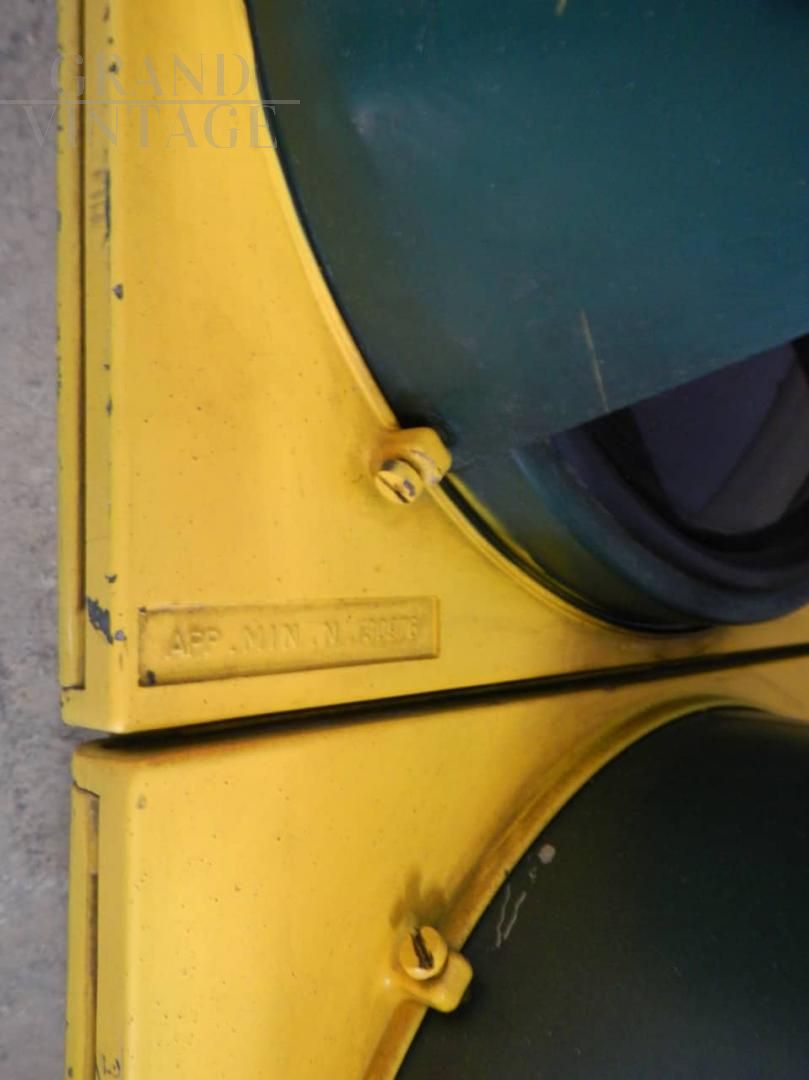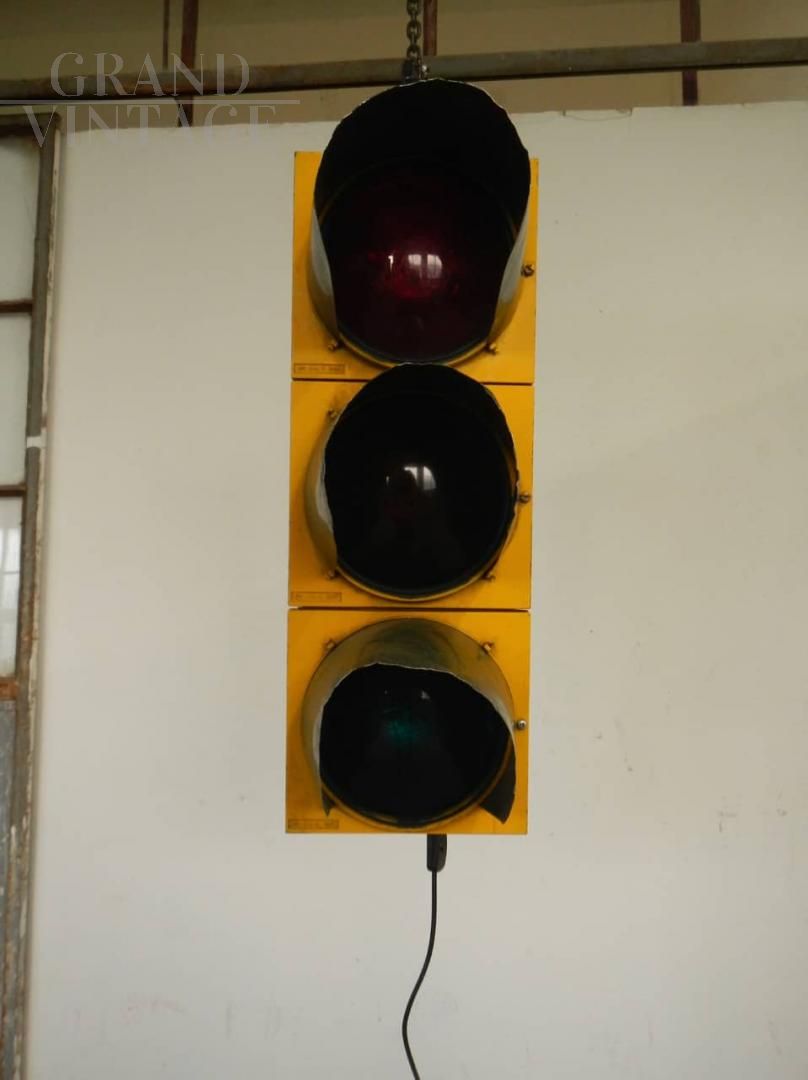 Working iItalian street traffic light from the 80s, with eyebolt to hang it from the ceiling, with E27 connection. Works with 200watt bulbs.