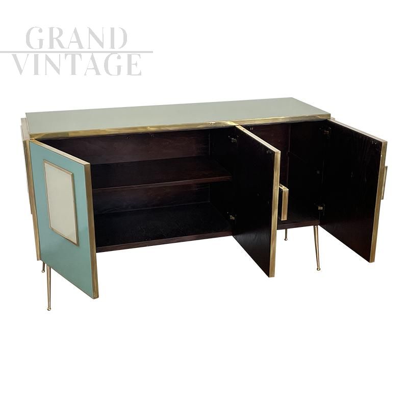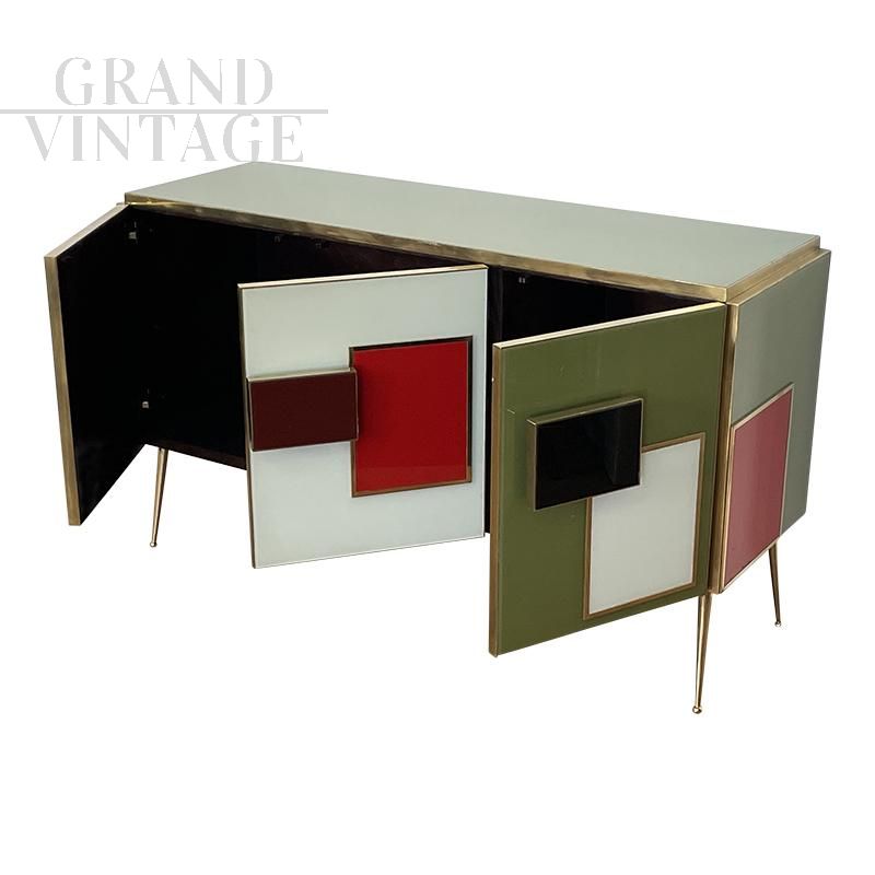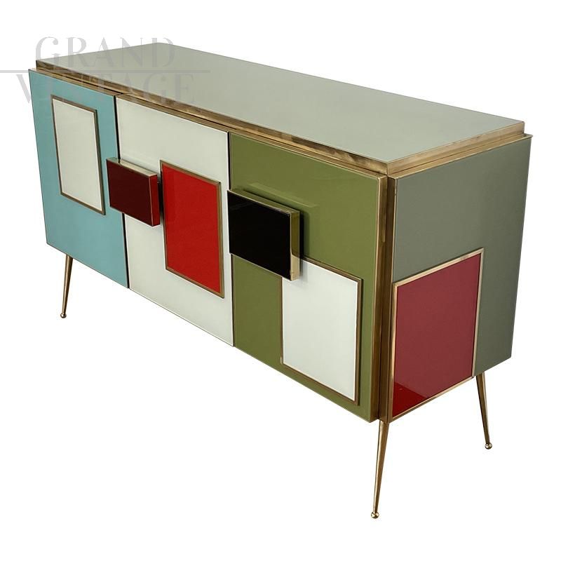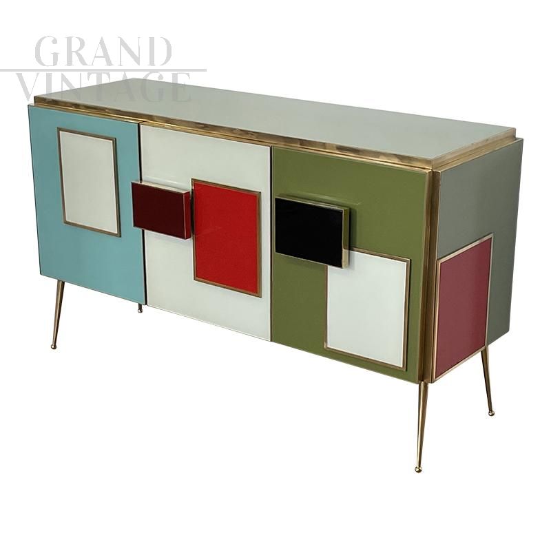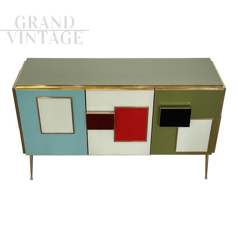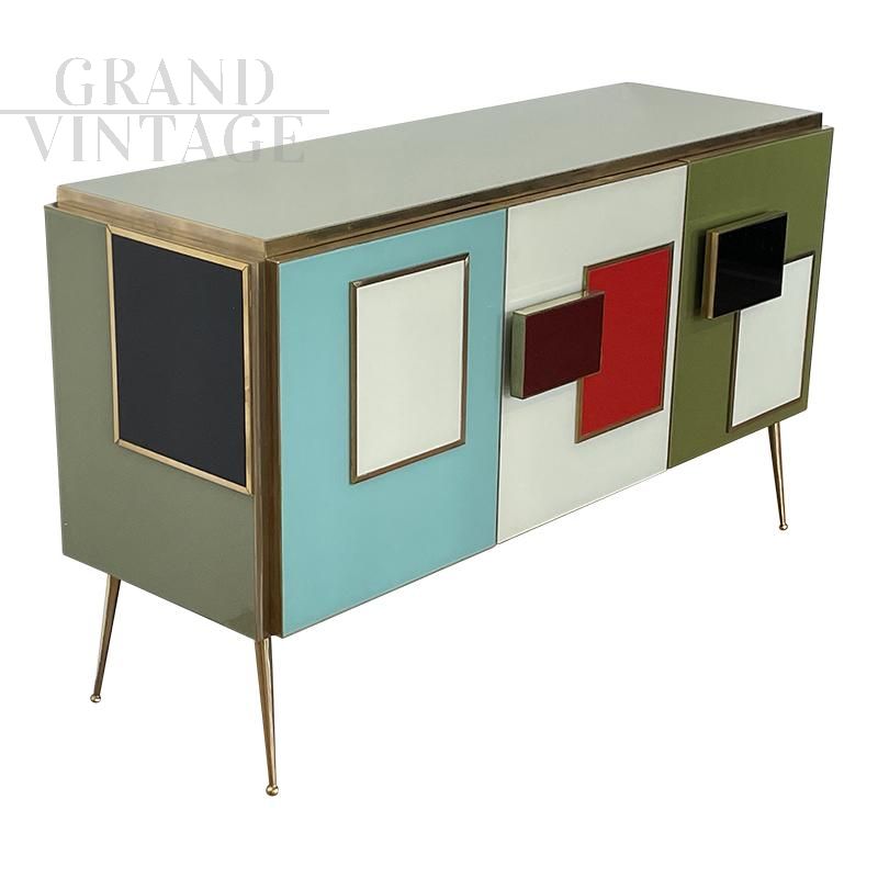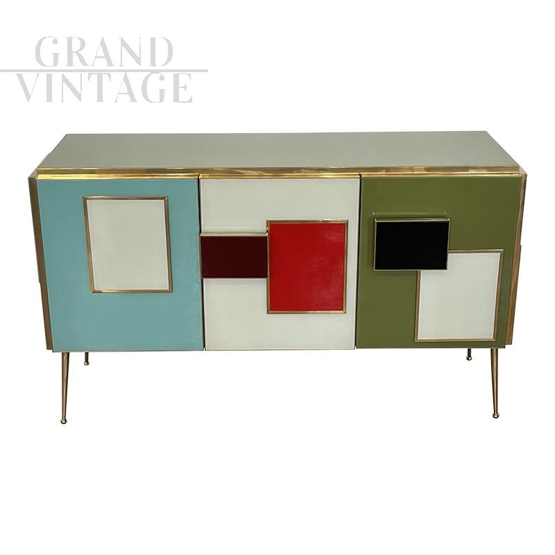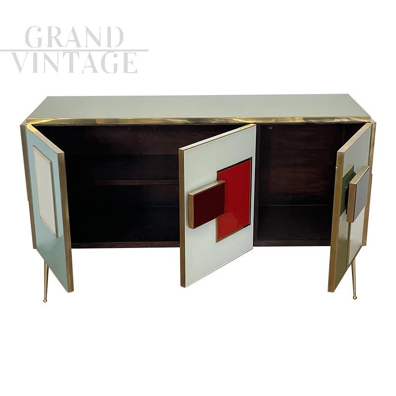 Vintage style three-door sideboard, entirely handmade, with wooden structure and multicolored glass surface finishes; profiles, handles and feet in golden brass. Equipped with an internal shelf.