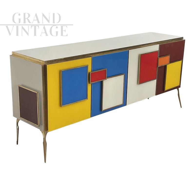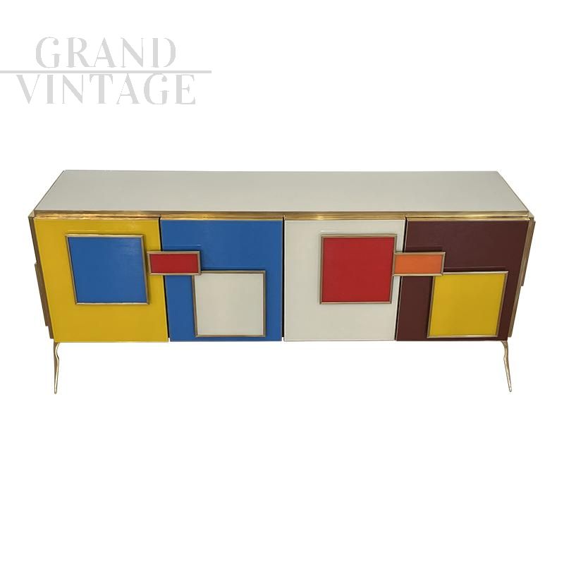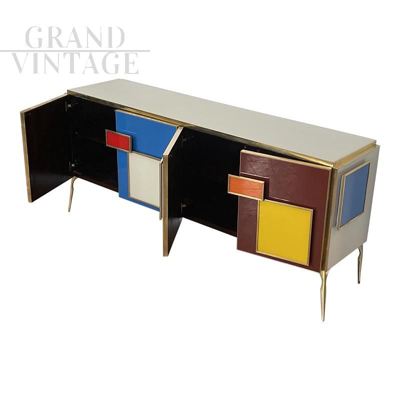 Vintage style four-door sideboard entirely handmade, with wooden structure covered in multicolored glass; profiles, handles and feet in golden brass, handles illuminated with LED strips, internal shelf.