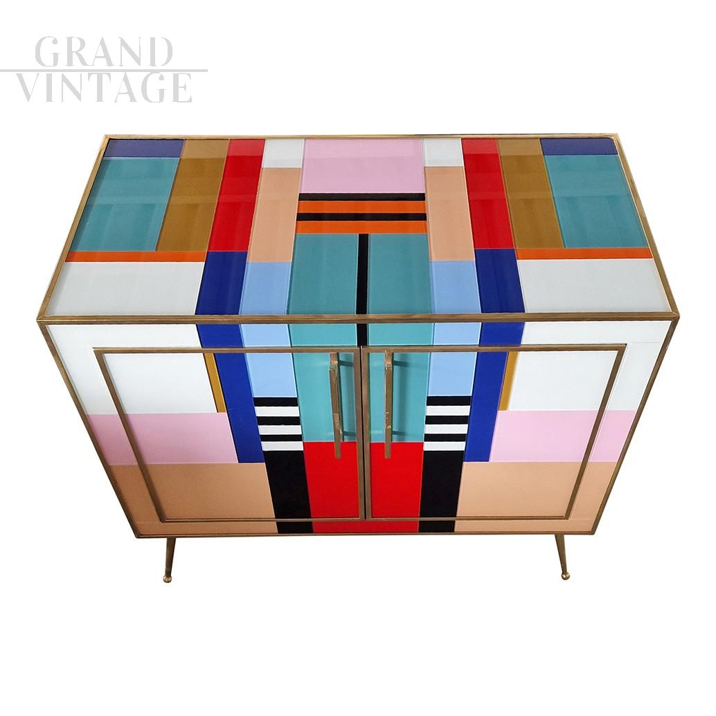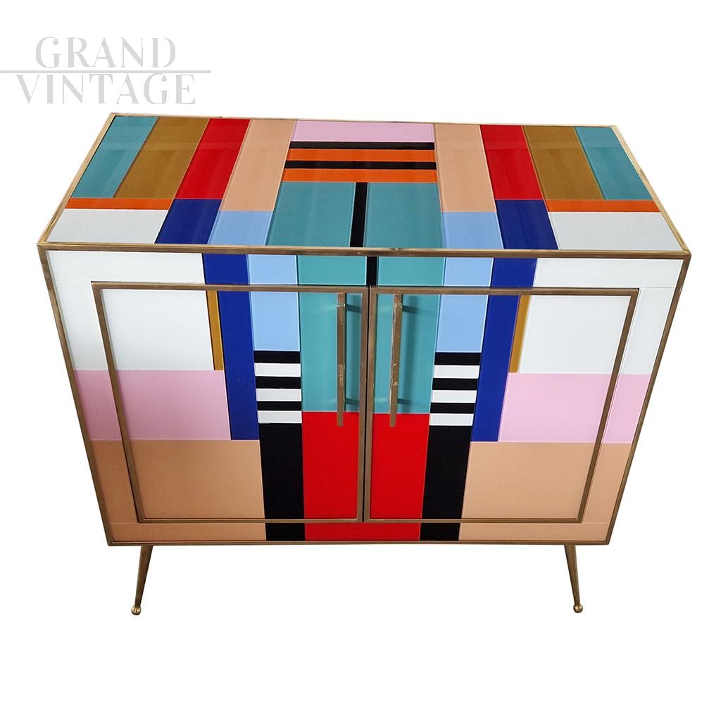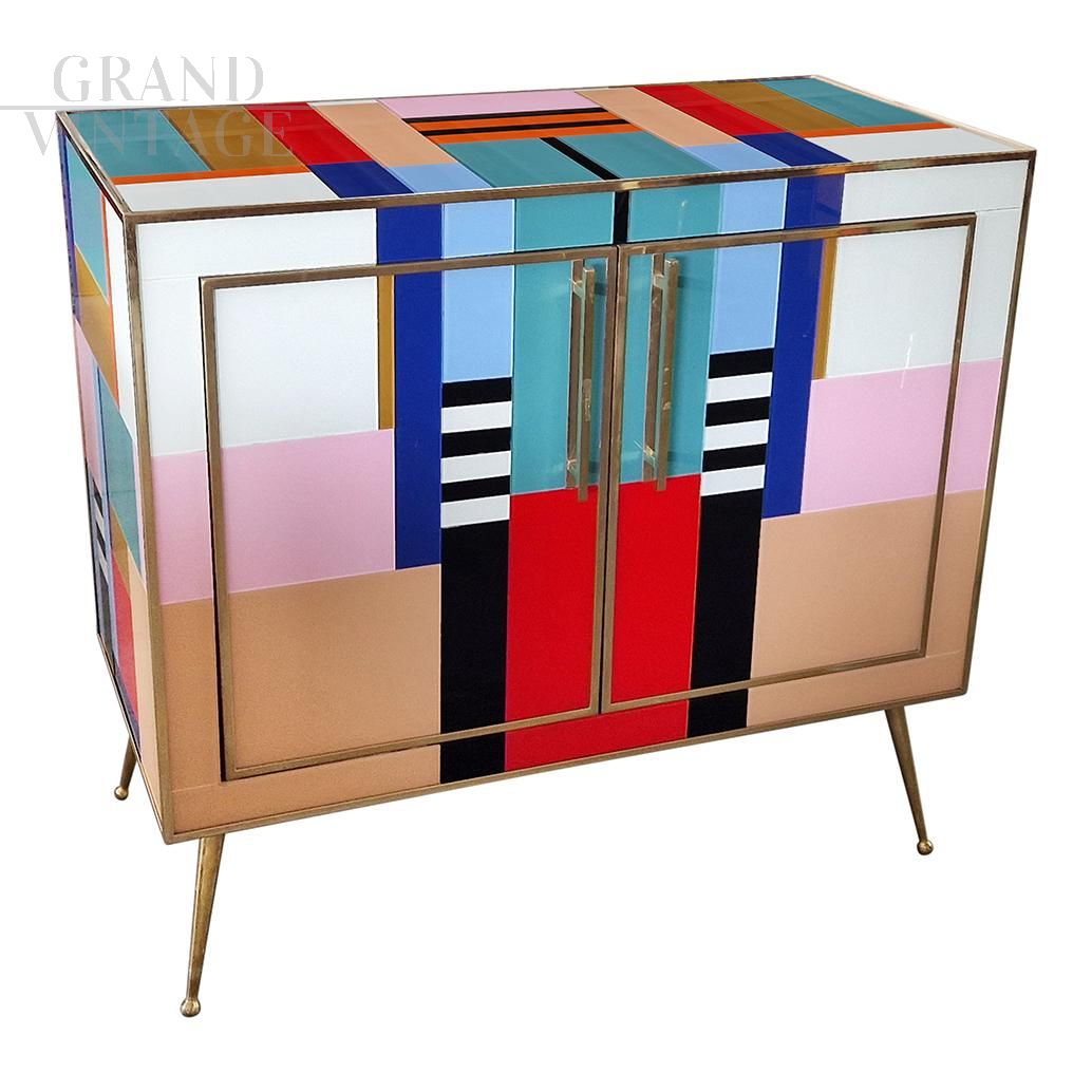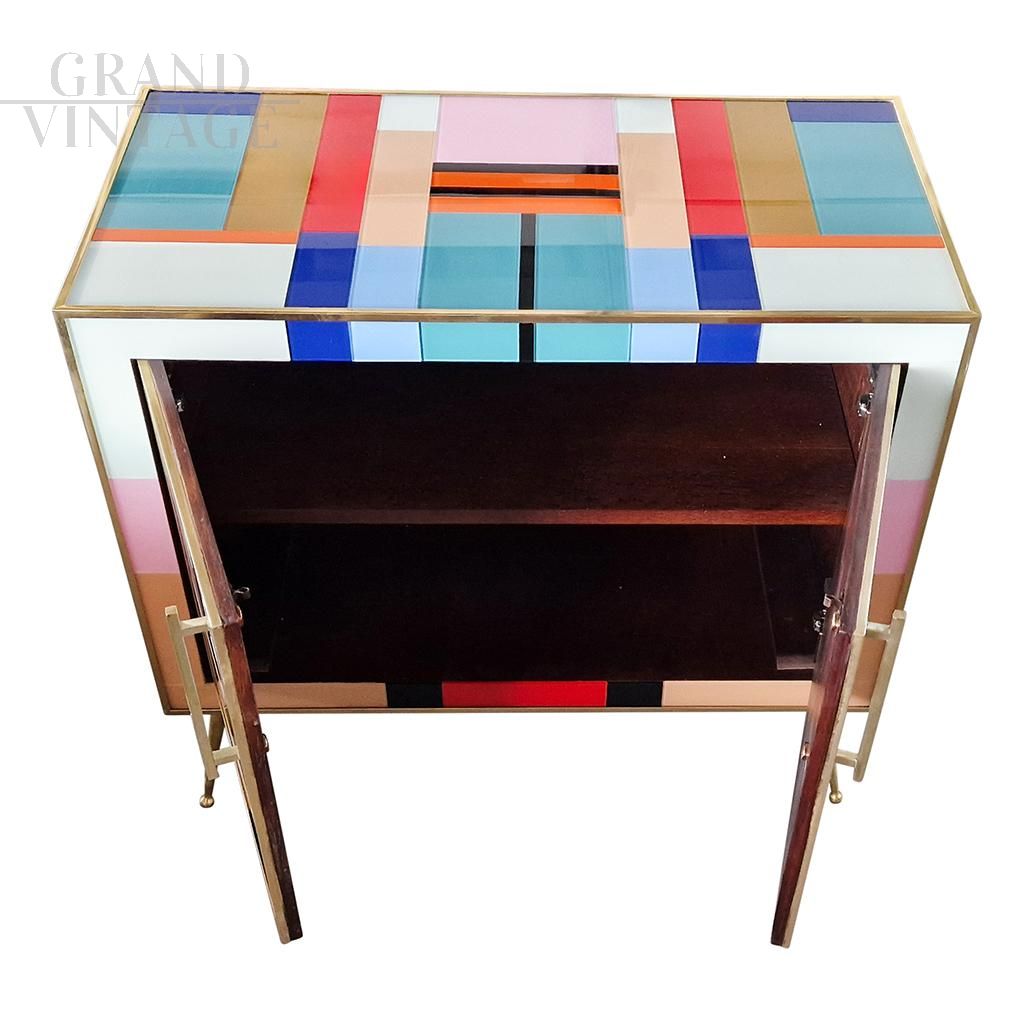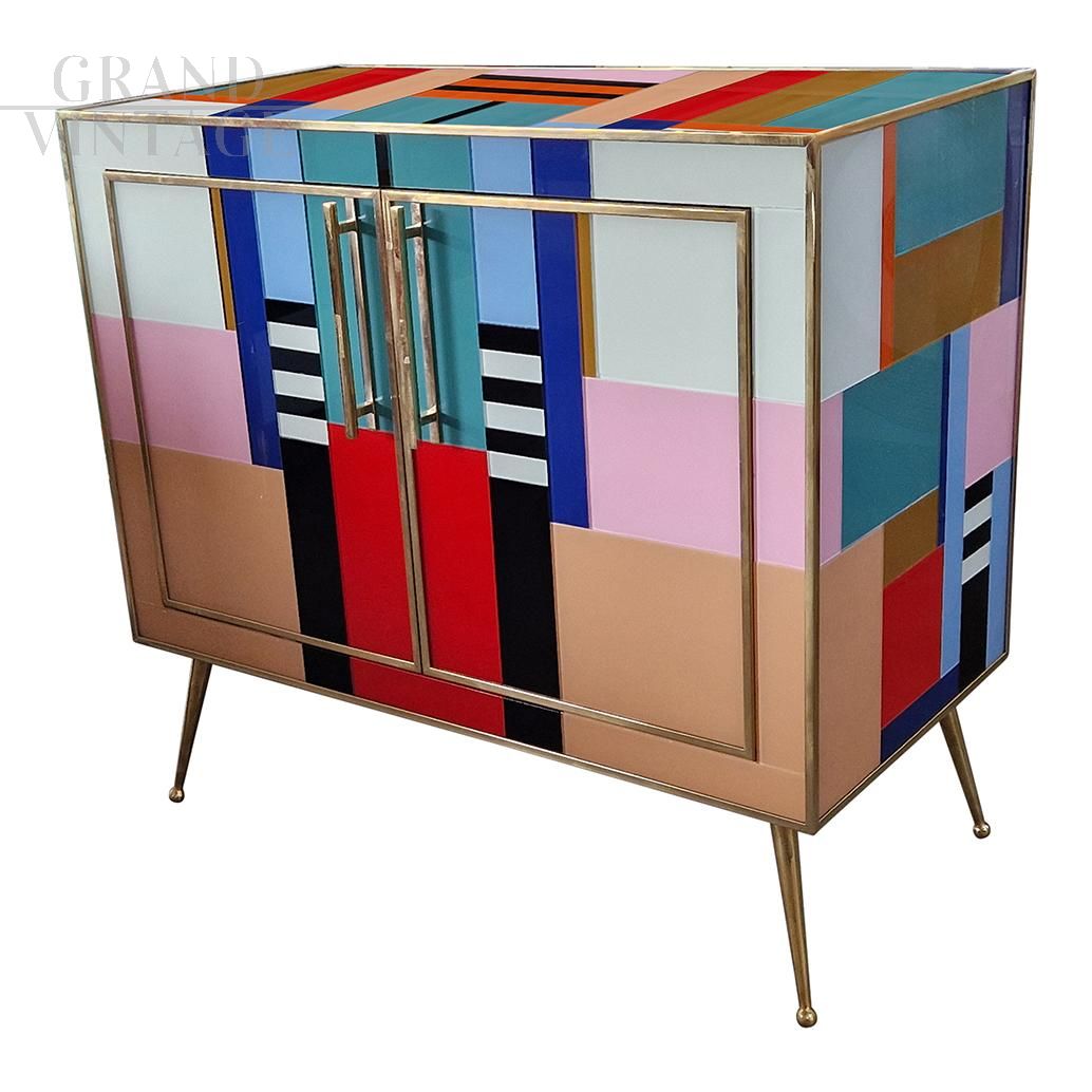 Vintage style design sideboard in wood covered with multicolored Murano glass tiles, equipped with two doors and entirely handmade; profiles, handles and feet in golden brass, internal wooden shelf.