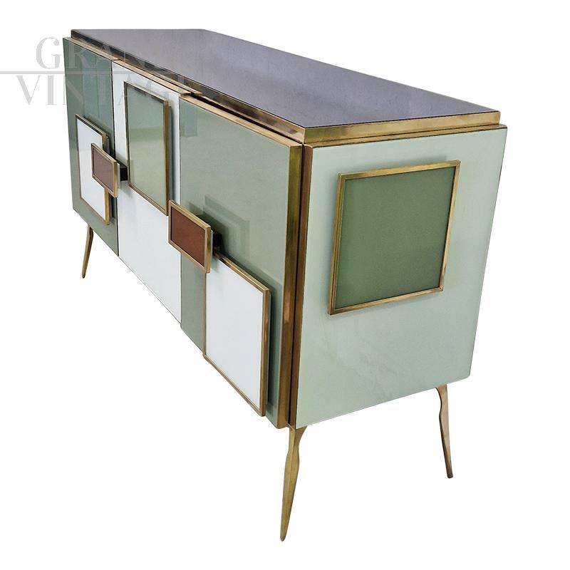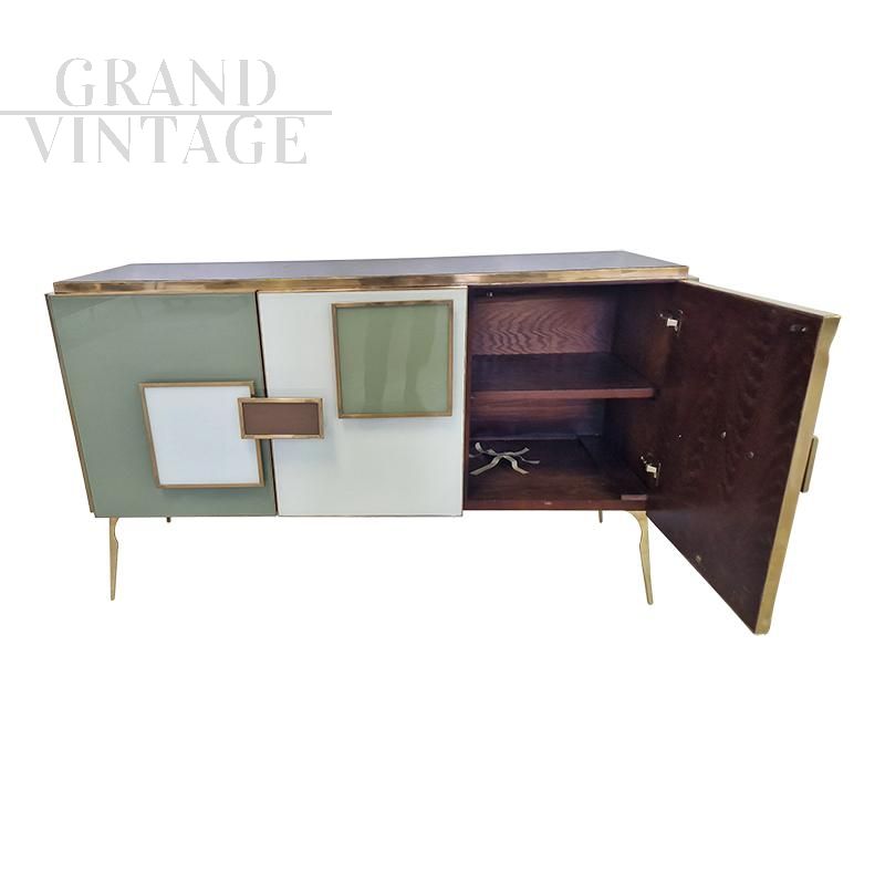 Three-door sideboard entirely handmade, with wooden structure covered in white and sage green glass, profiles and feet in golden brass, backlit handles with LED strips that can be operated with a special remote control, equipped with an internal shelf.