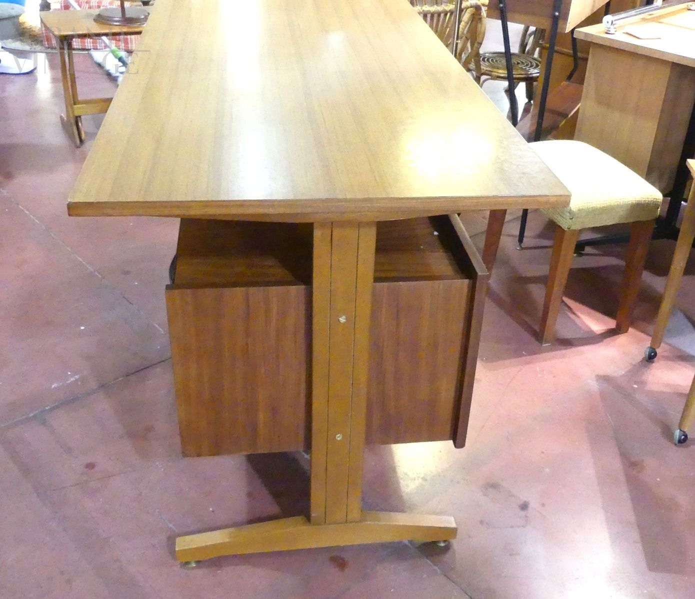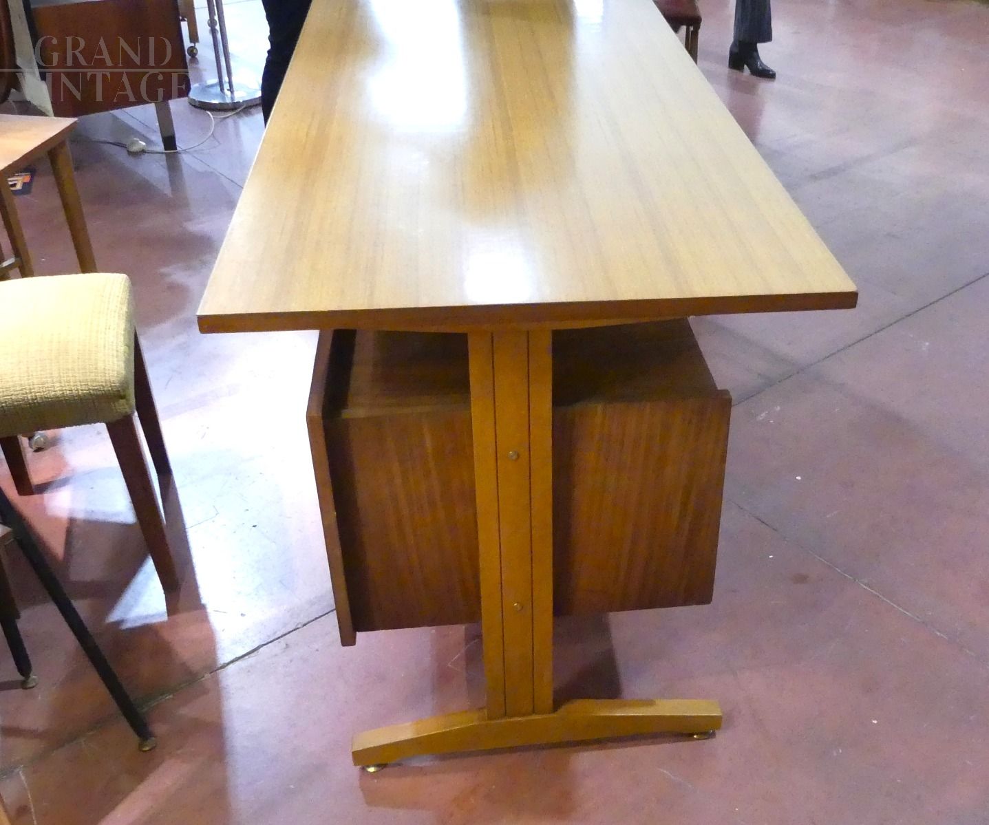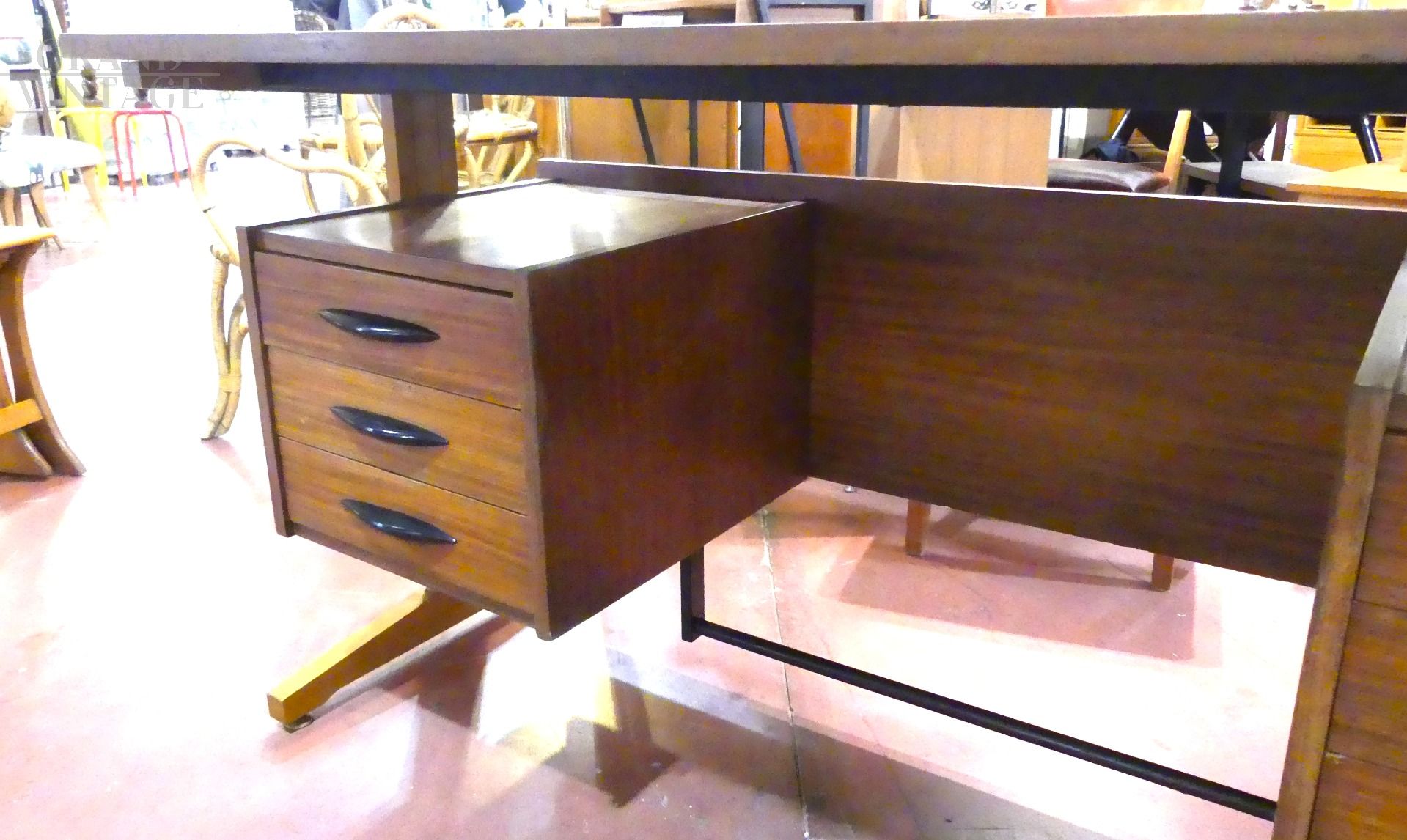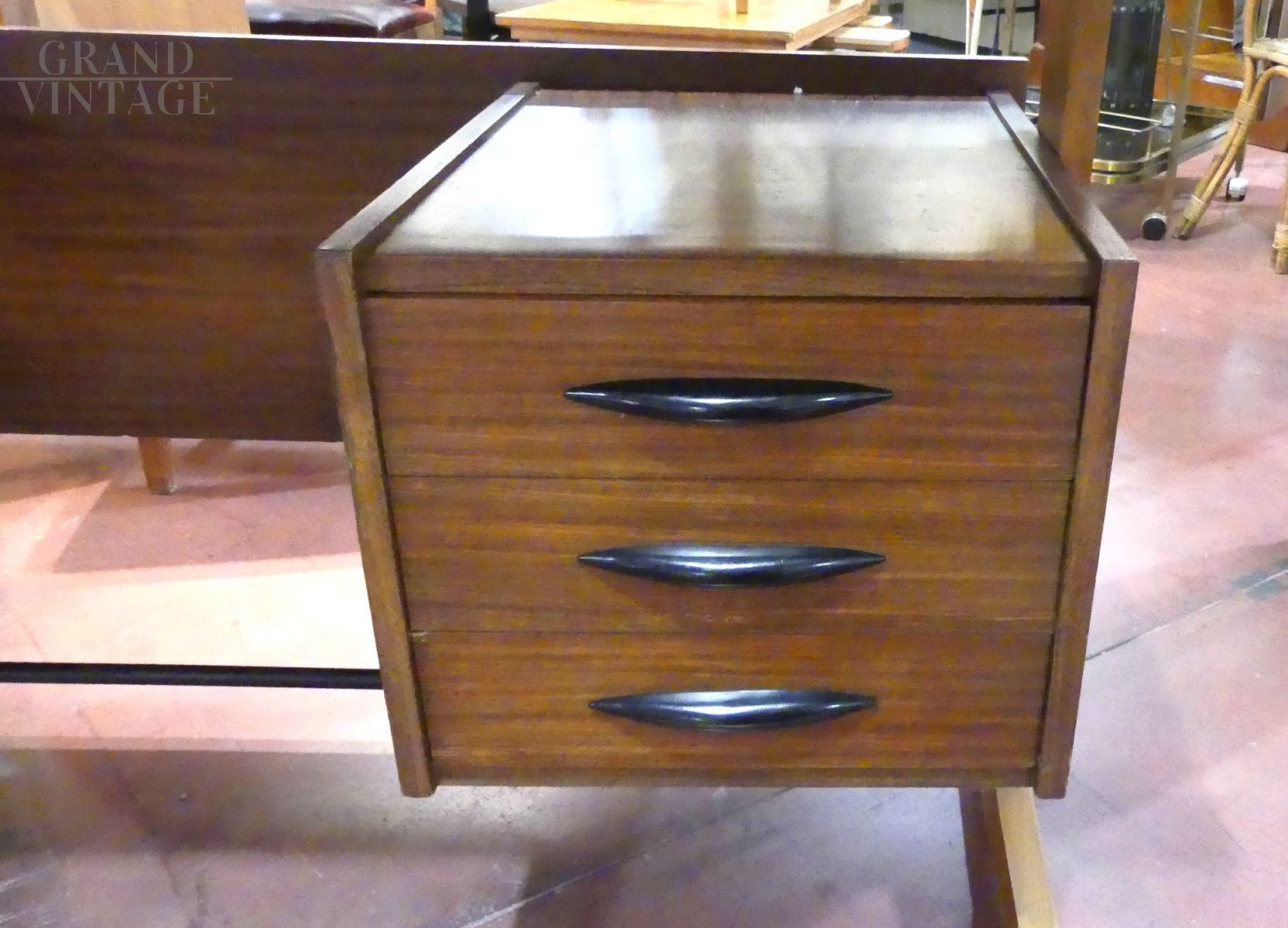 Vintage desk in teak wood, with double side drawers, iron footrest and adjustable brass feet.