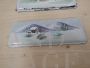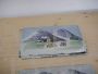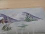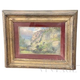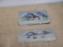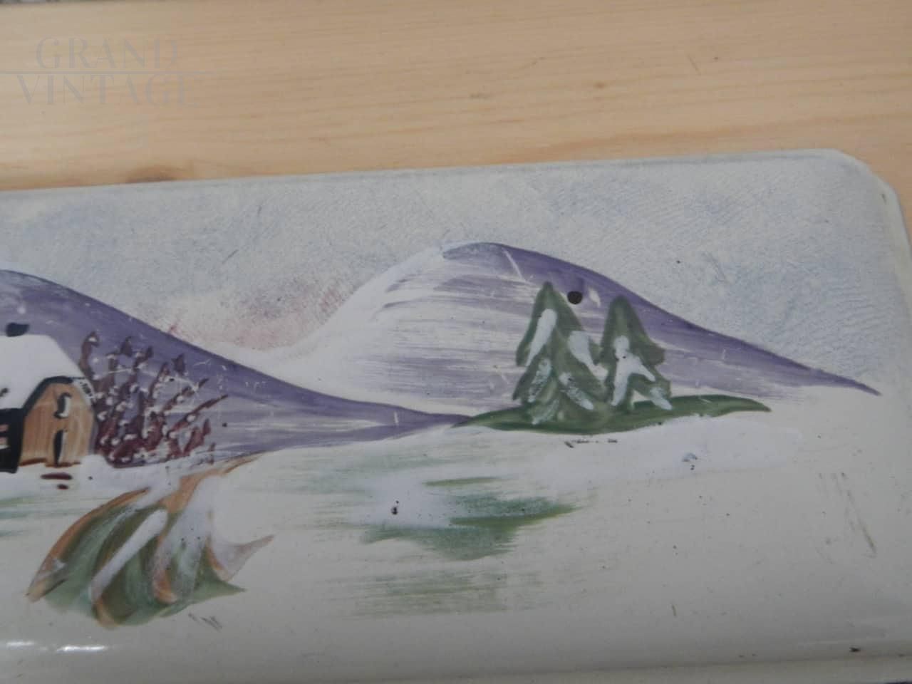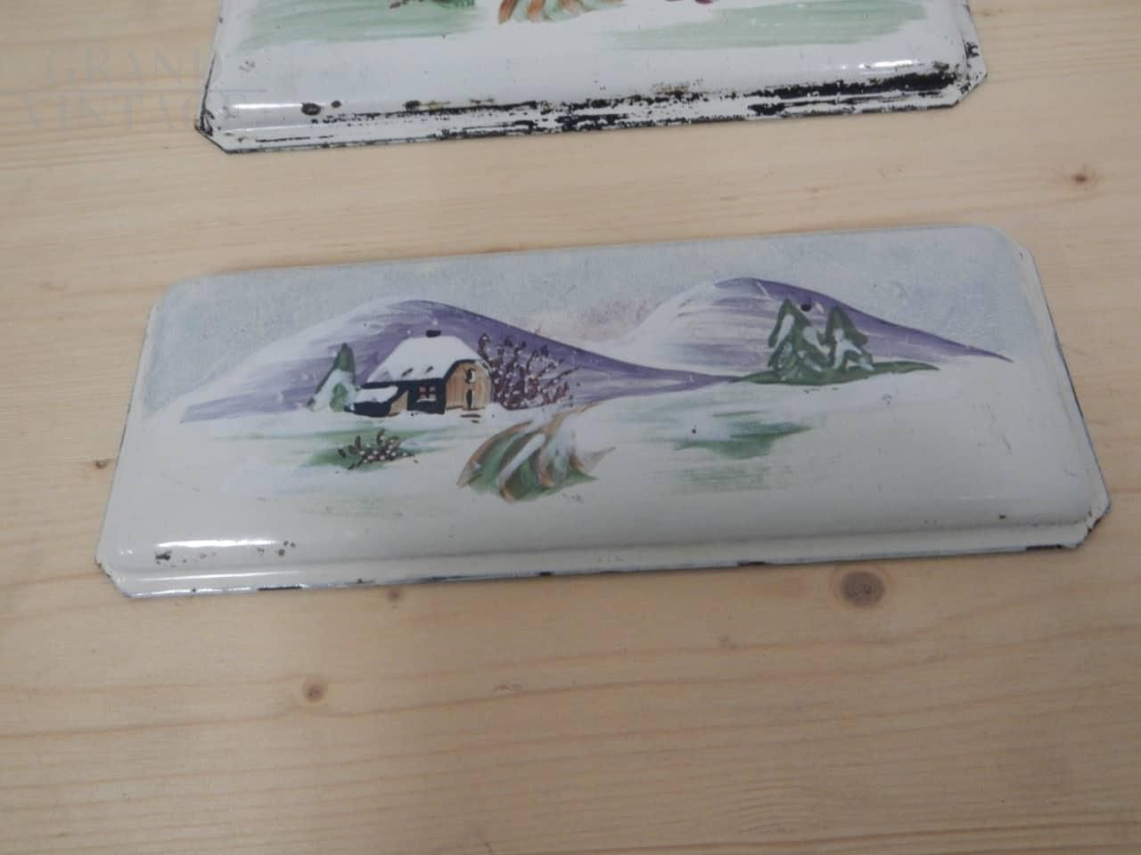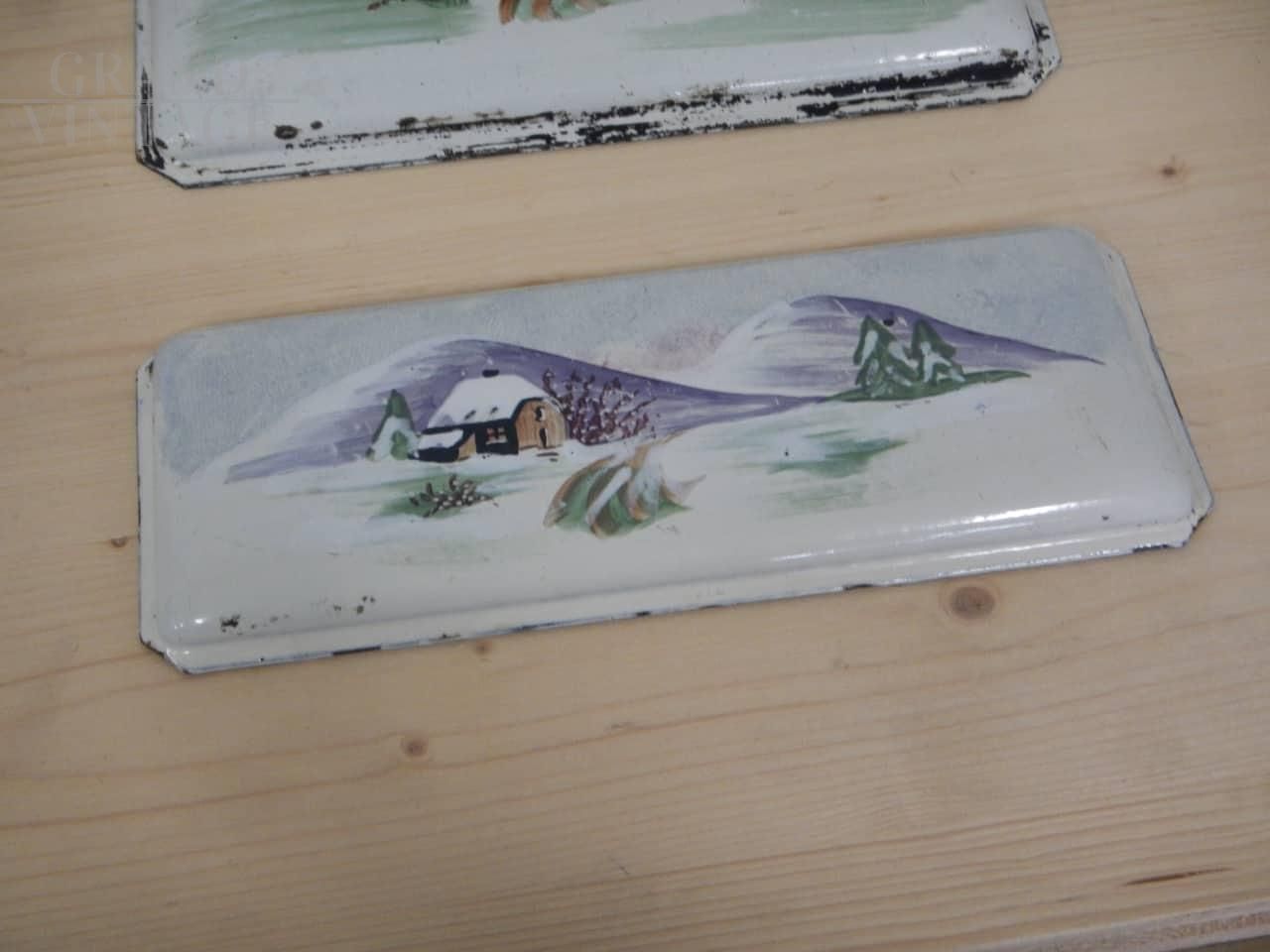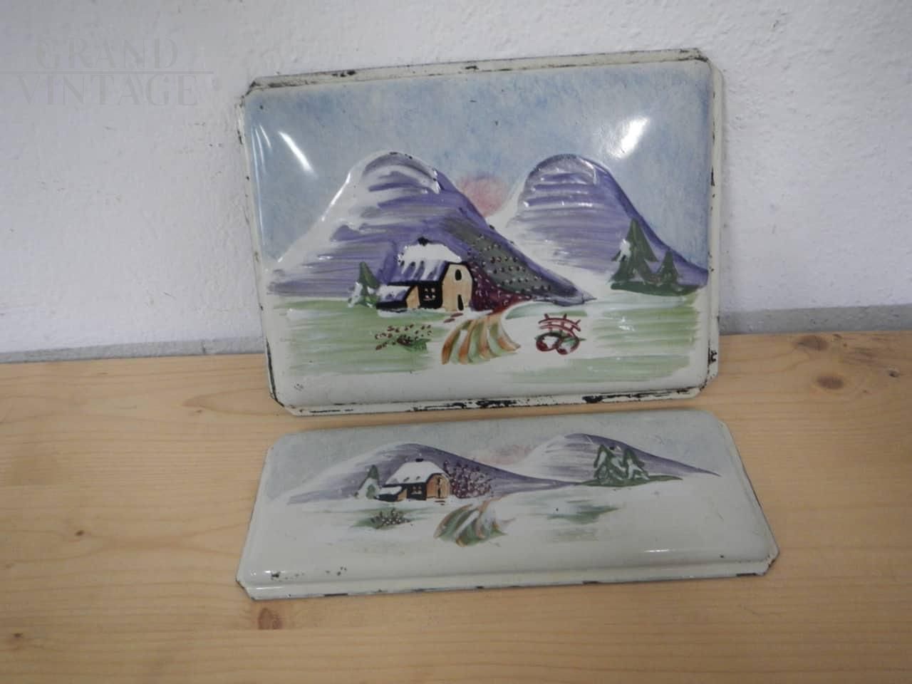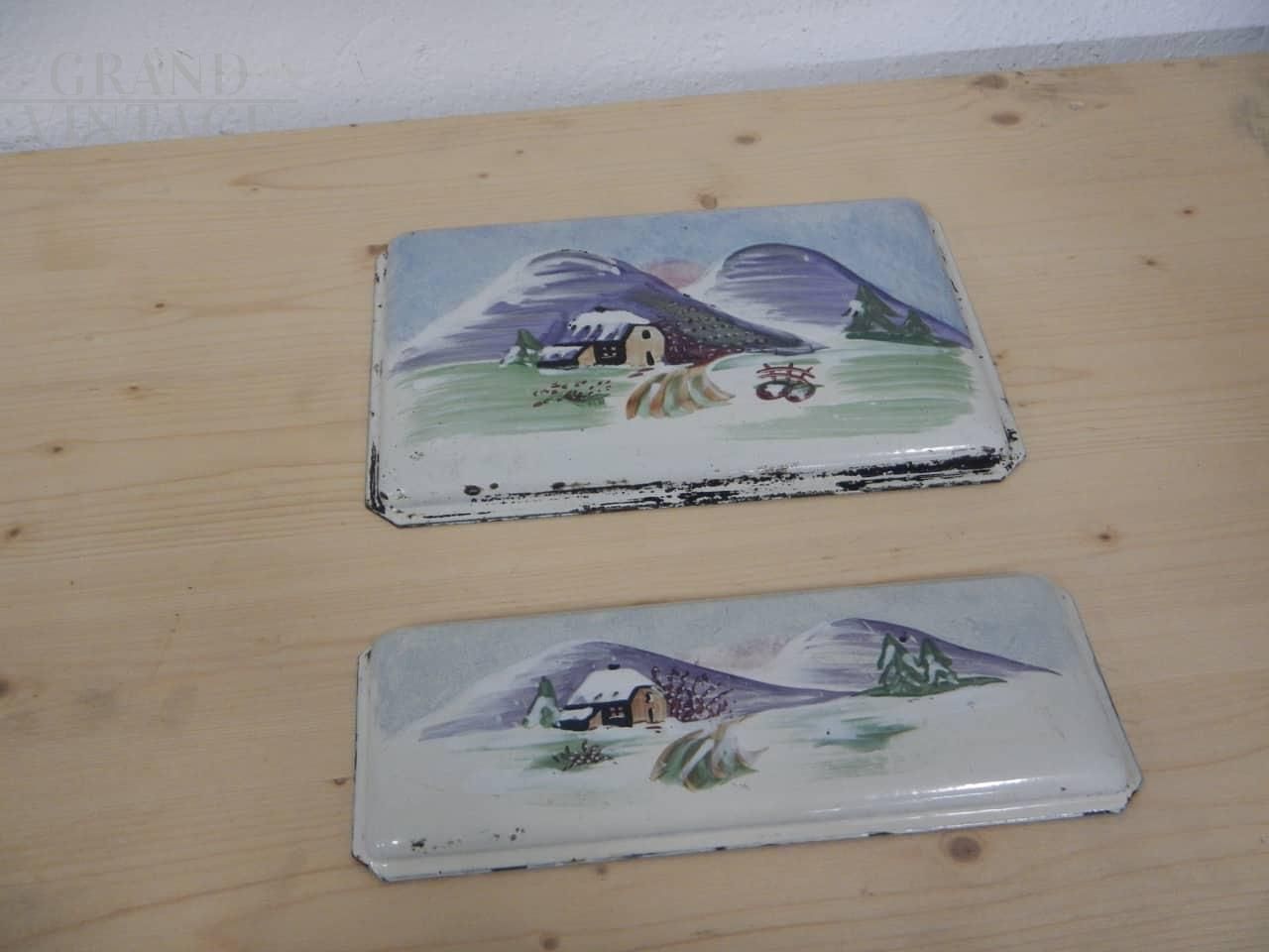 Pair of vintage metal plaques painted with mountain scenery, used as wood stove door trim. They have two different sizes: the largest measures 21 x 28 cm, the smallest measures 12 x 28 cm.