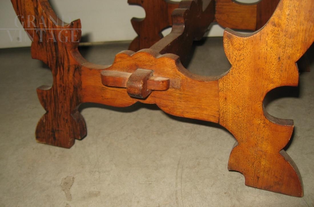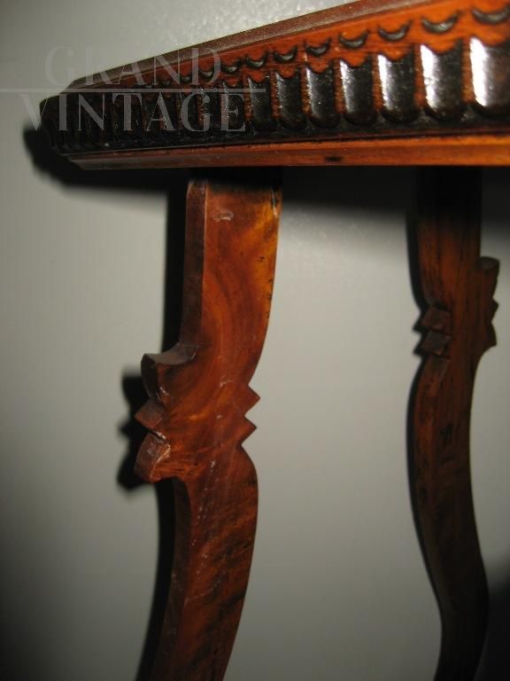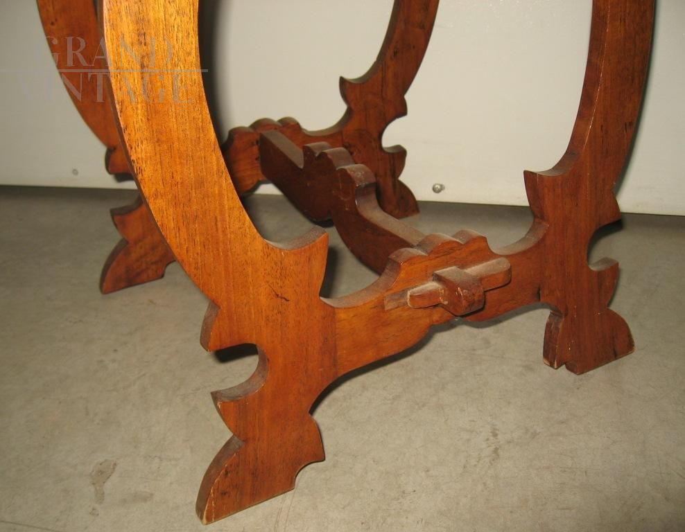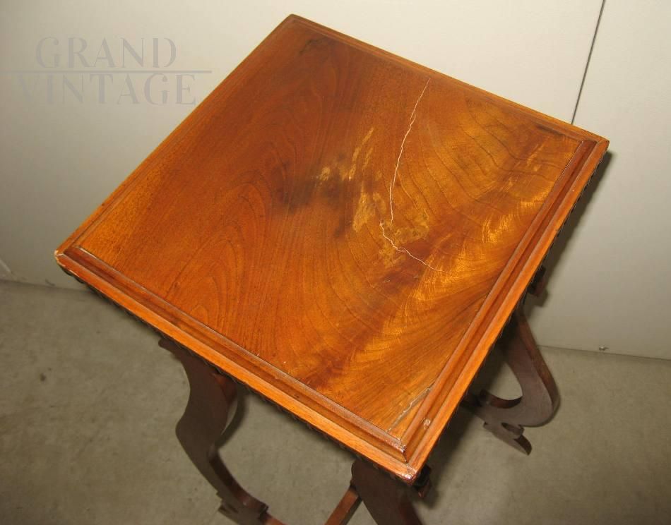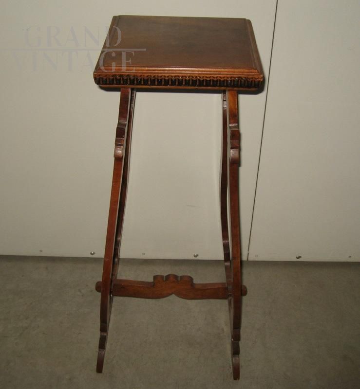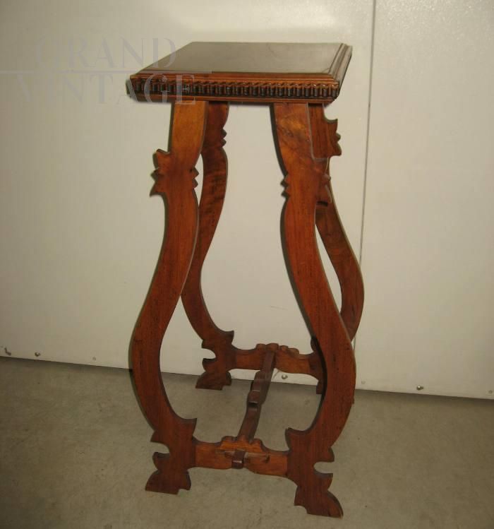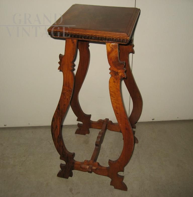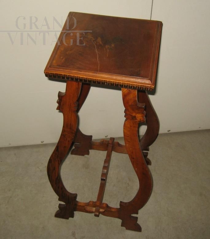 Vintage plant stand in solid walnut with lyre feet from the early 1900s, model with lyre legs connected to each other. Solid wood top measuring 27 x 27 cm.