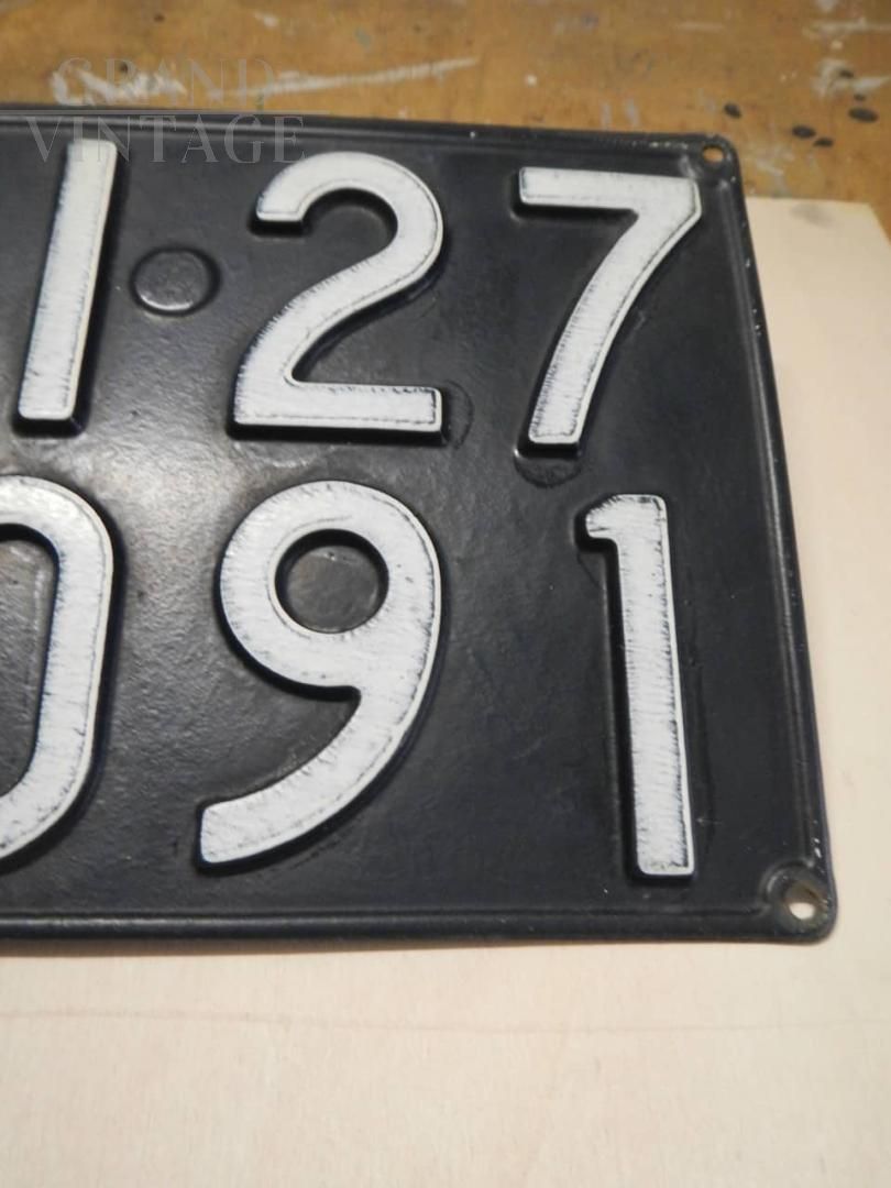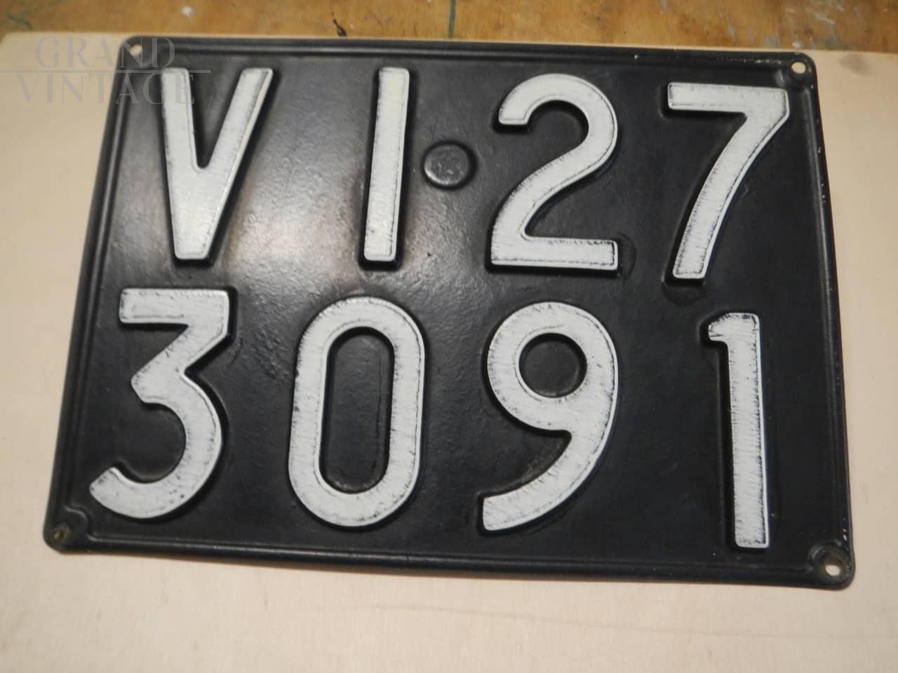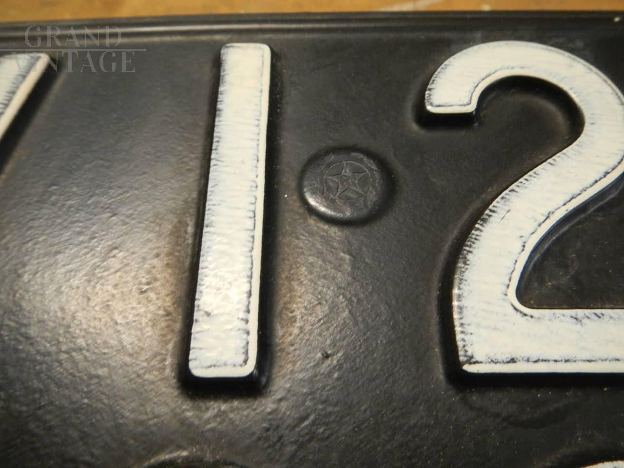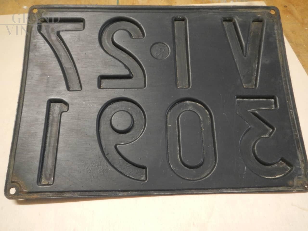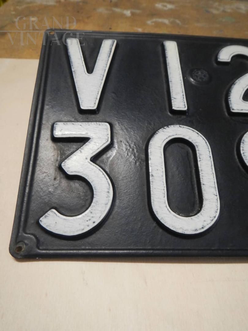 Vintage 1960s plastic car front license plate Vicenza VI27. The symbol of the Italian Republic appears, that is, a 5-pointed star inside a garland and with the letters RI in the center.