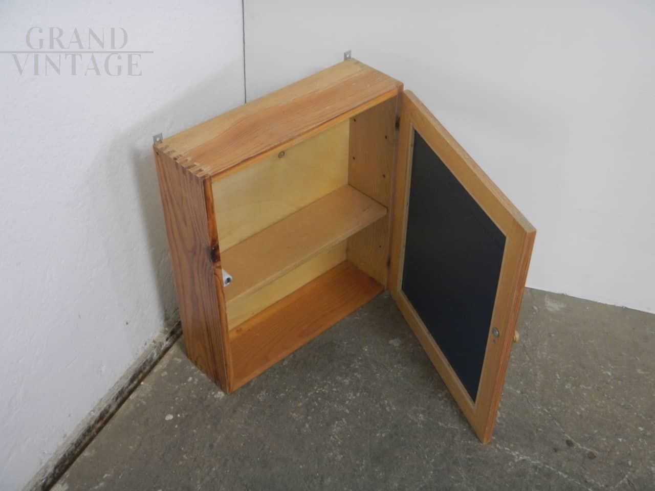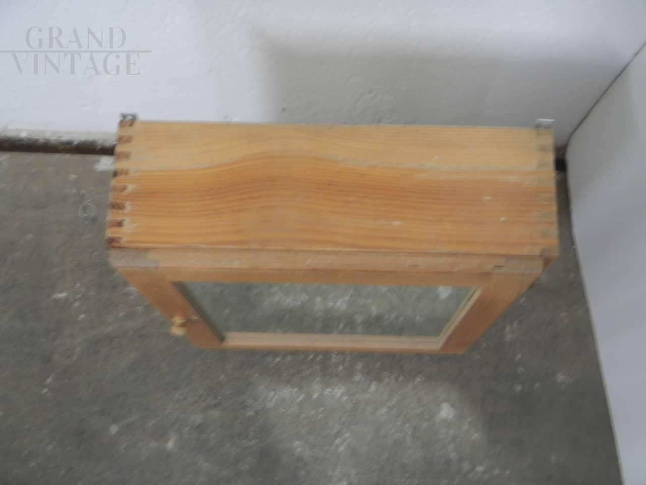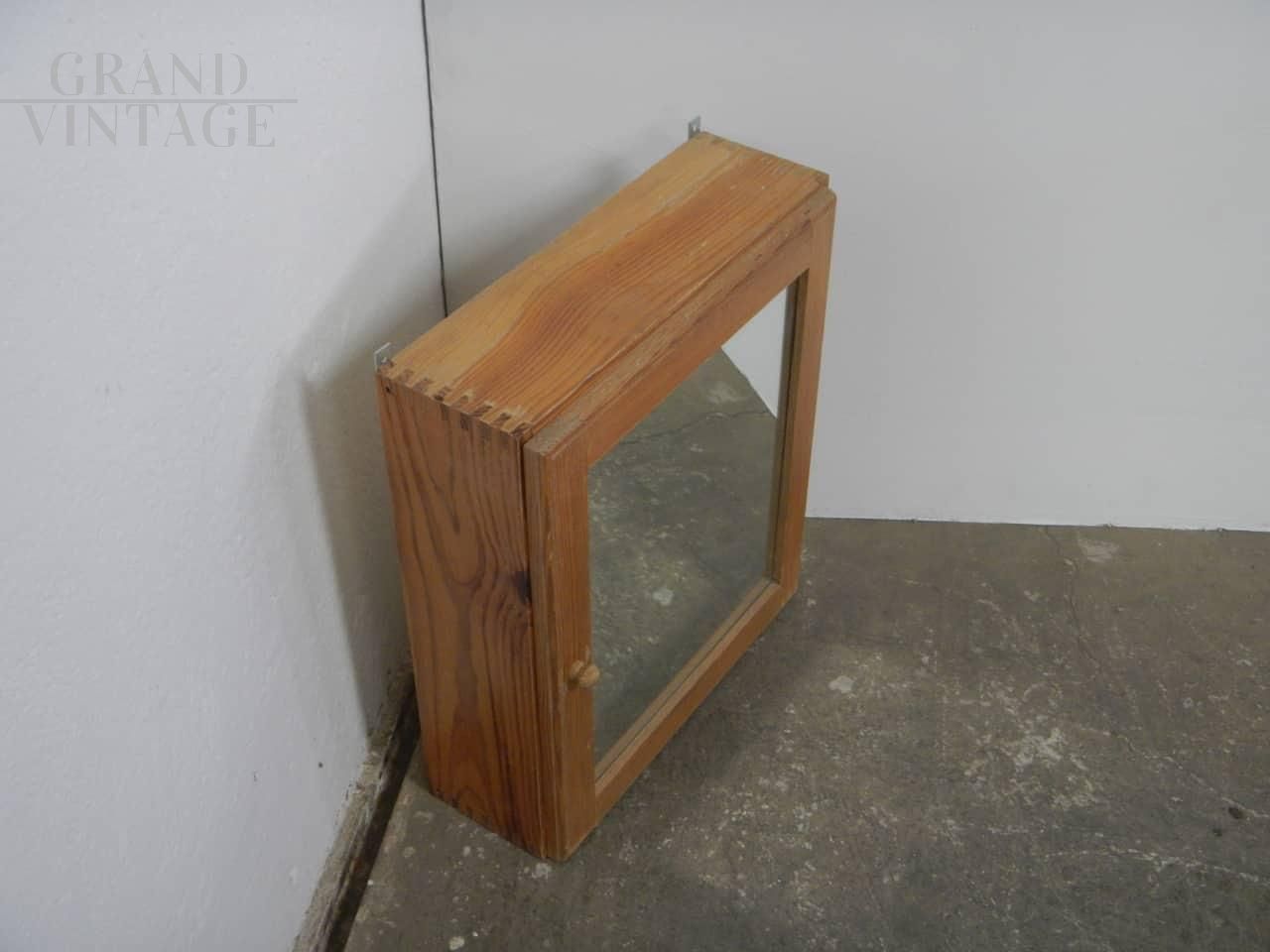 Vintage fir wood bathroom cabinet with mirrored door and internal shelf, perfect for a rustic decor.