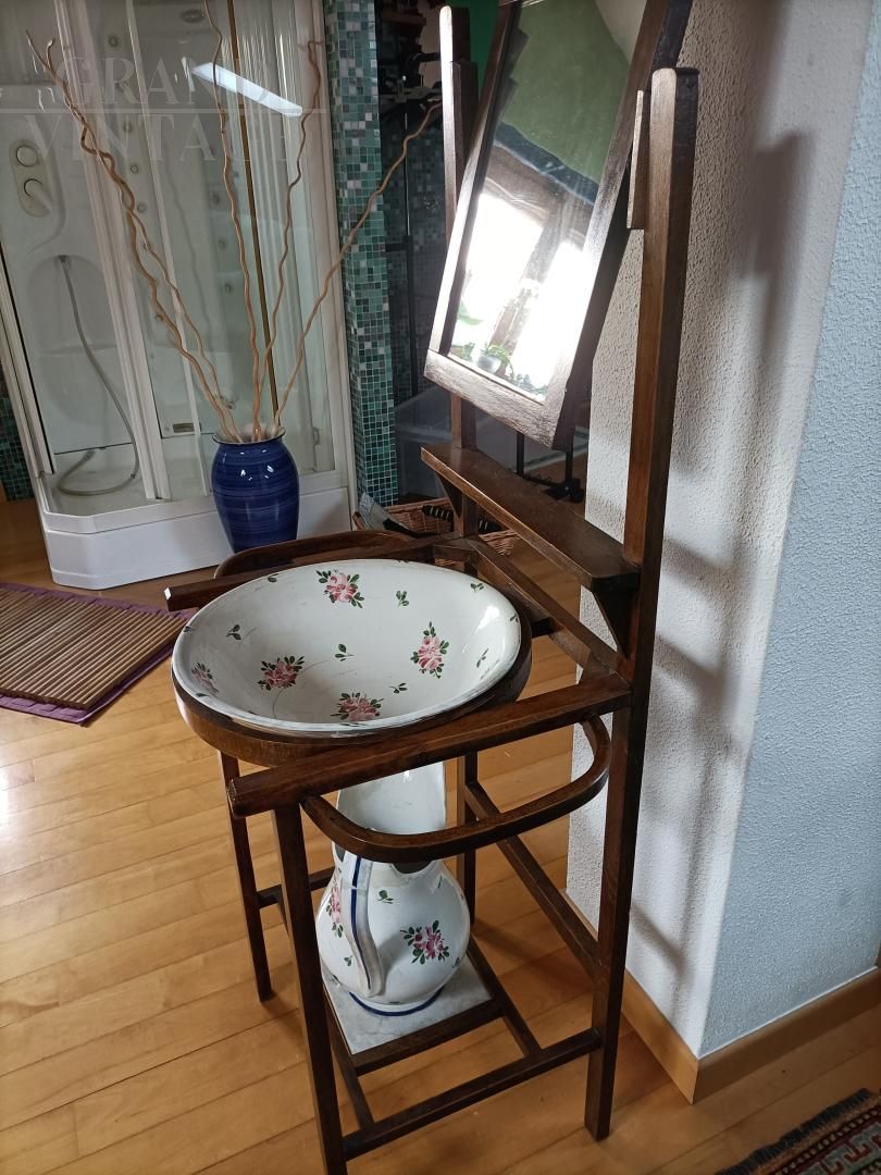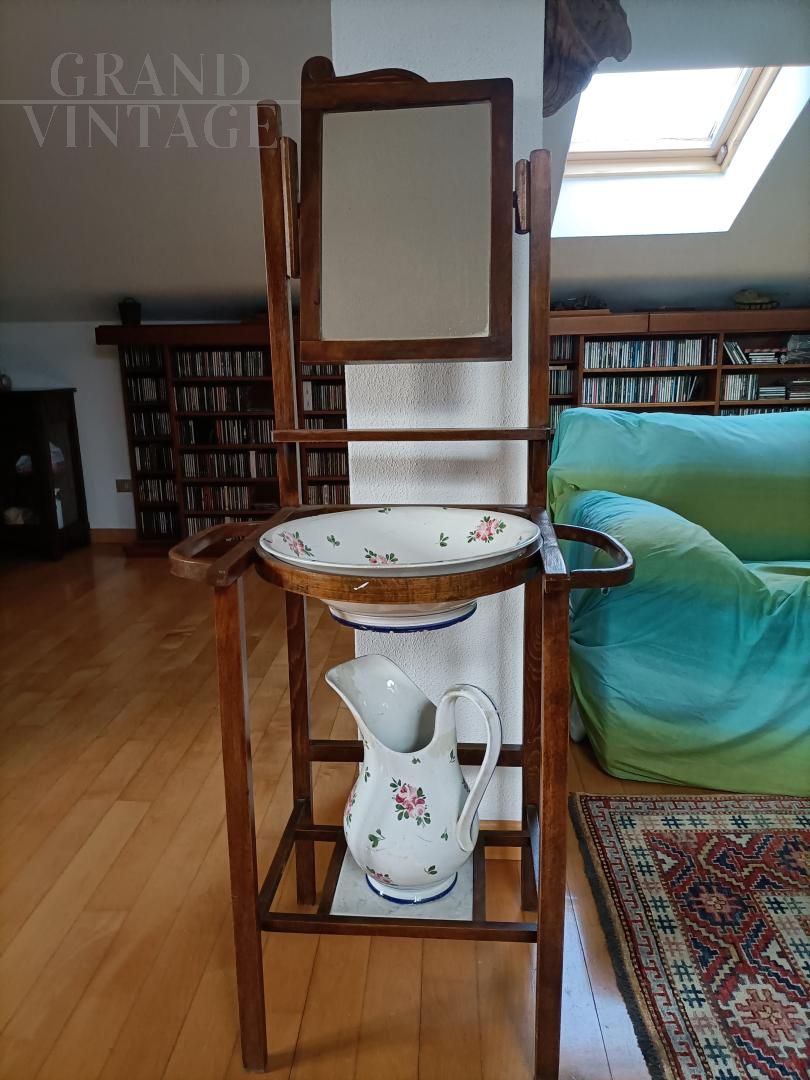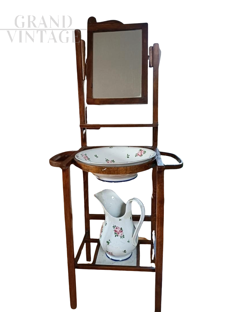 Vintage bedroom wooden wash stand set with original ceramic basin and jug, adjustable mirror and towel rail on both sides. The jug has visible defects, as shown in the photo, it was recovered and glued as it was broken, and it rests on a tile, the only recent and non-original piece. An elegant and original piece to decorate a bedroom or bathroom.