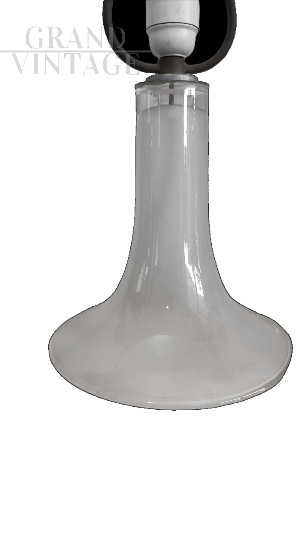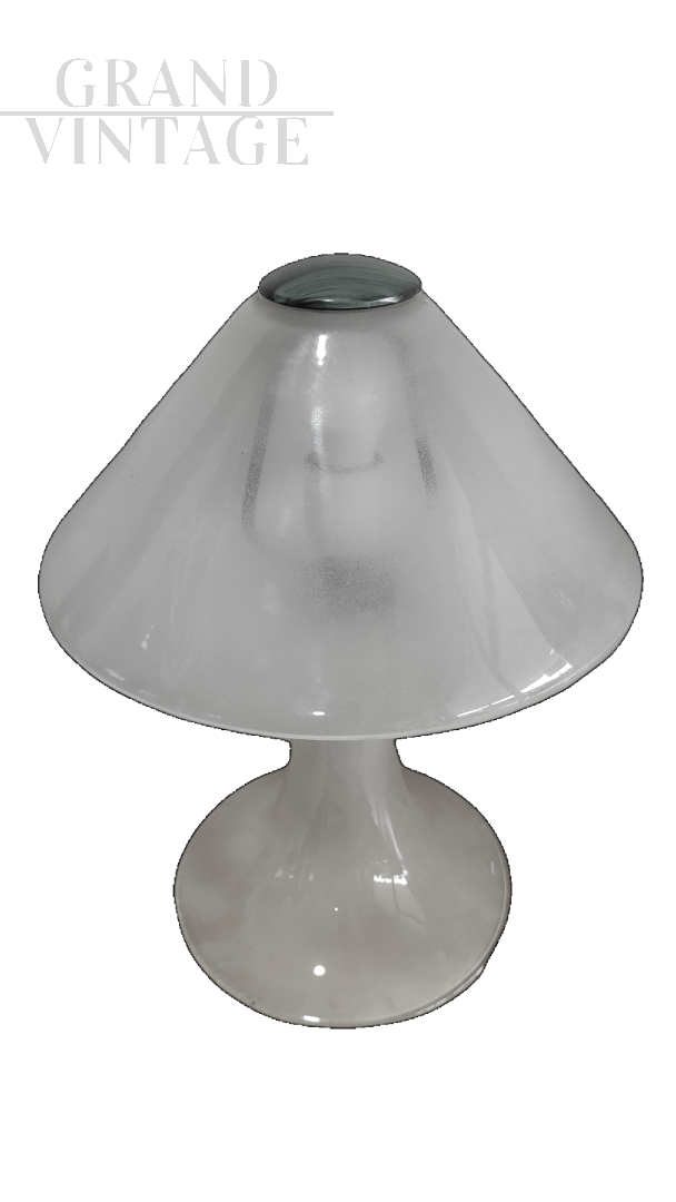 Vintage white glass mushroom table lamp, in good condition, works with European plug. A design object made from two elements. The particular shape of the lampshade creates a beautiful diffused light, and its captivating shape gives that extra touch that decorates every corner, every modern or classic environment.