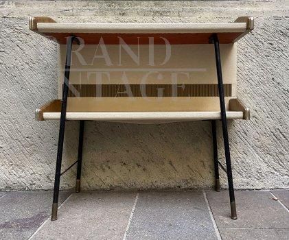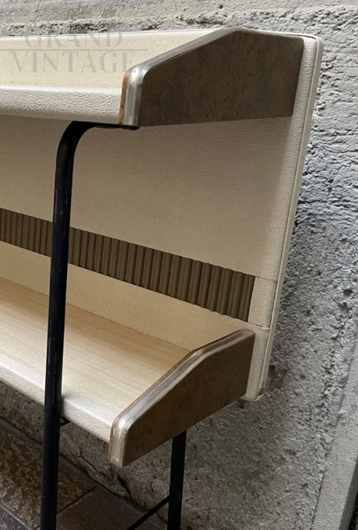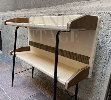 Particular vintage console with two wooden shelves in natural and white shades, the uprights are in black lacquered metal. Italian mid-century modern design from the 1960s.