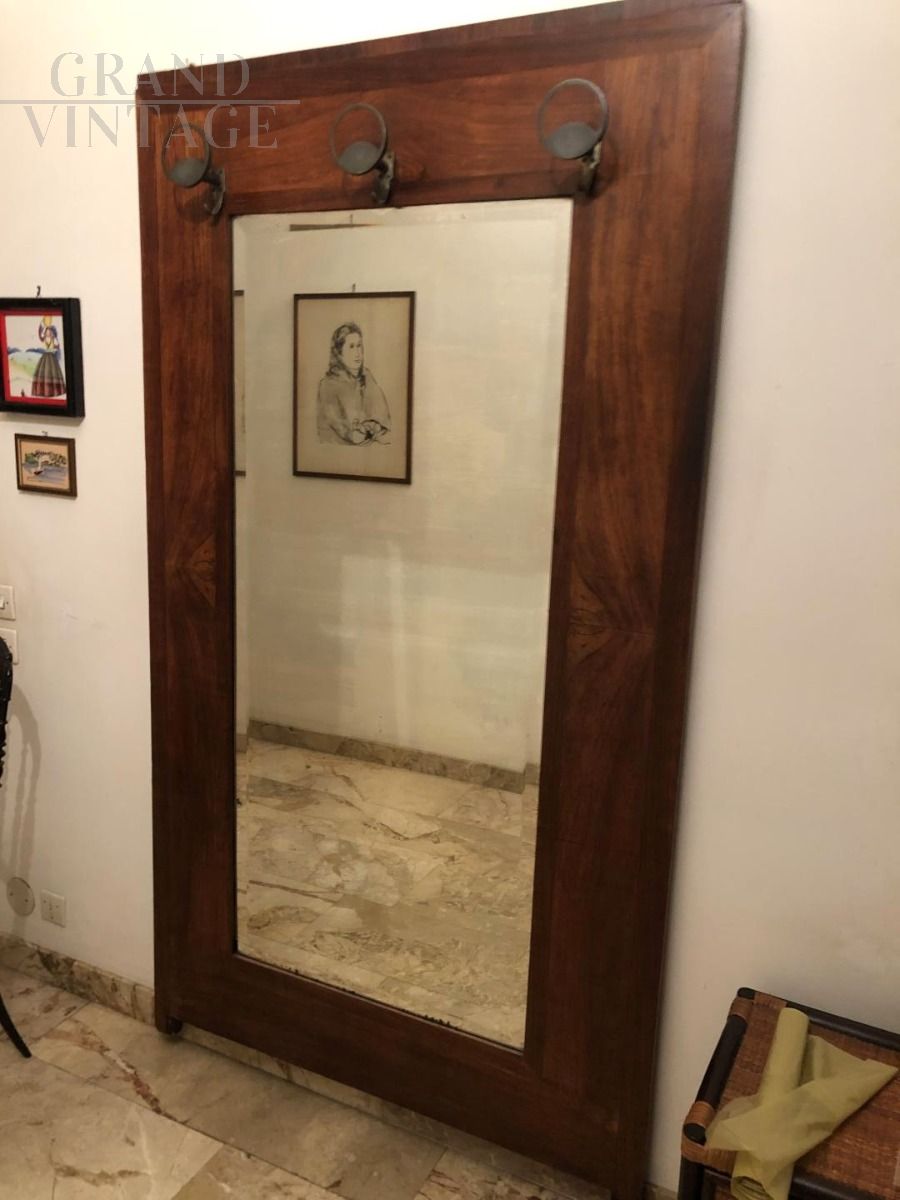 Large rustic walnut hallway wall coat rack with full-length mirror with bevelled edges, complete with 3 coat hooks, Italy 1950s. Very well maintained, the mirror is perfect.
