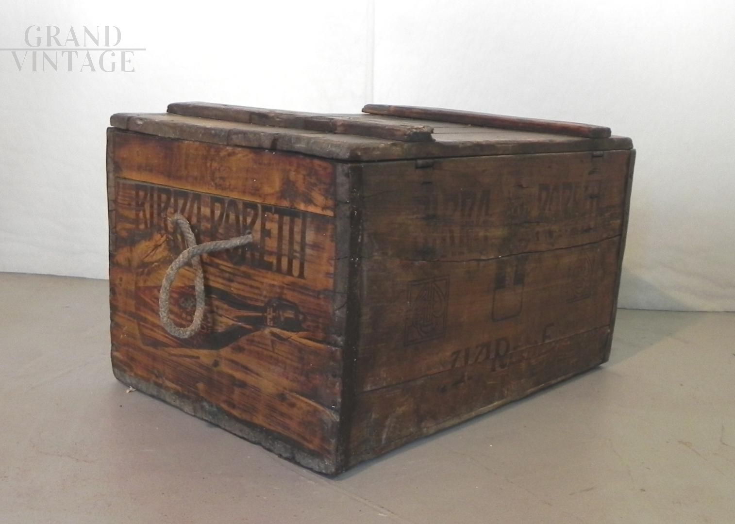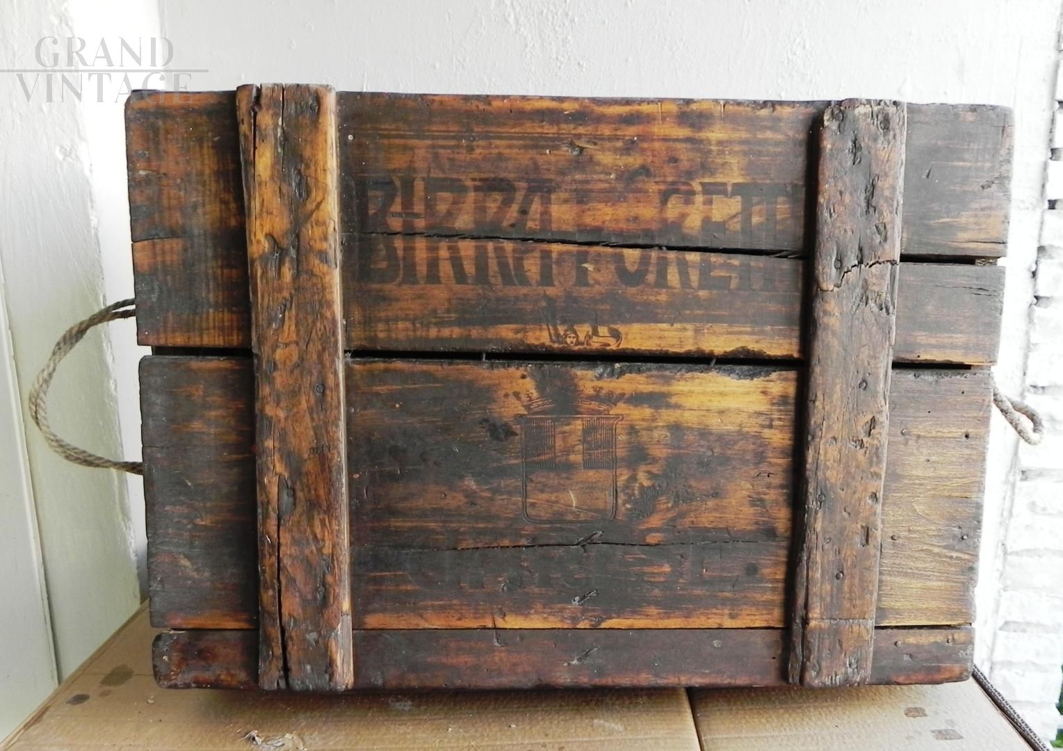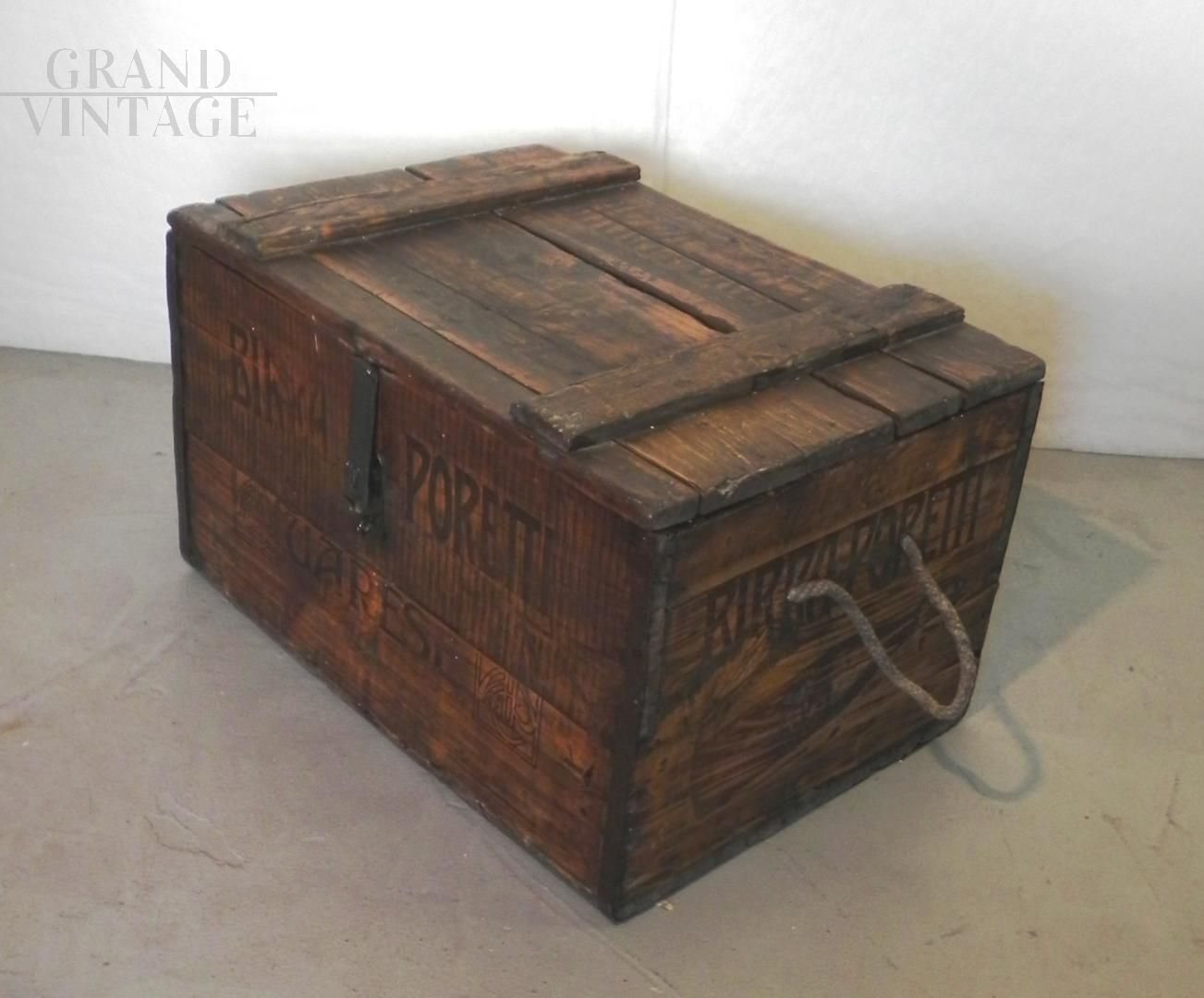 Rare vintage wooden crate chest trunk for beer bottles, with Birra Poretti Varese brand, 1912, made of solid oak wood by Segheria Casalpusterlengo, of which it bears the logo on one side together with the date and the Jugendstil logos typical of the time. The trunk probably had a spaced bottom inside for housing the bottles. All original, except for a rope handle. The object has been restored, cleaned and rubbed with straw-colored oil. The metal parts have been finished with a specific anti-rust product. There are signs of woodworm dating back to before the recently carried out anti-woodworm treatment. Structurally the trunk is robust and usable, and is suitable for being closed with a padlock, not supplied.