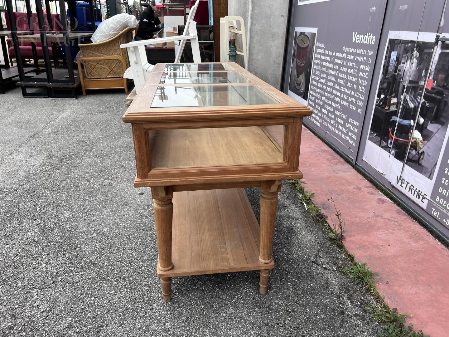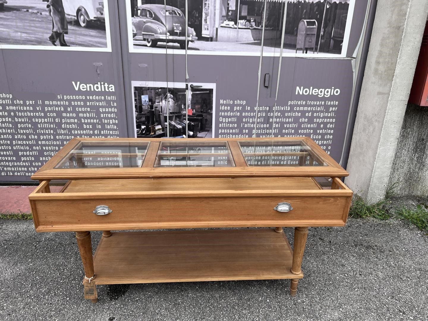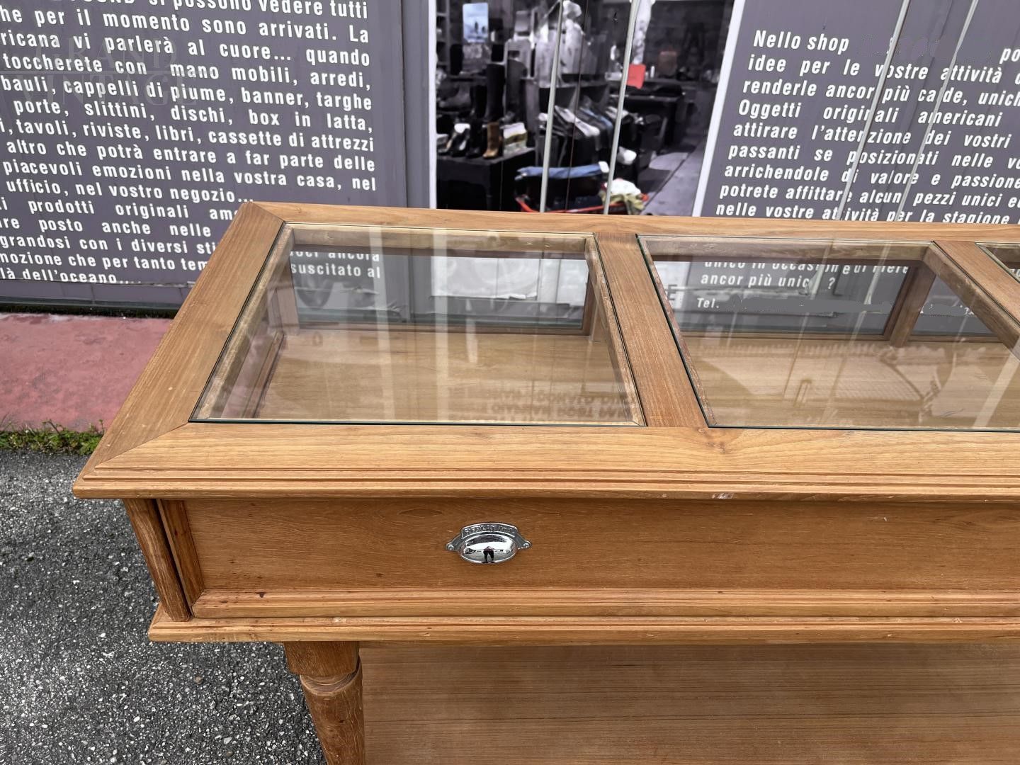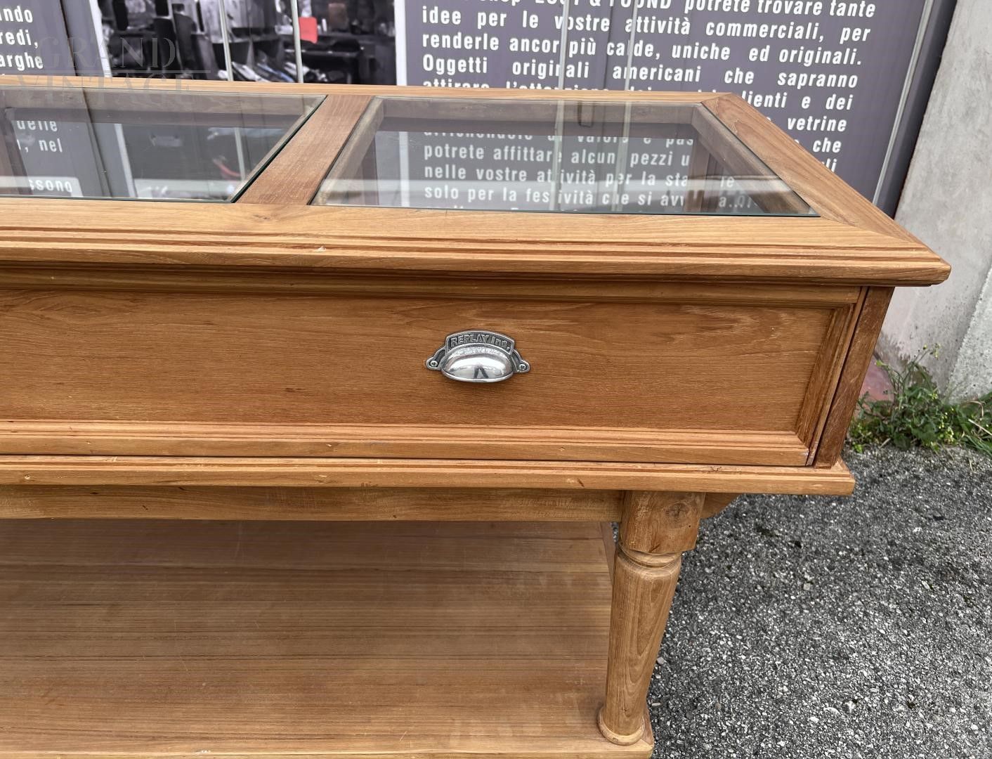Vintage shop counter in light wood with glass showcase top, large chest of drawers and shelf below. Aluminum handles customized with the Replay logo.