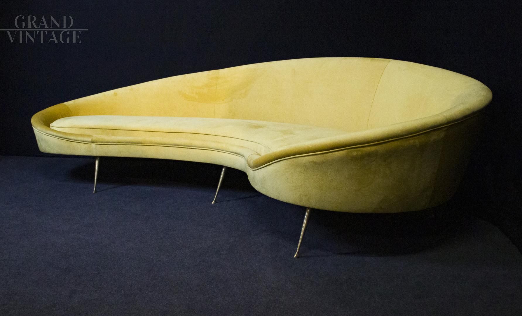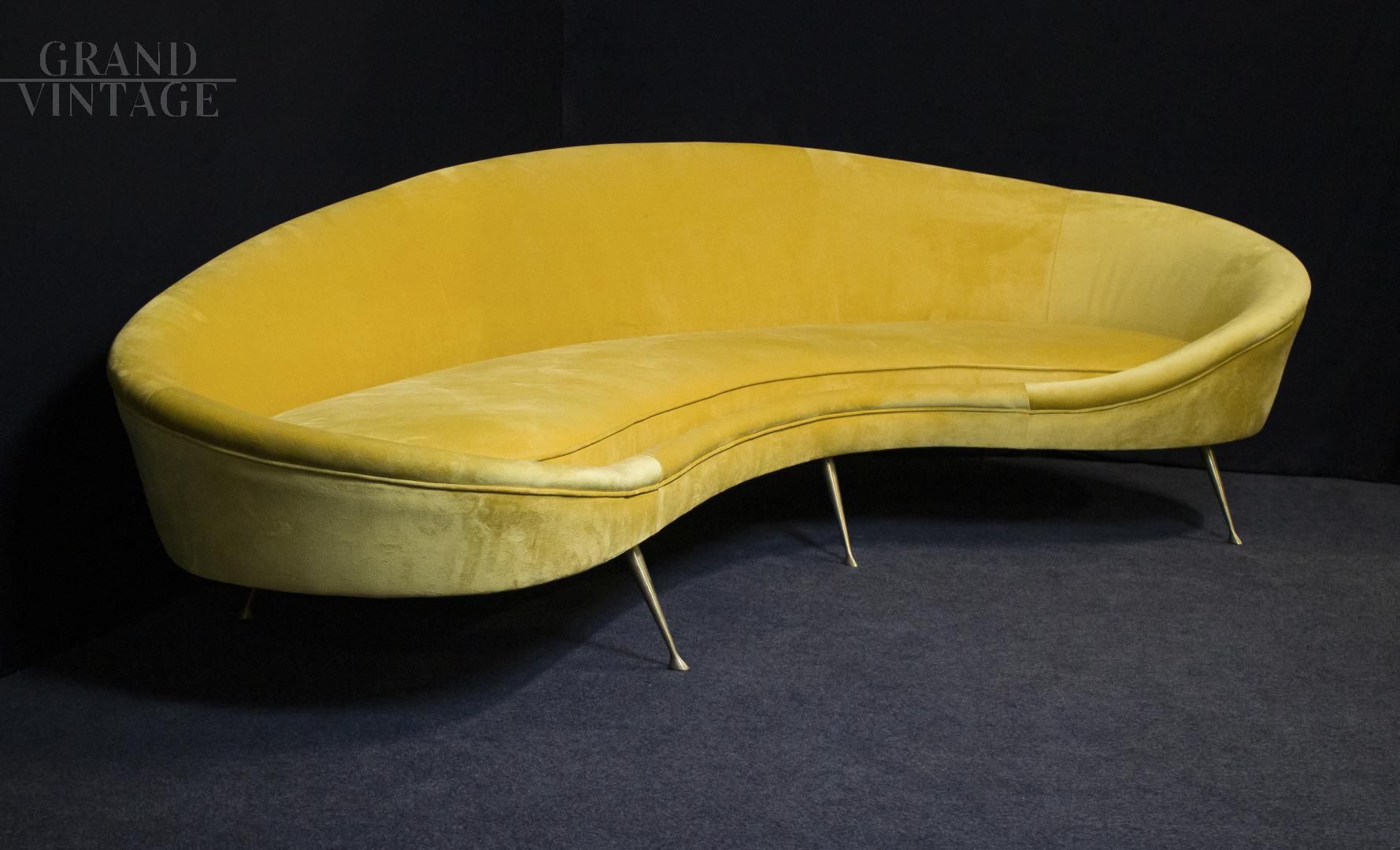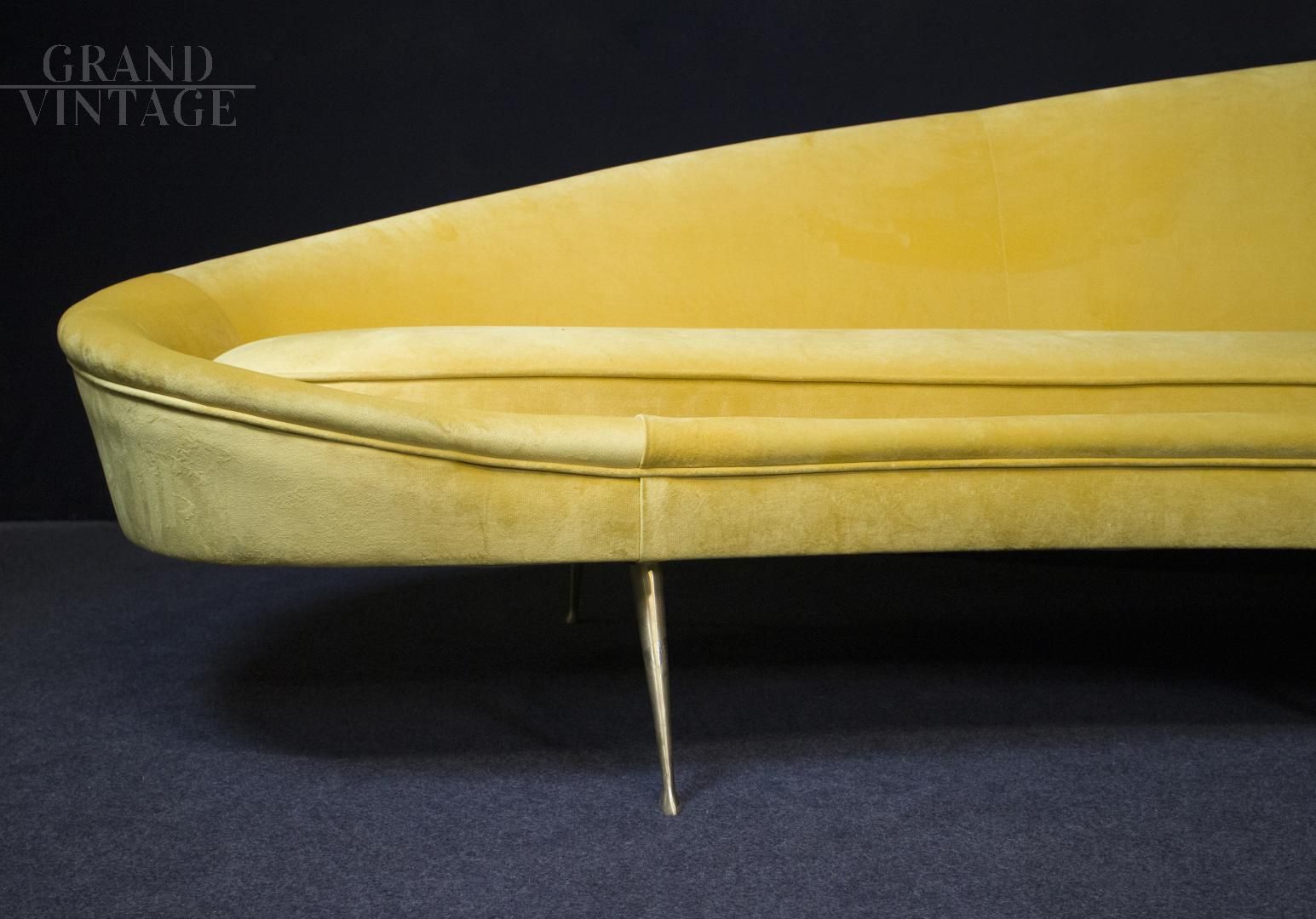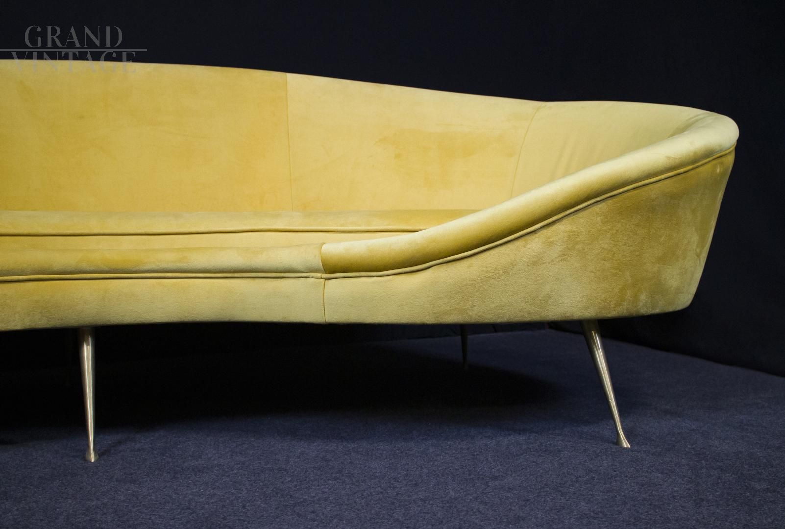 Vintage sofa with a beautiful shaped line, padded and upholstered in mustard / yellow fabric, with golden brass feet.